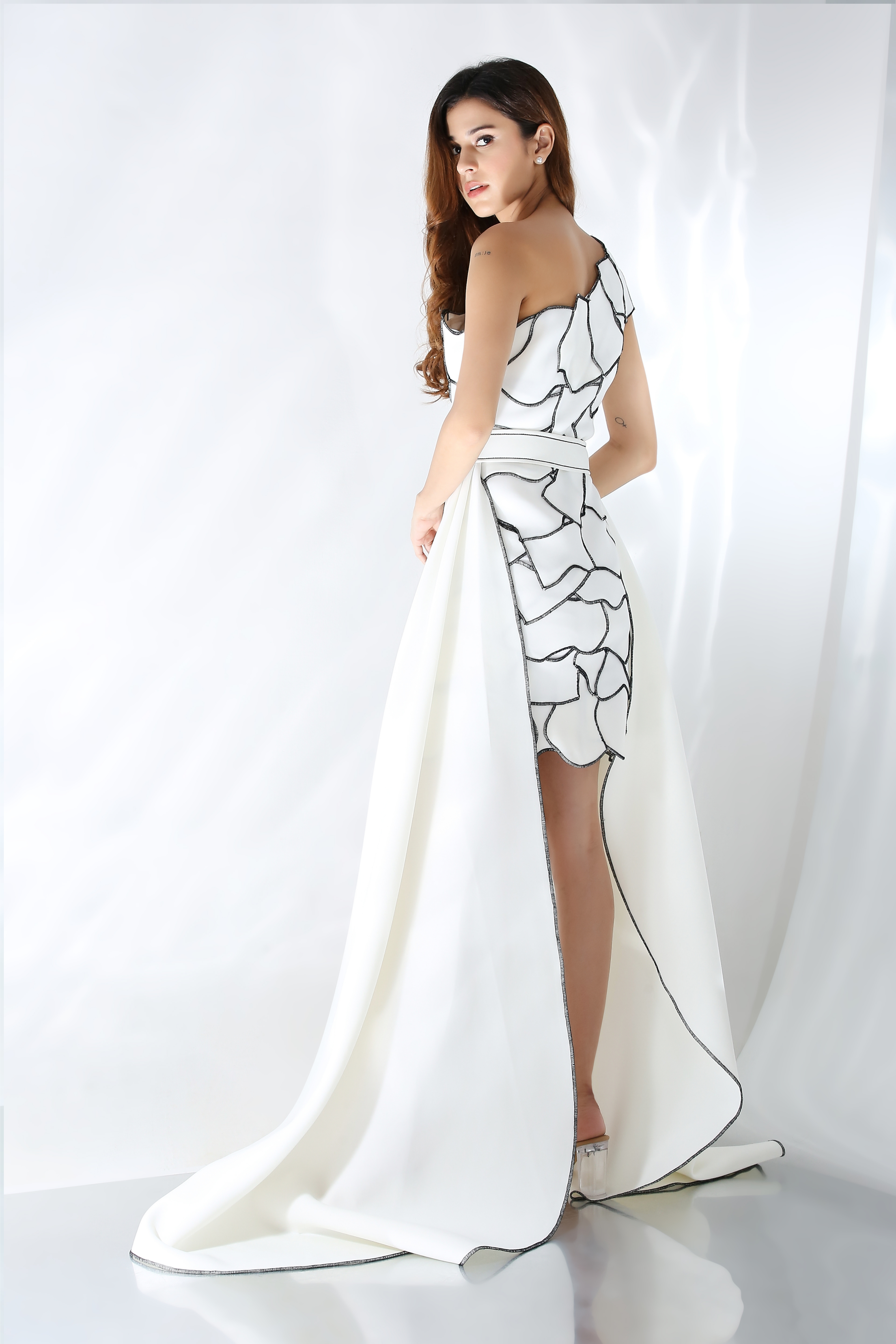 Featuring a fitted, intricate dress with asymmetrical patches sewn together all over. Wear it in two ways,