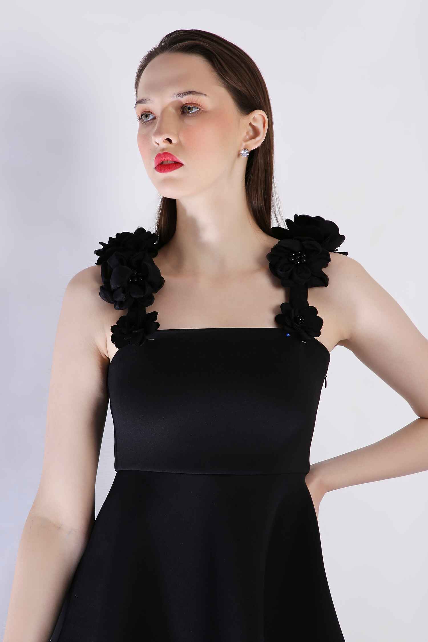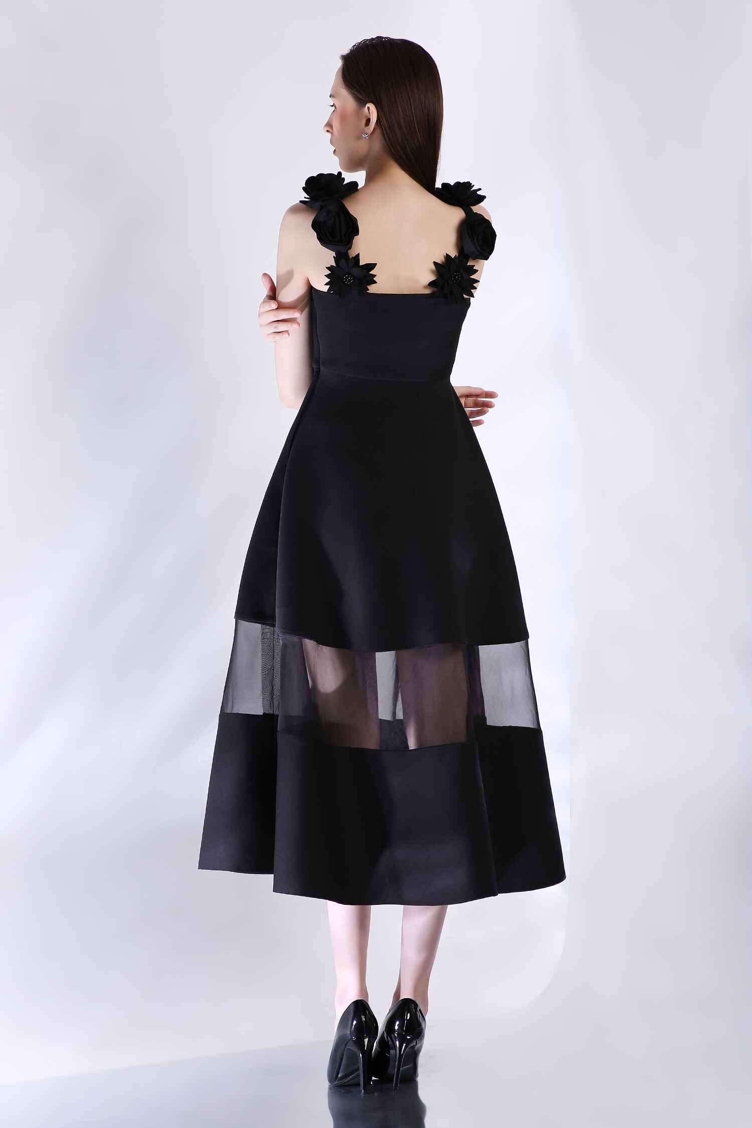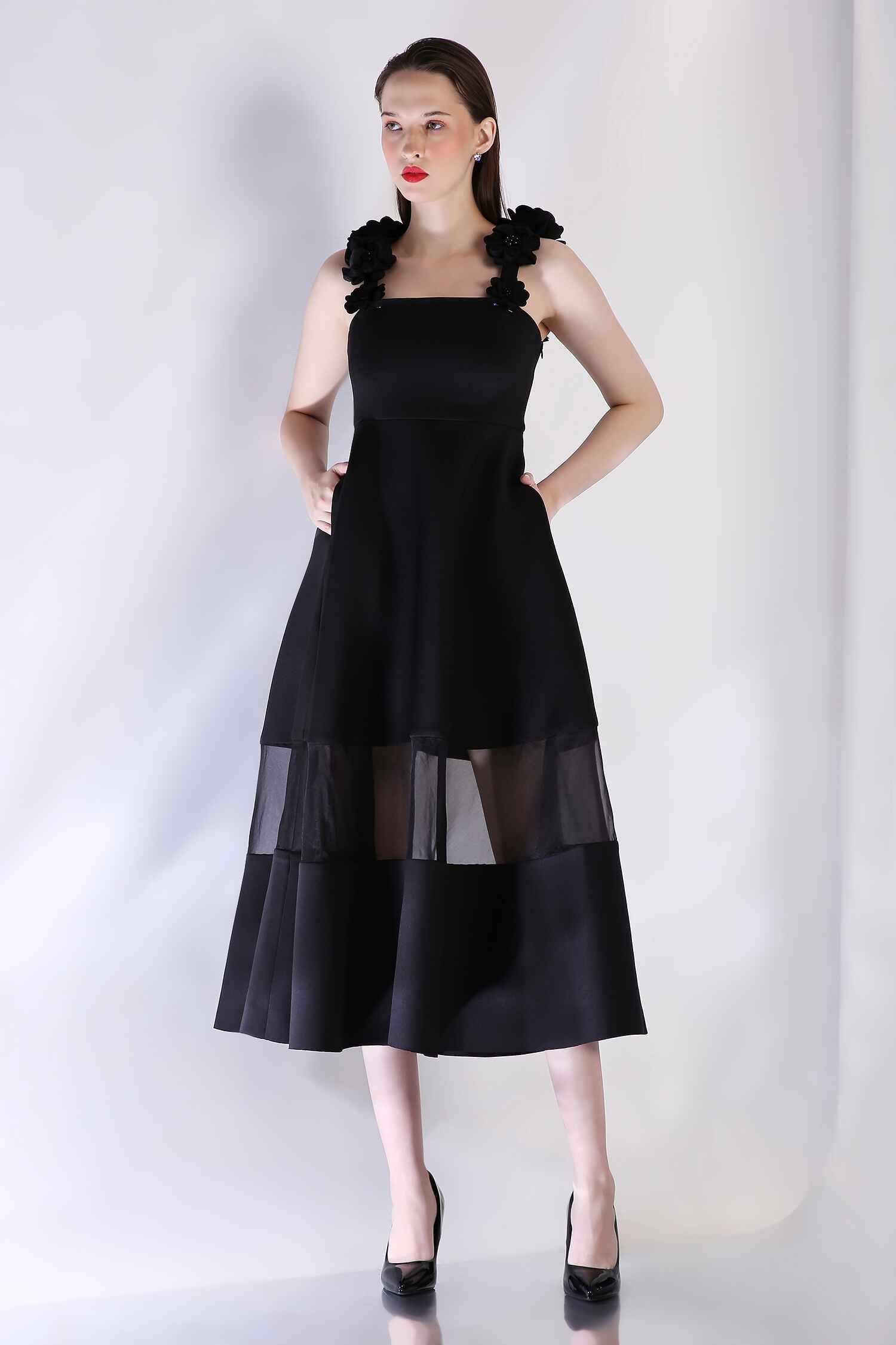 Detachable 3D floral straps add versatility, while a sheer panel at the hem lends a captivating touch to this sophisticated silhouette—perfect for any occasion that celebrates style and refinement.