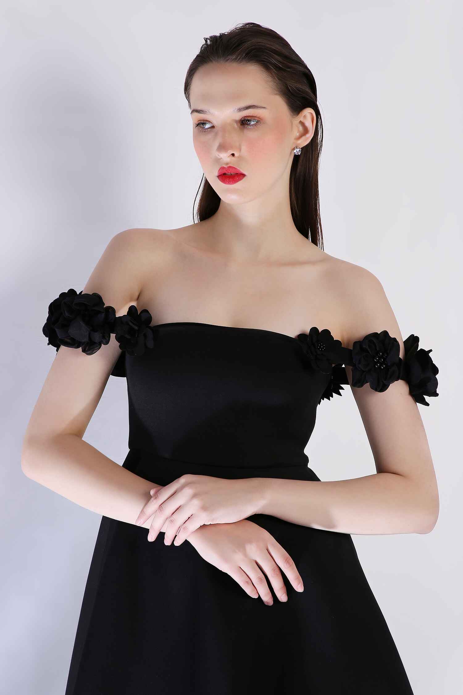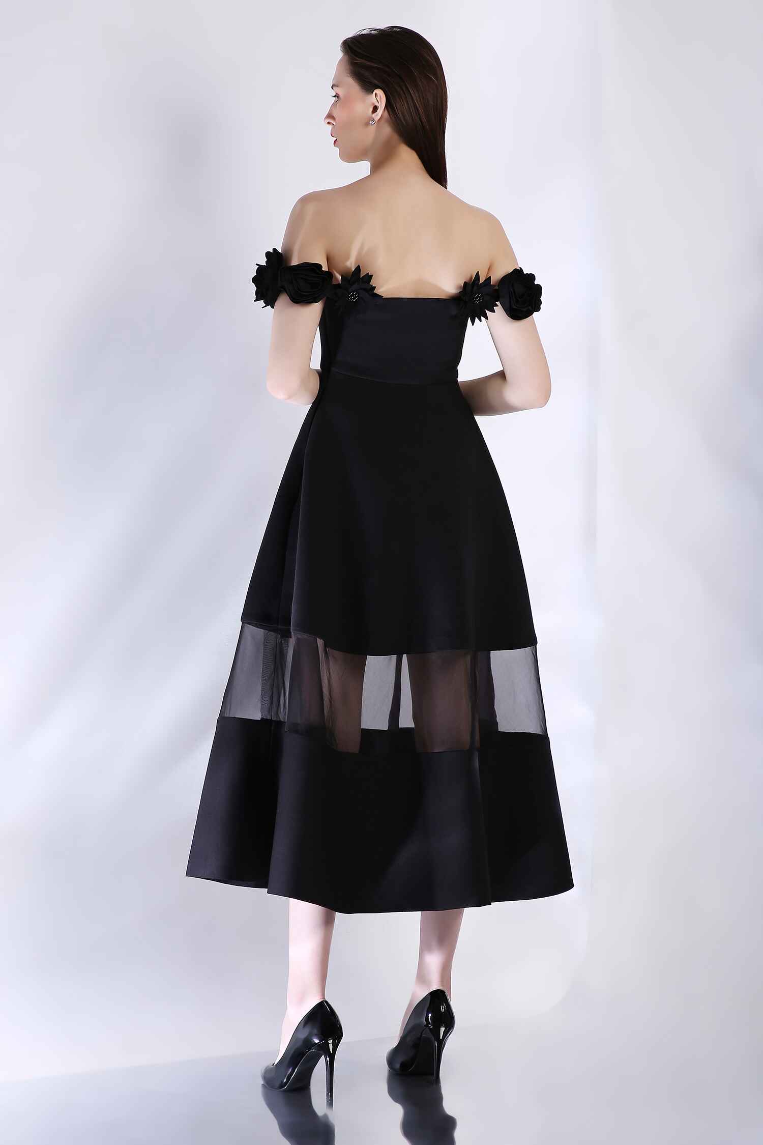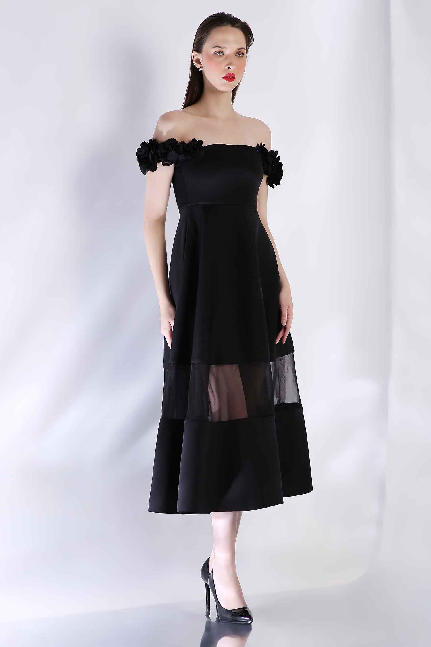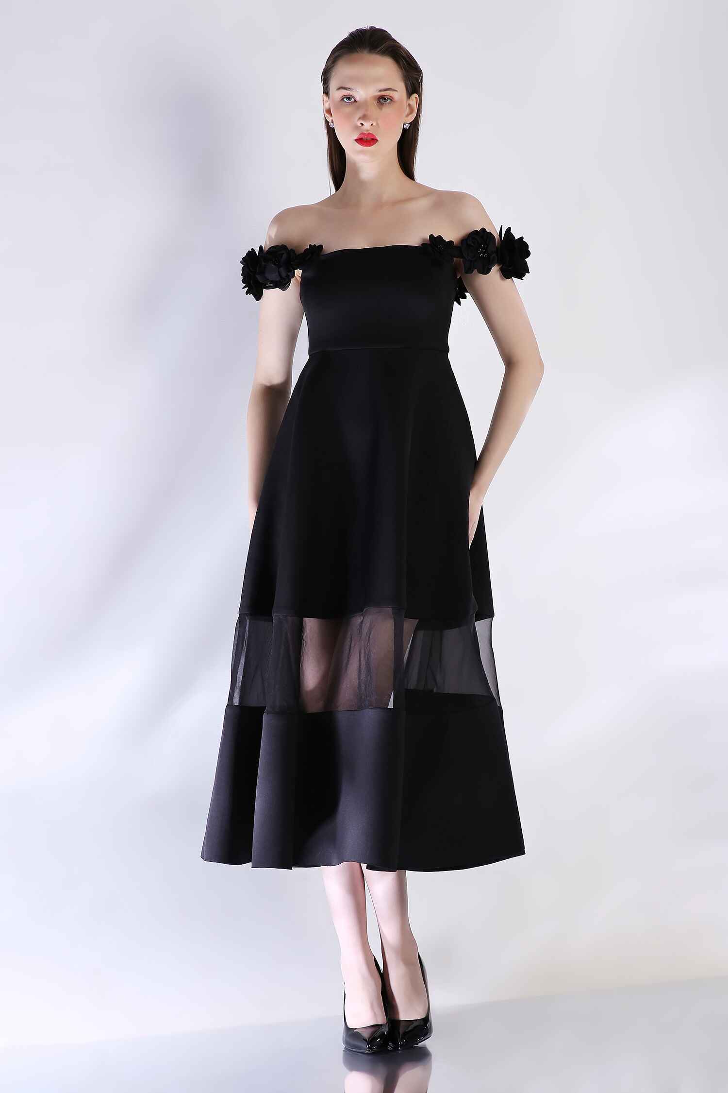 Detachable 3D floral straps add versatility, while a sheer panel at the hem lends a captivating touch to this sophisticated silhouette—perfect for any occasion that celebrates style and refinement.