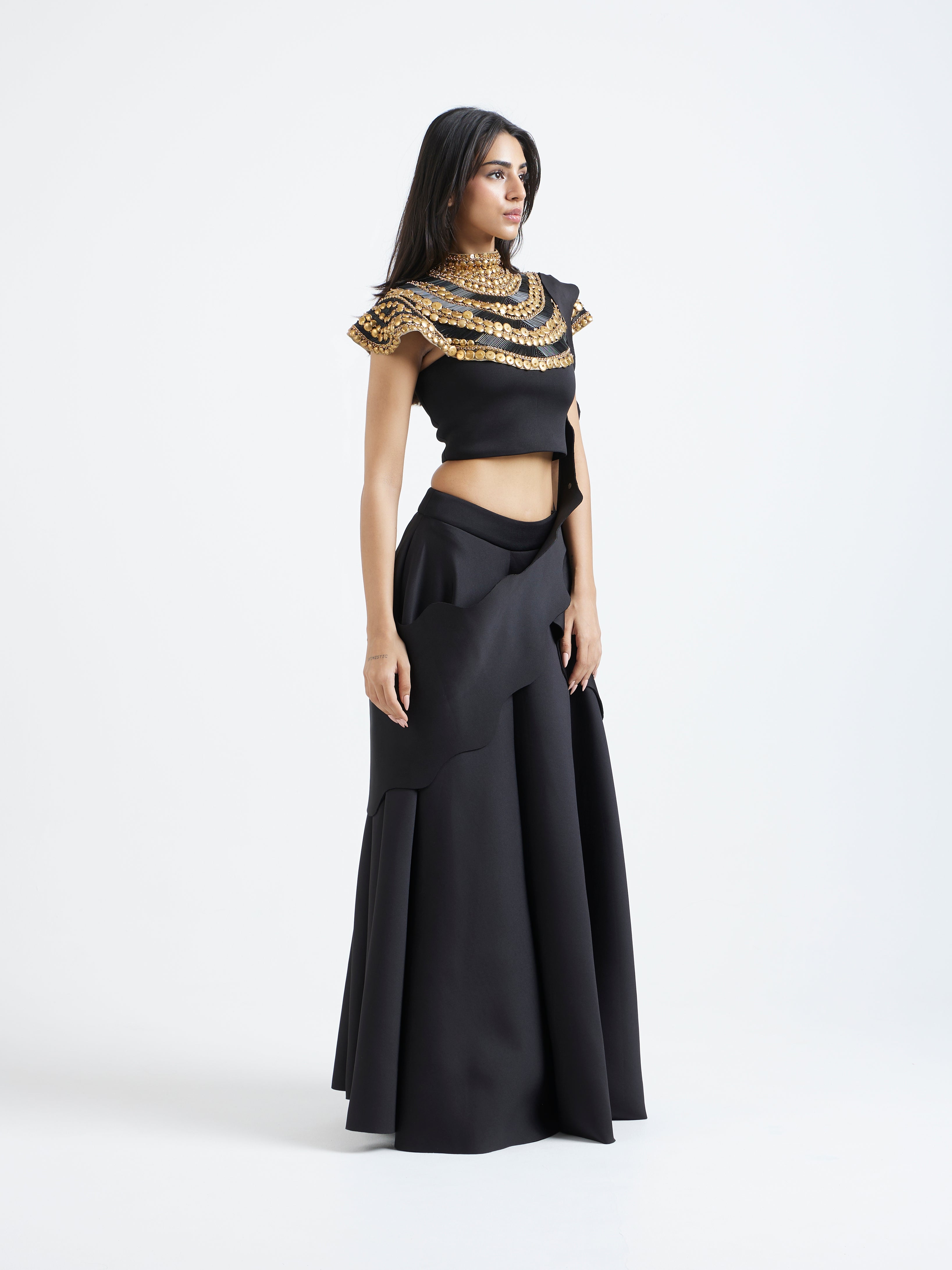 The silhouette features a simple crop, panelled lehenga that gives a structured fall and a fluid, wave-cut dupatta that moves with sculptural precision, creating a striking interplay of movement and form.