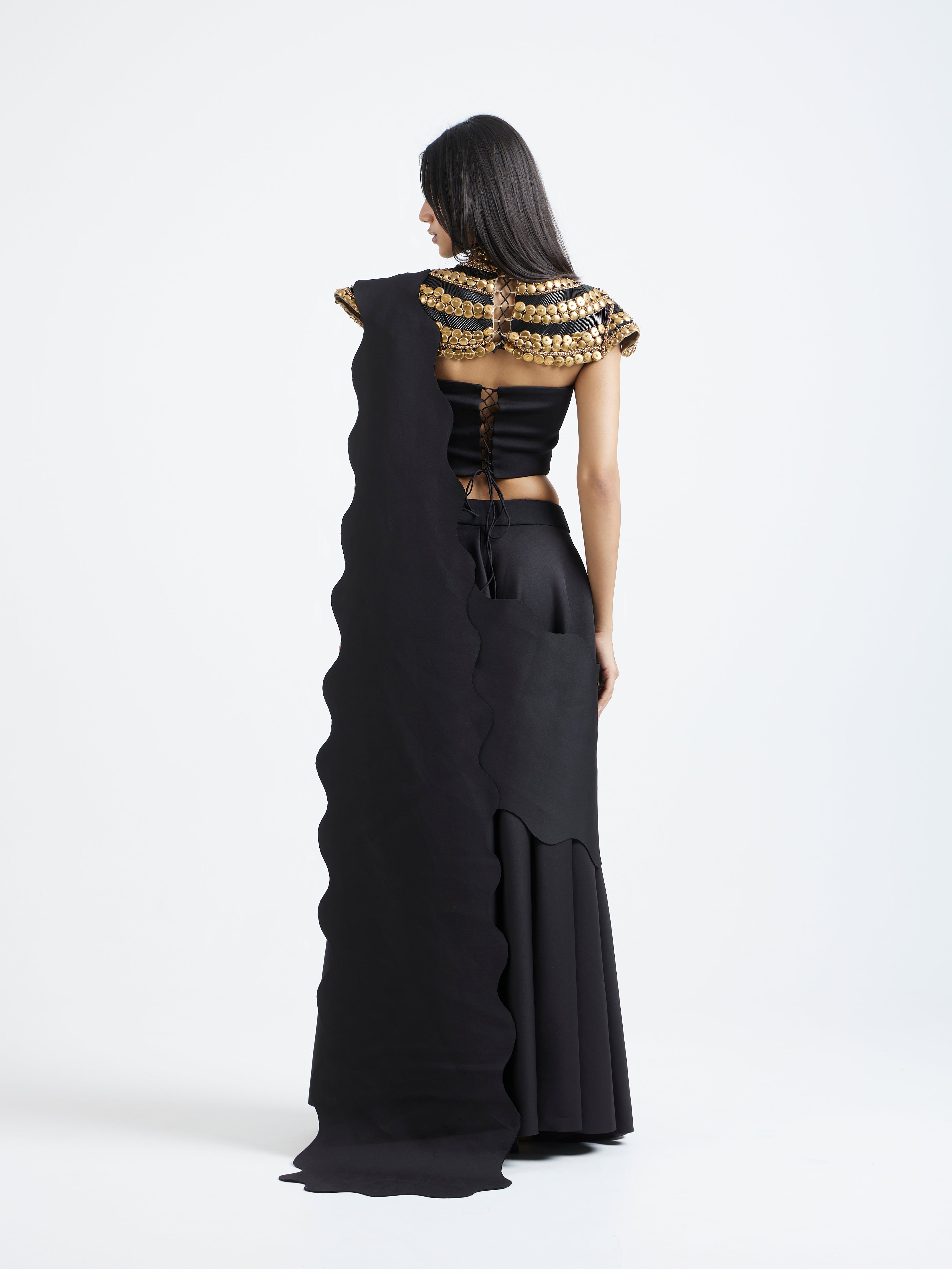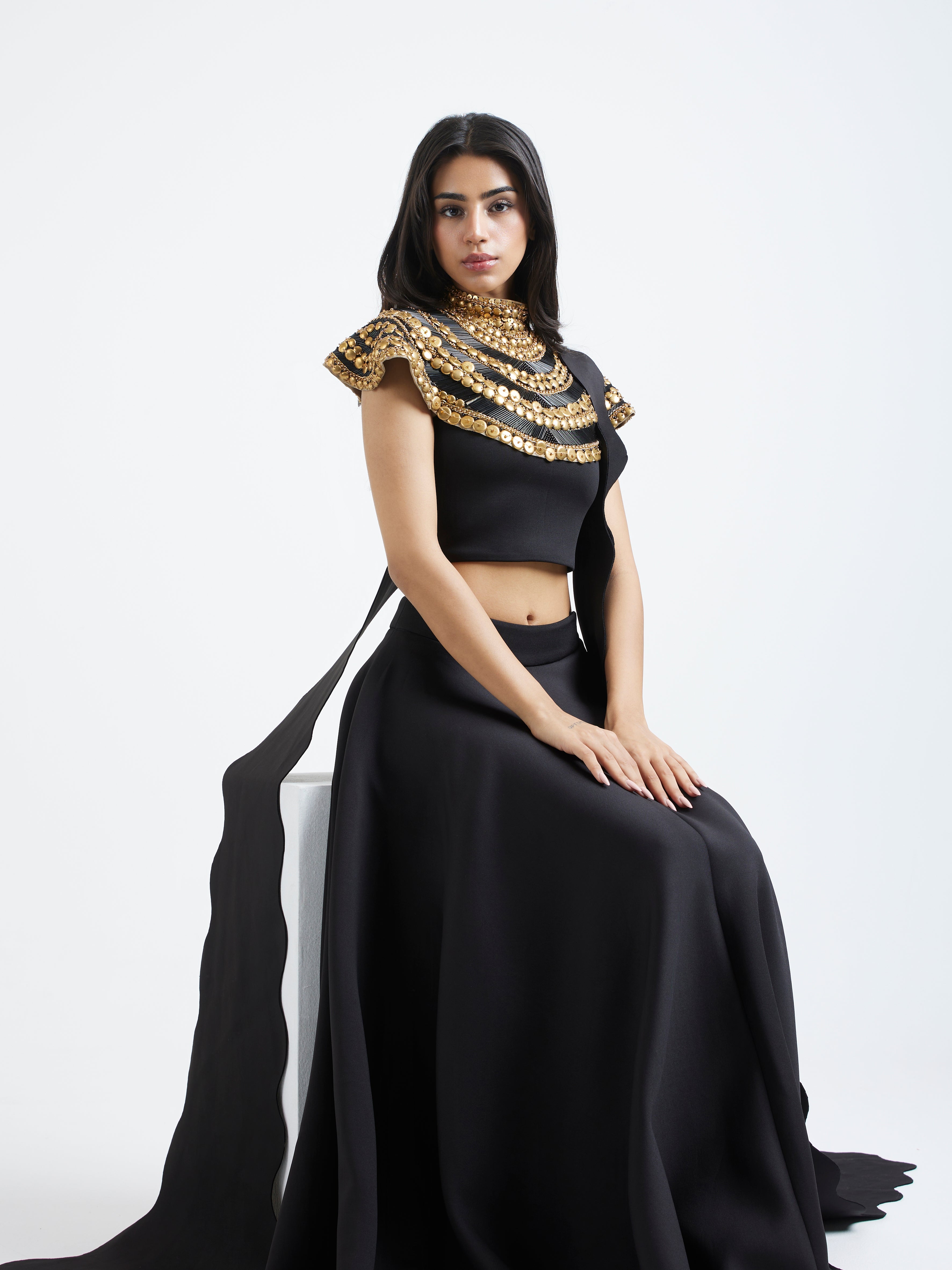 The detachable collar is intricately embellished in layered gold detailing—hand-placed to build a regal, textured armour-like effect that frames the neckline and shoulders.