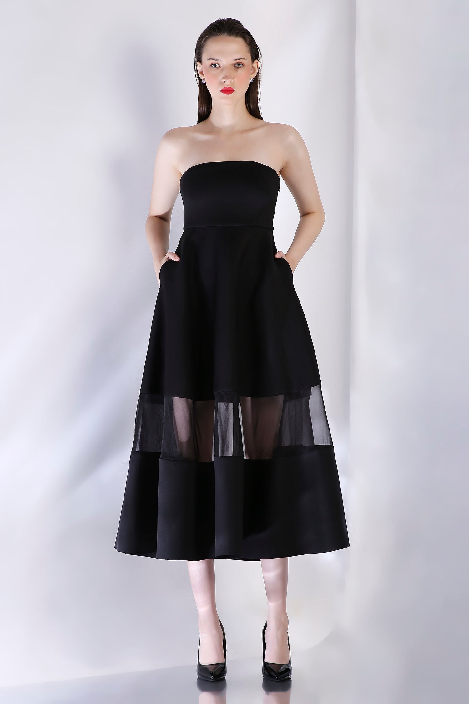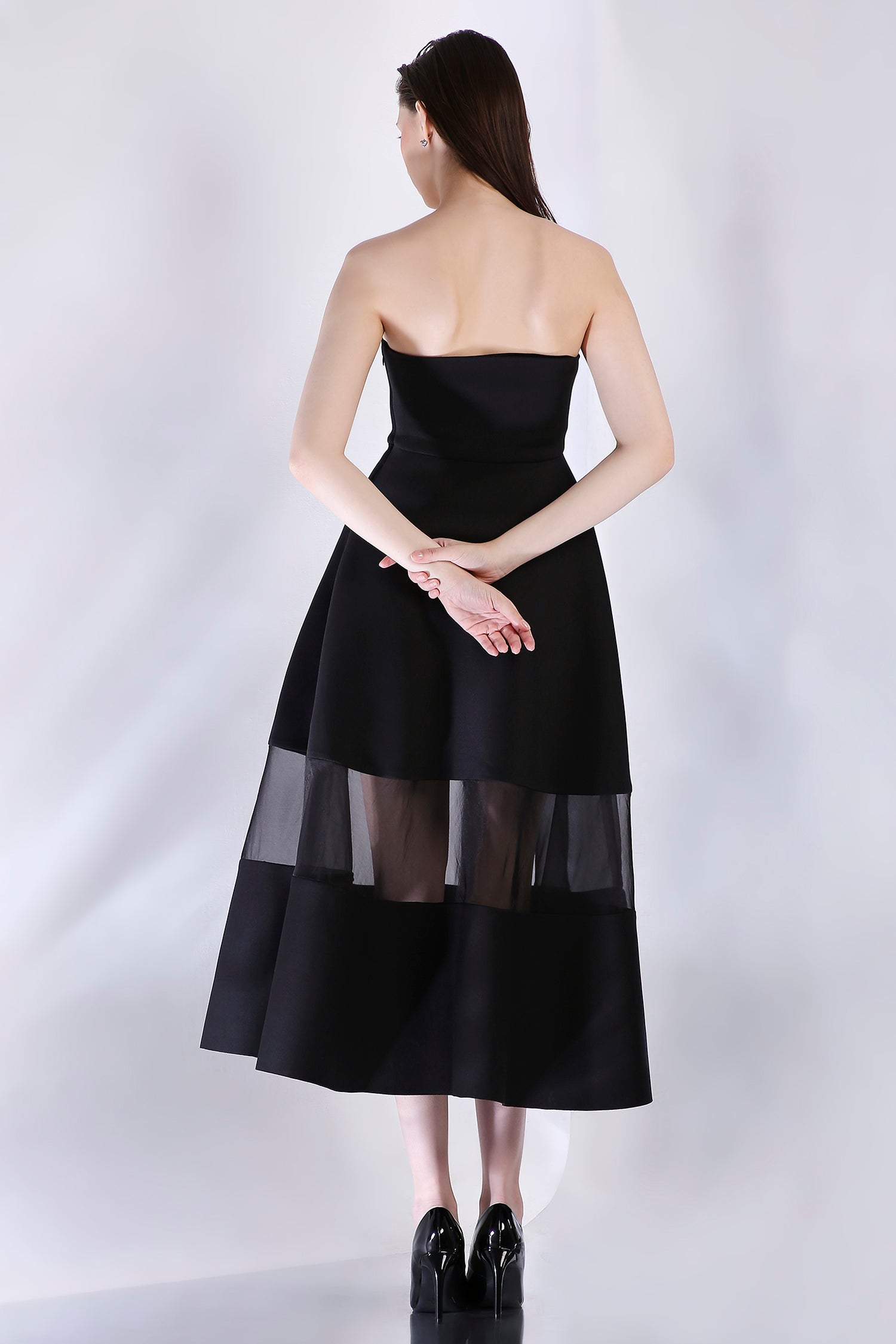 A delicate sheer panel adds a modern, alluring twist to this classic silhouette, offering just the right hint of skin while keeping the look refined.