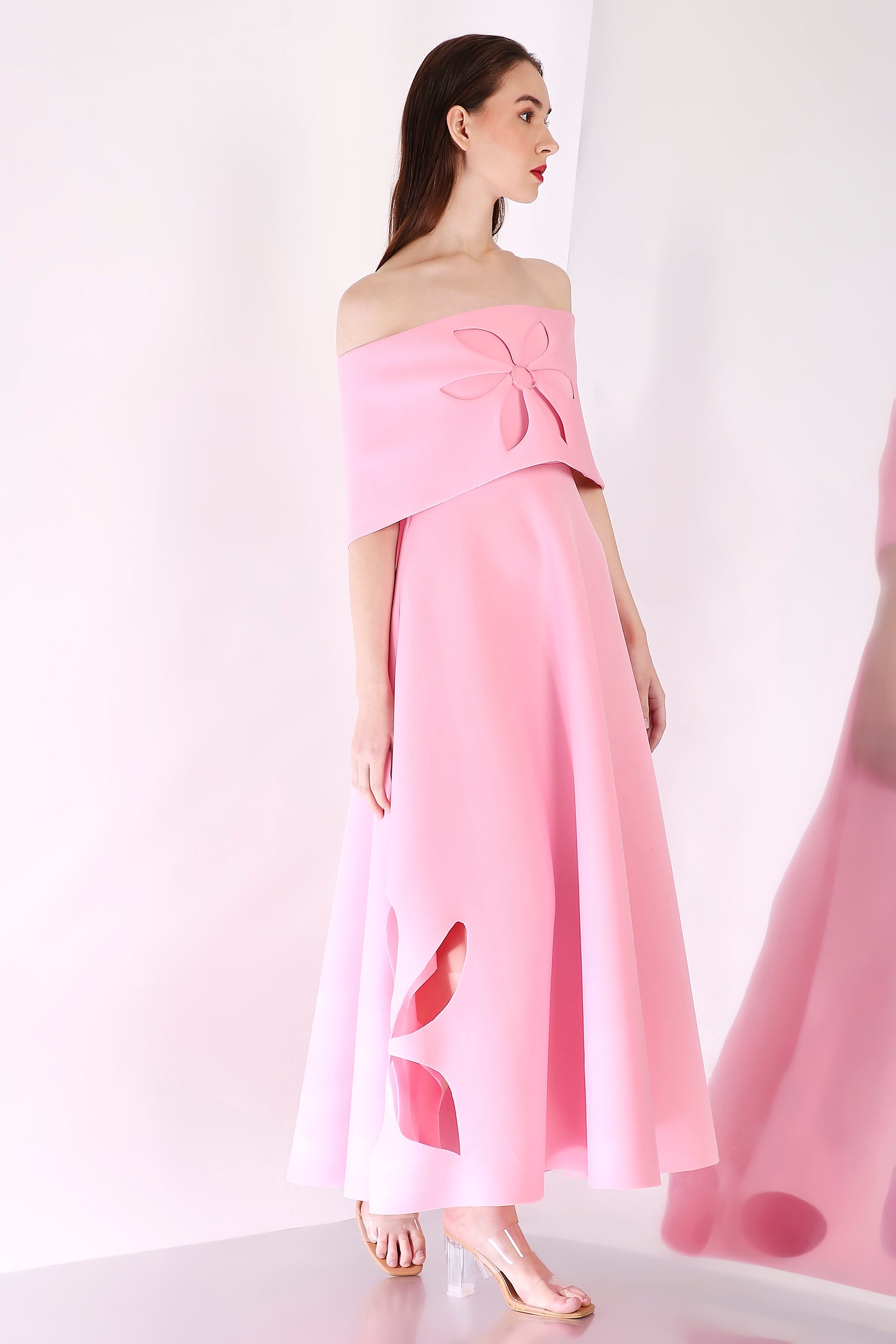 A strapless fit-and-flare dress in premium neoprene with a cutout floral motif on the hem, complemented by a cutout wrap that can be styled one-shoulder or off-shoulder. This ensemble offers chic versatility and refined elegance.