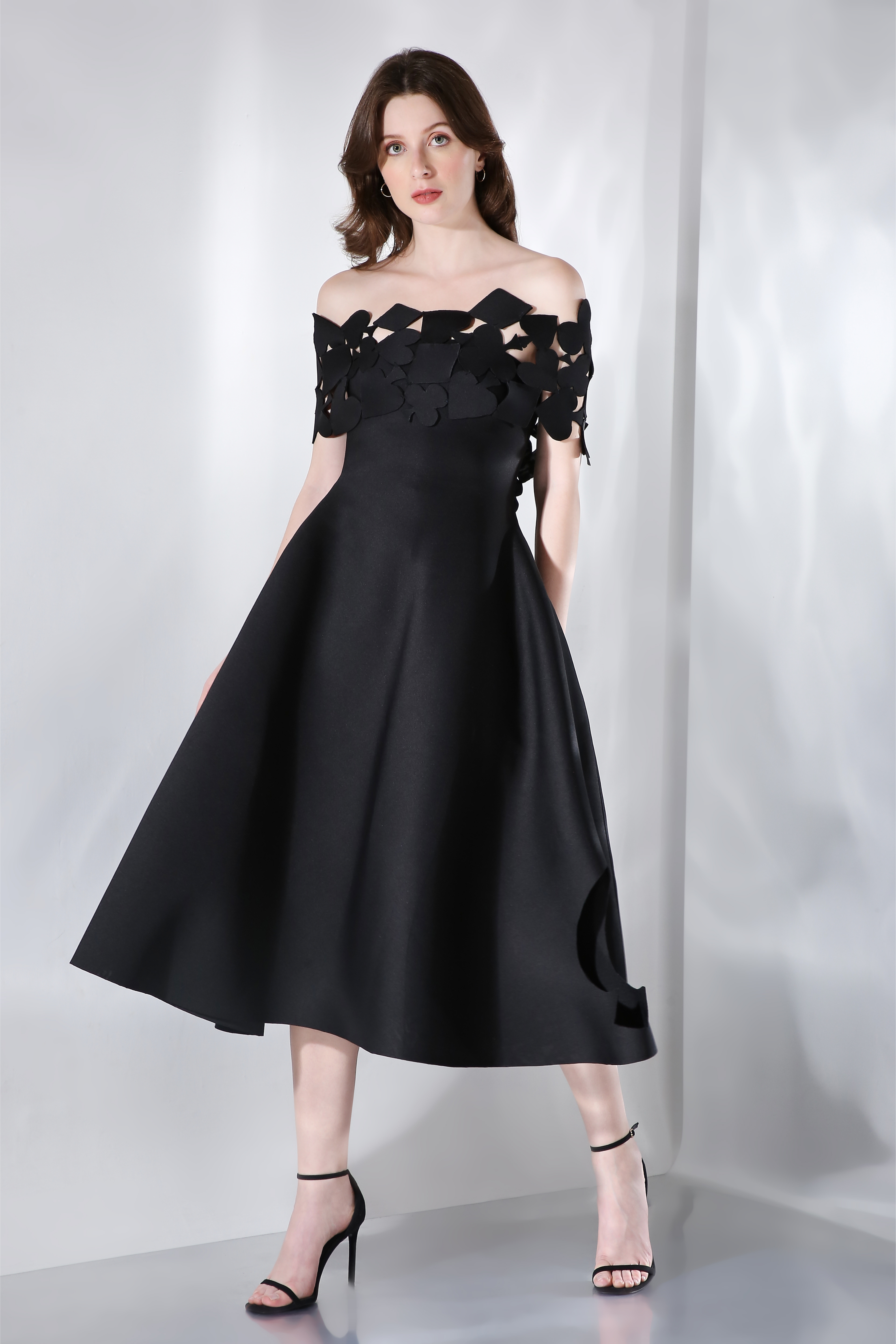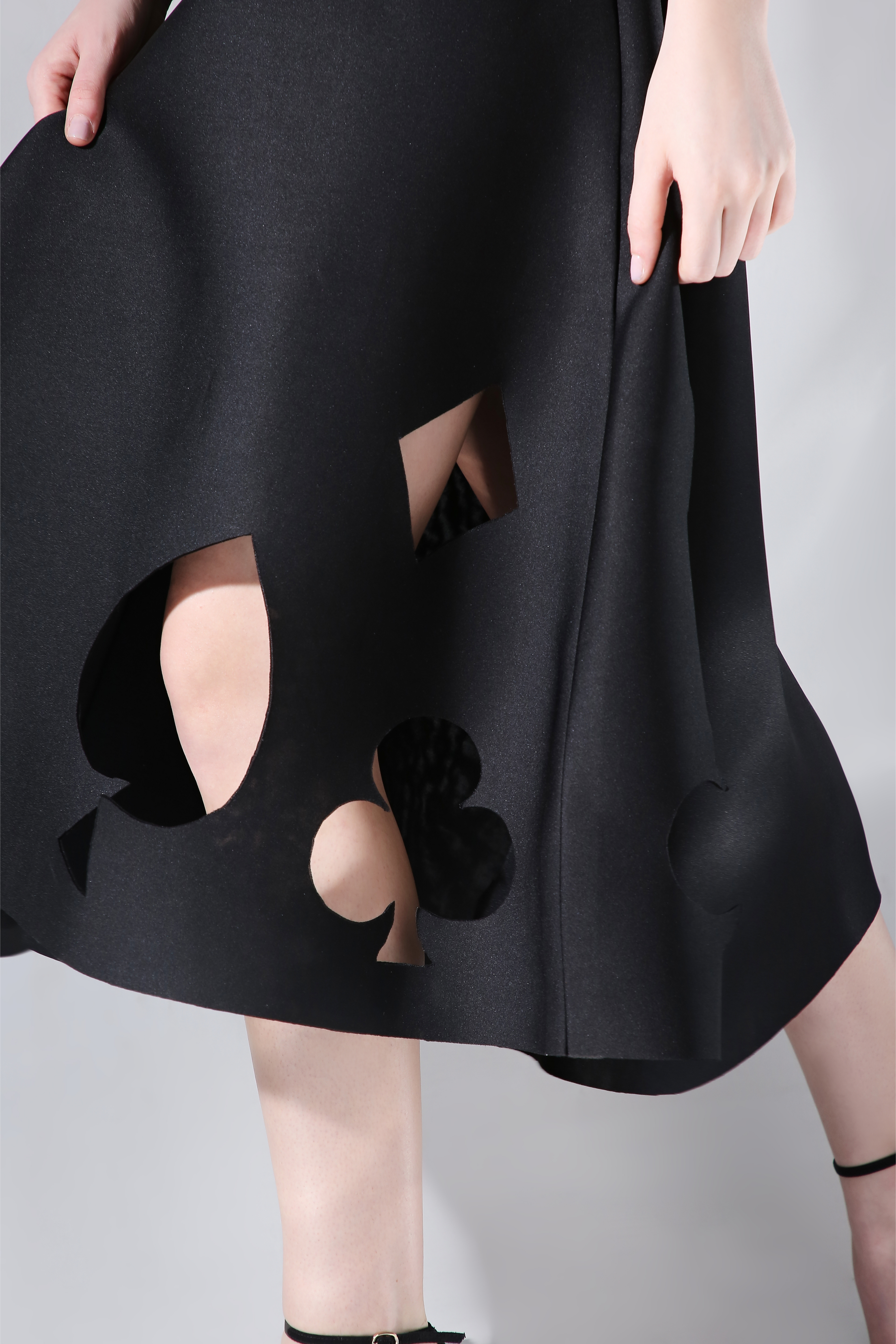 Featuring a fit and flare dress with cutouts of diamonds, spades, hearts and clubs across the flare. Please note that the wrap is not included (you can purchase the whole set here)