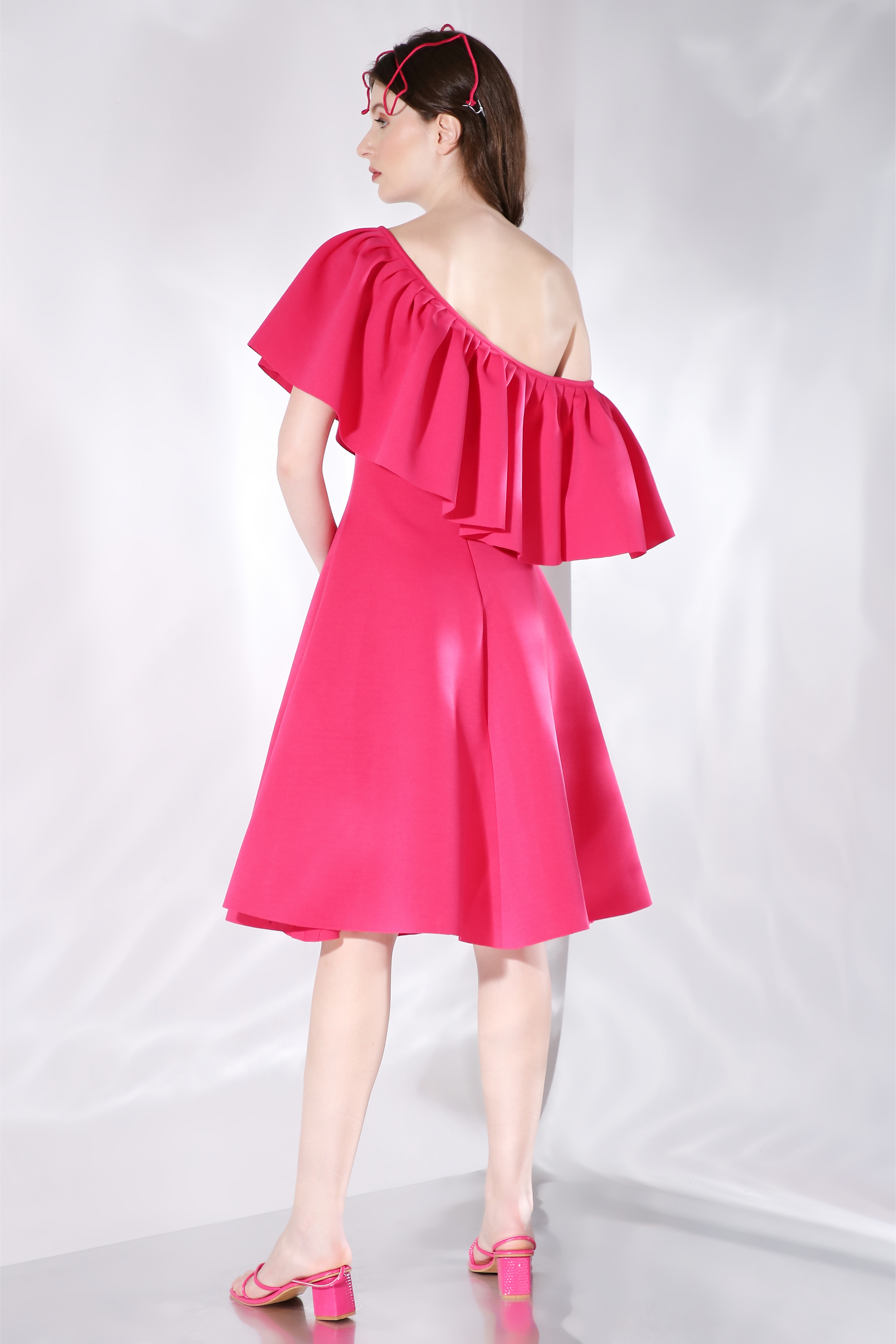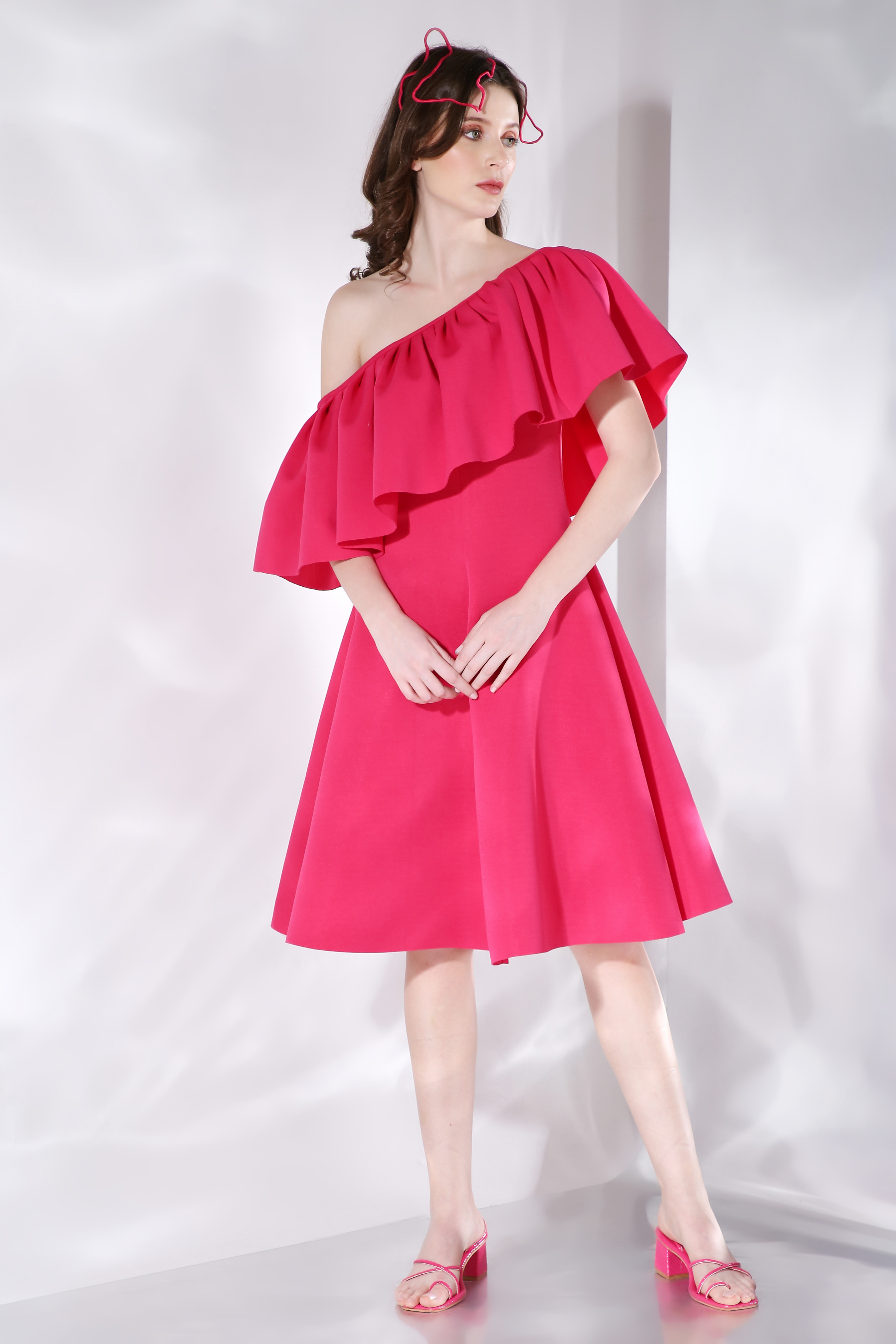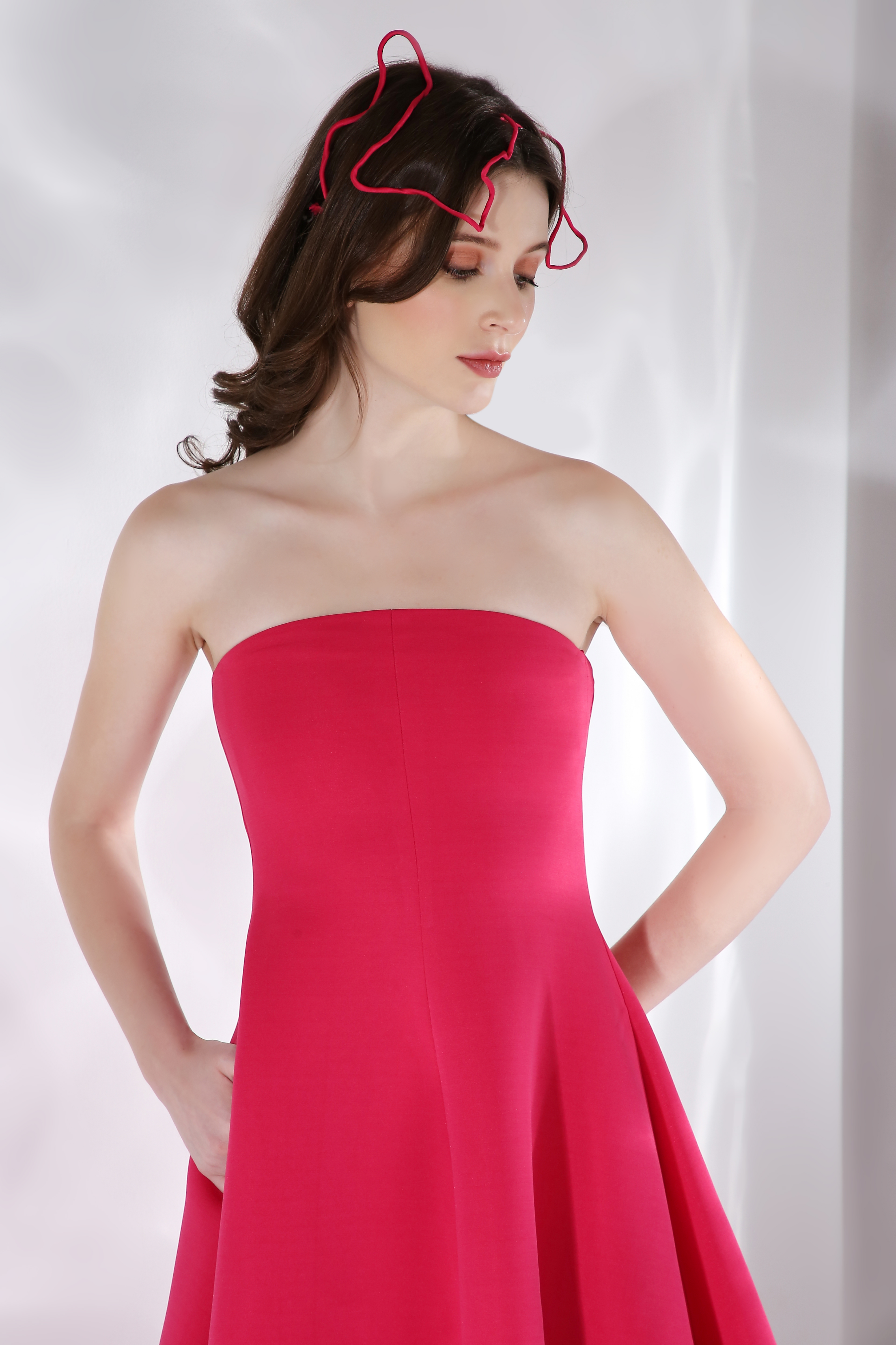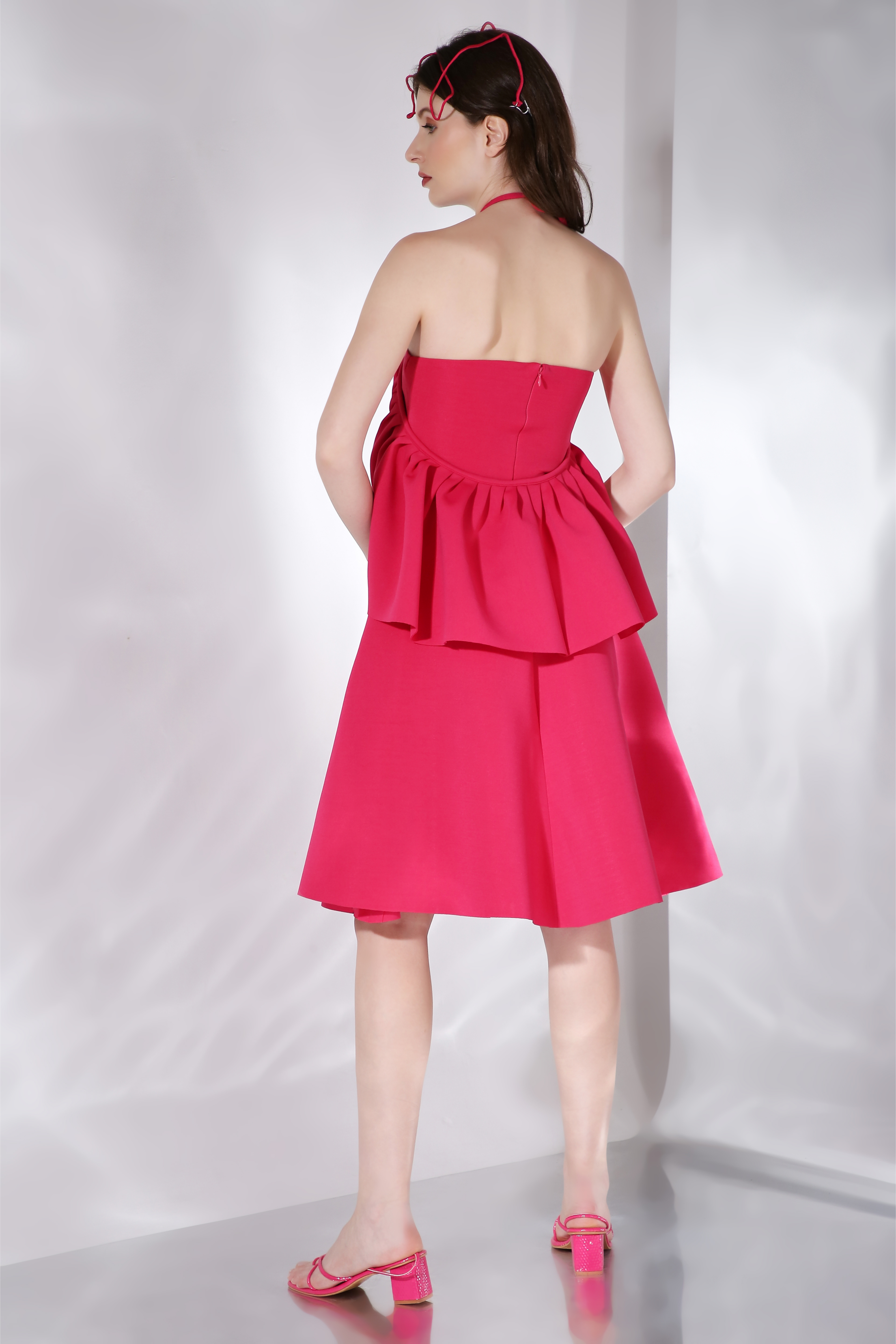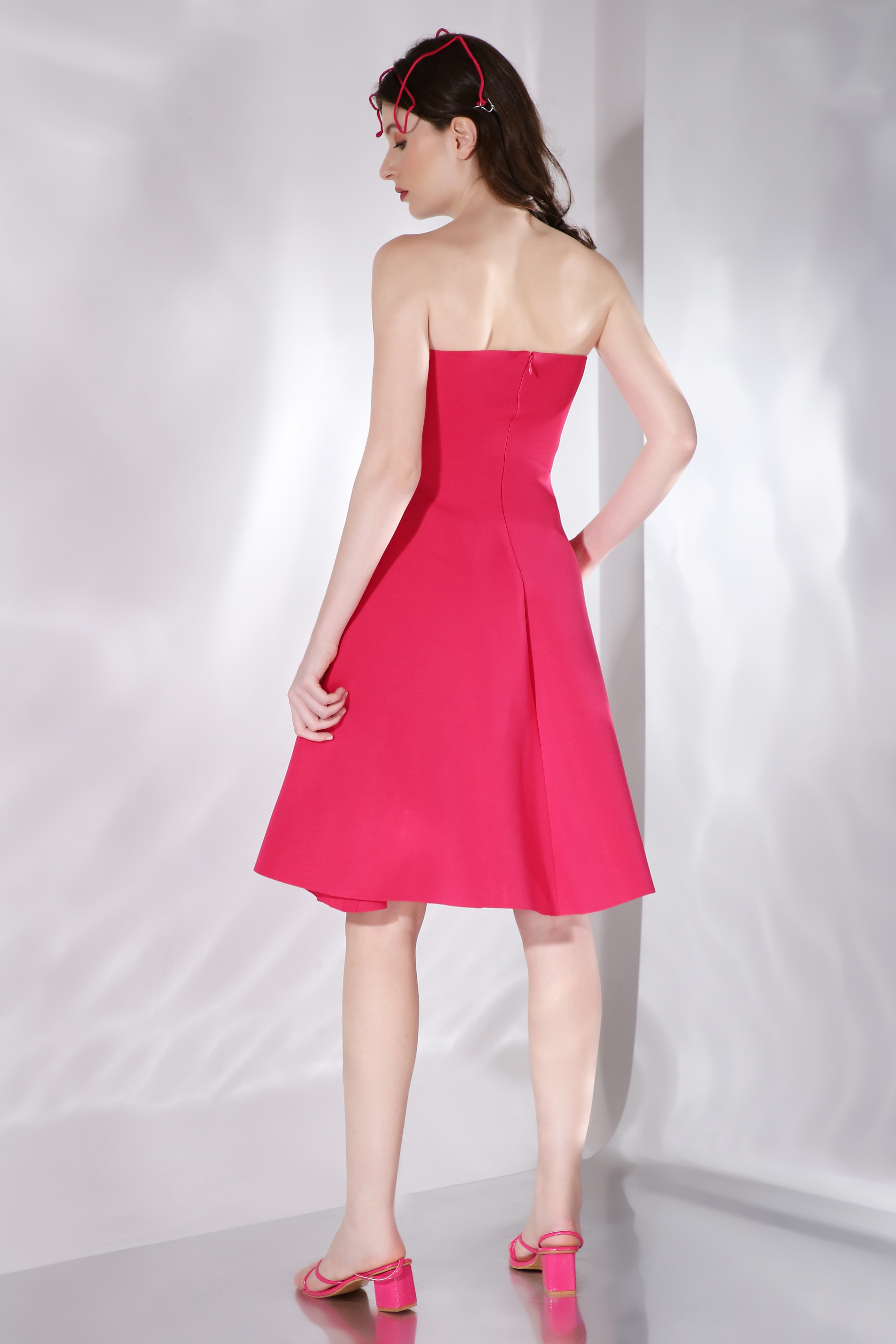 Featuring a flared knee length, strapless dress paired with a ruffled detachable accent which can be styled in different ways.