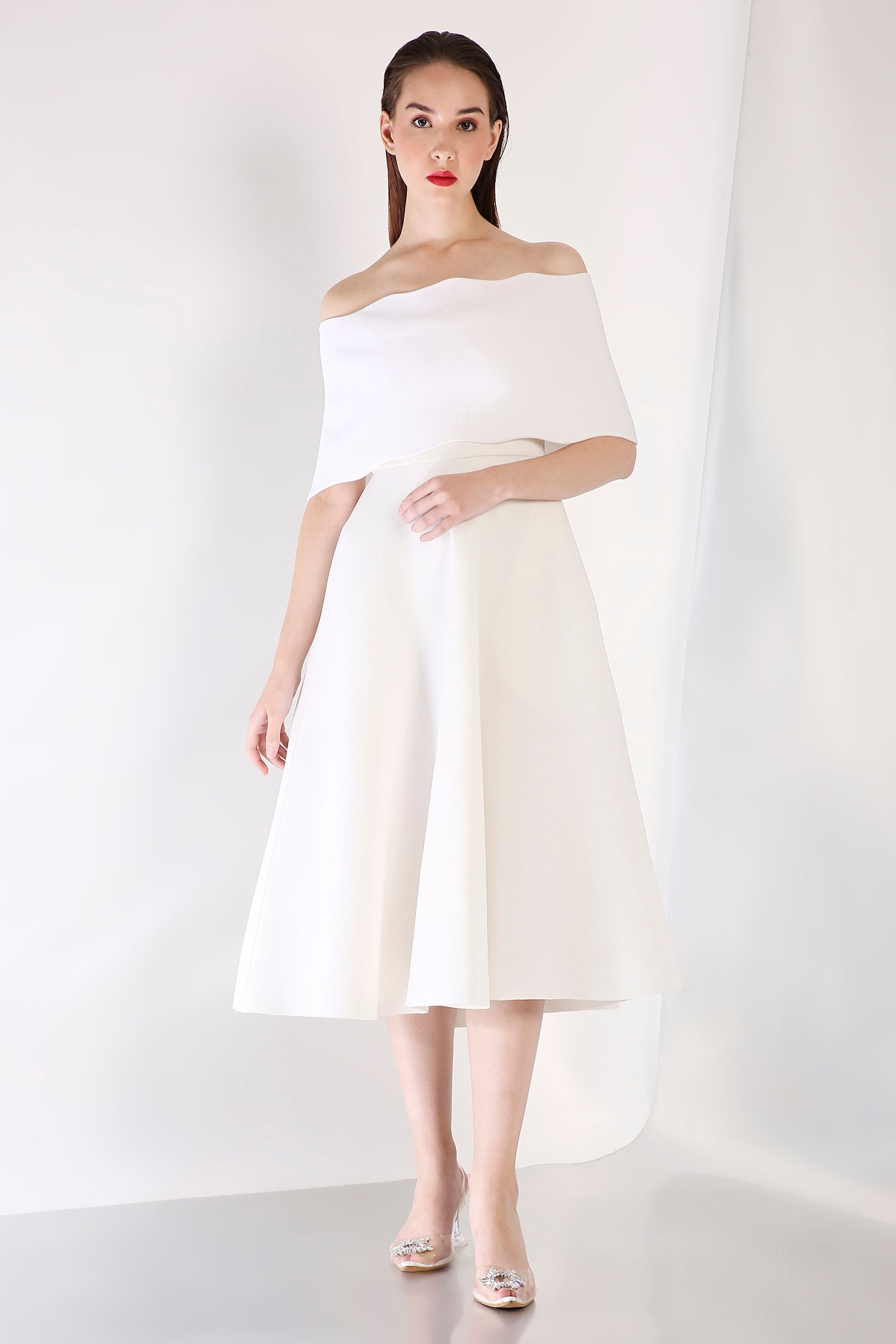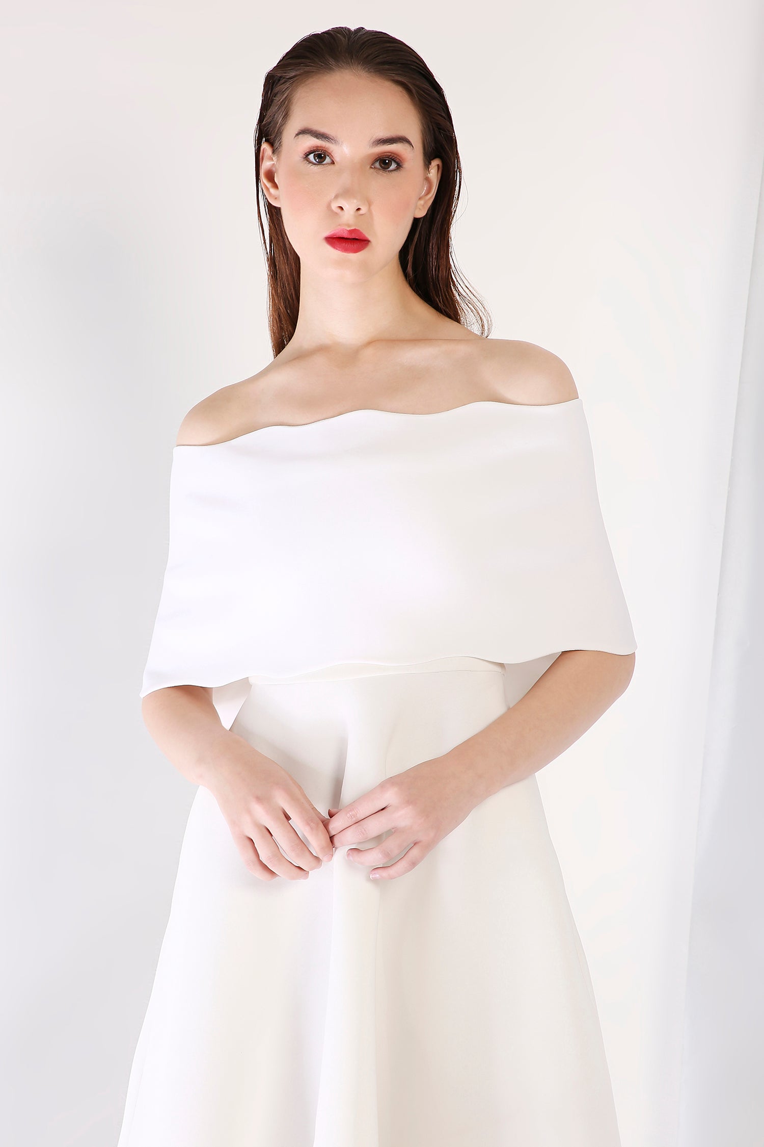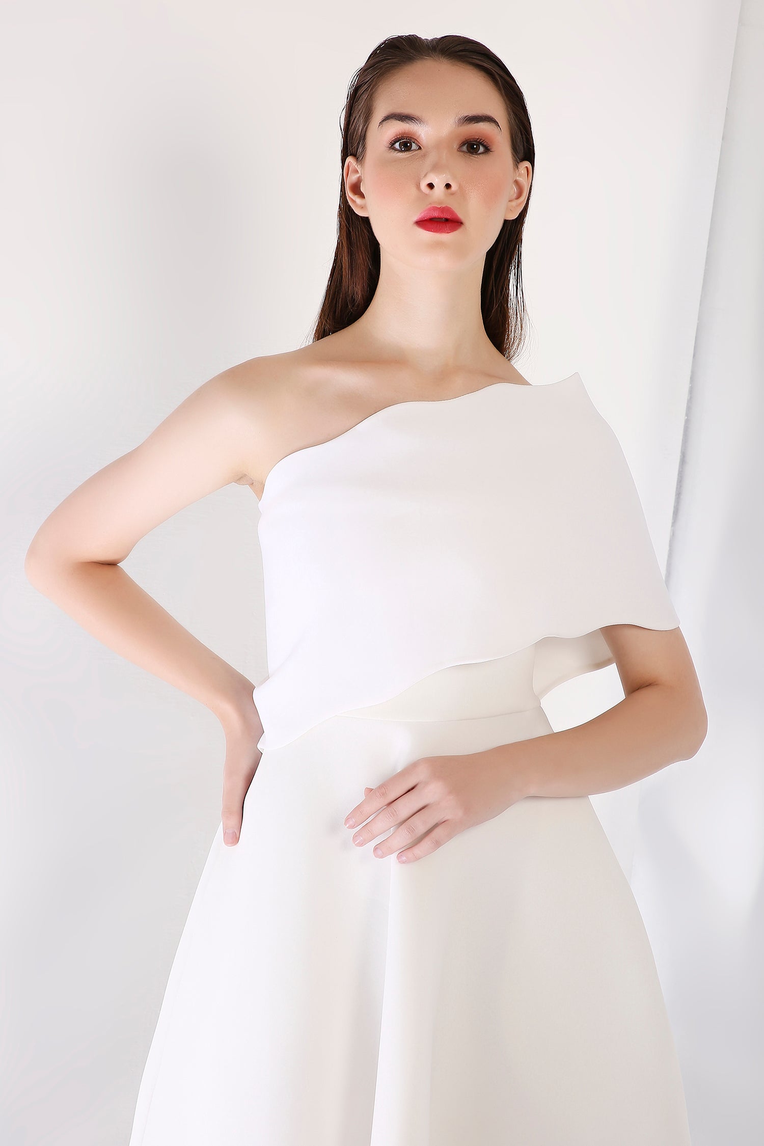 This sophisticated strapless midi dress is complemented by a stunning wave wrap that adds fluidity and movement to your look. The wrap can be styled in two ways—one-shoulder or off-shoulder—offering versatile elegance that suits any formal event.