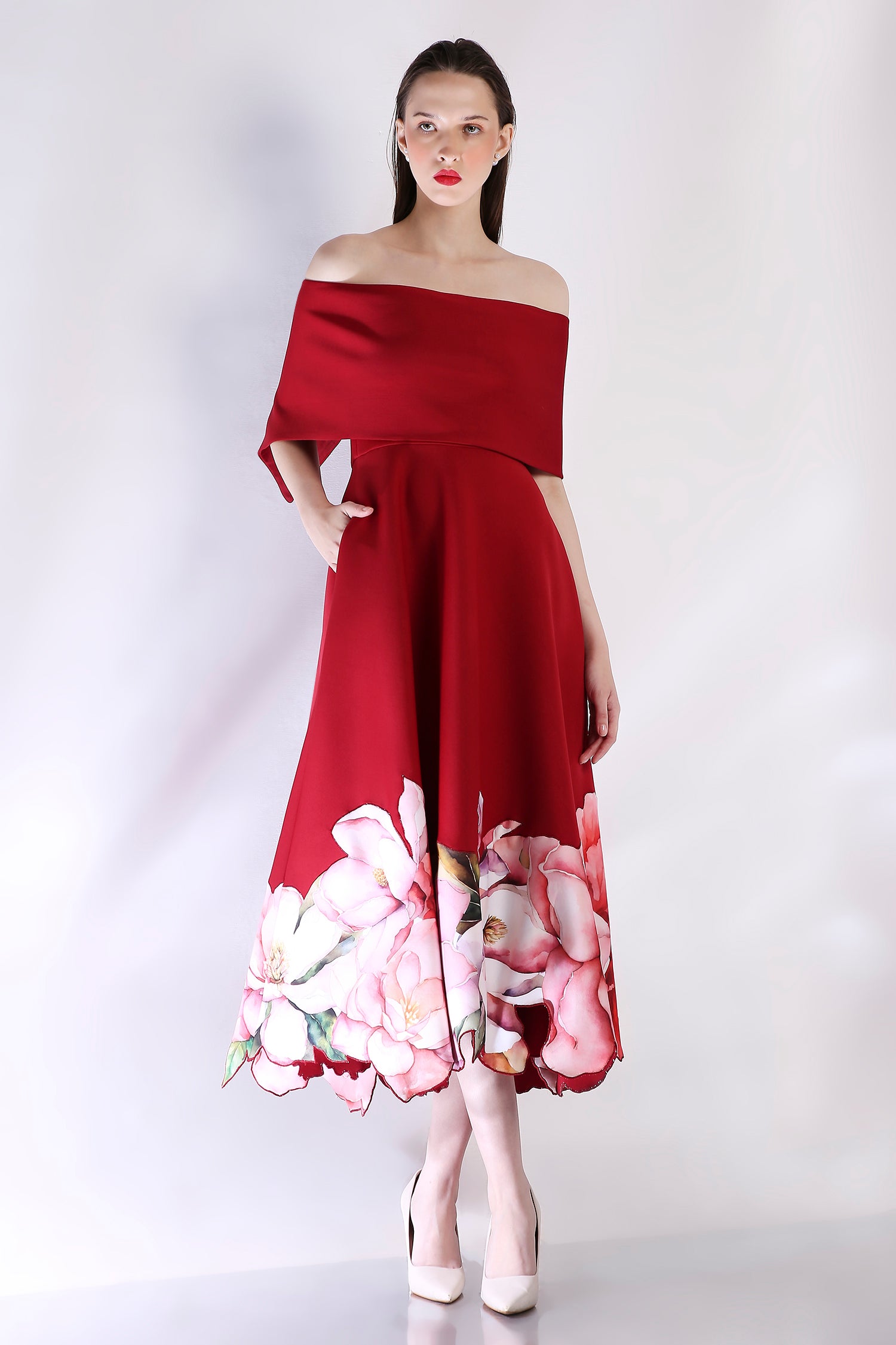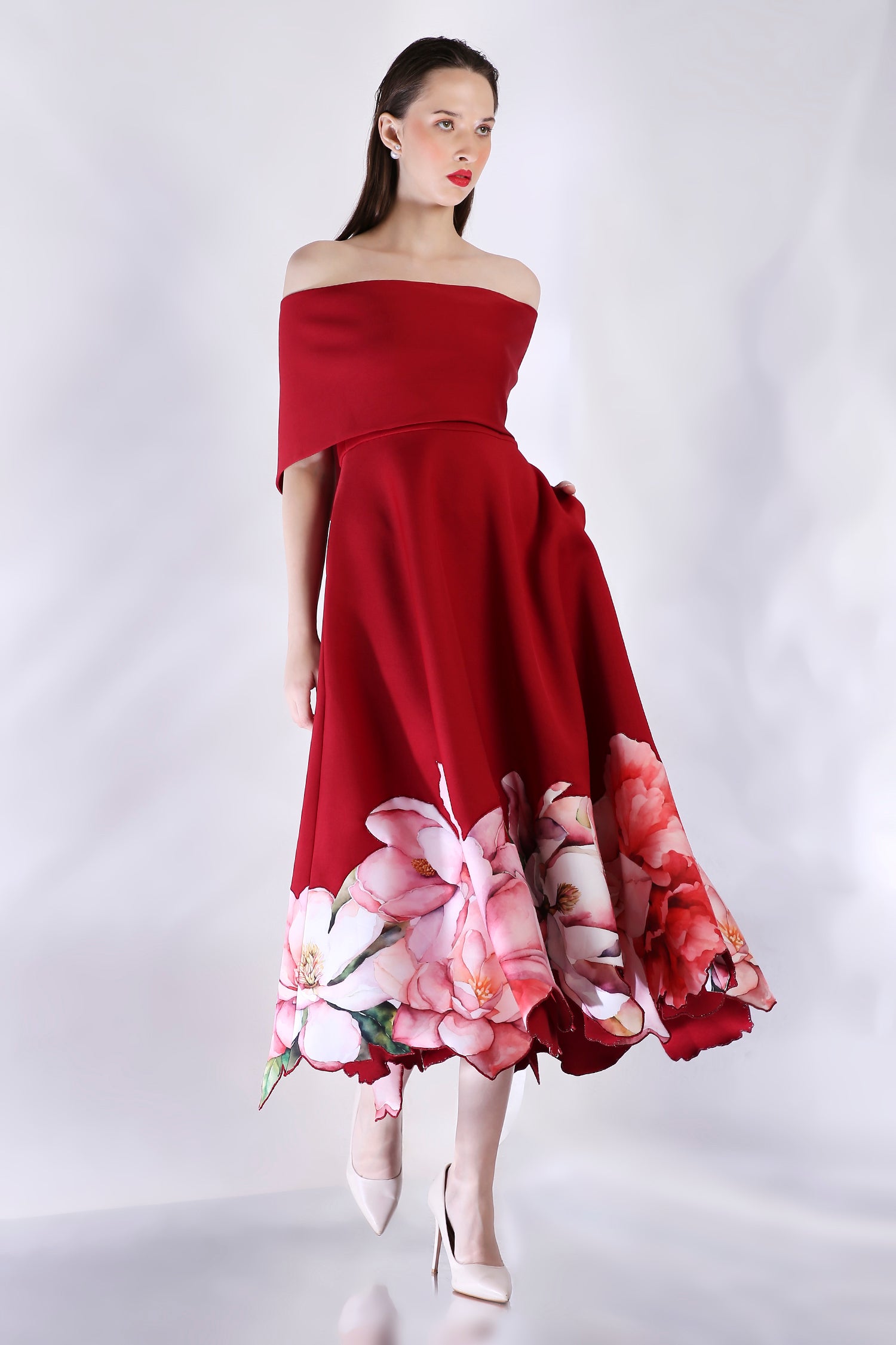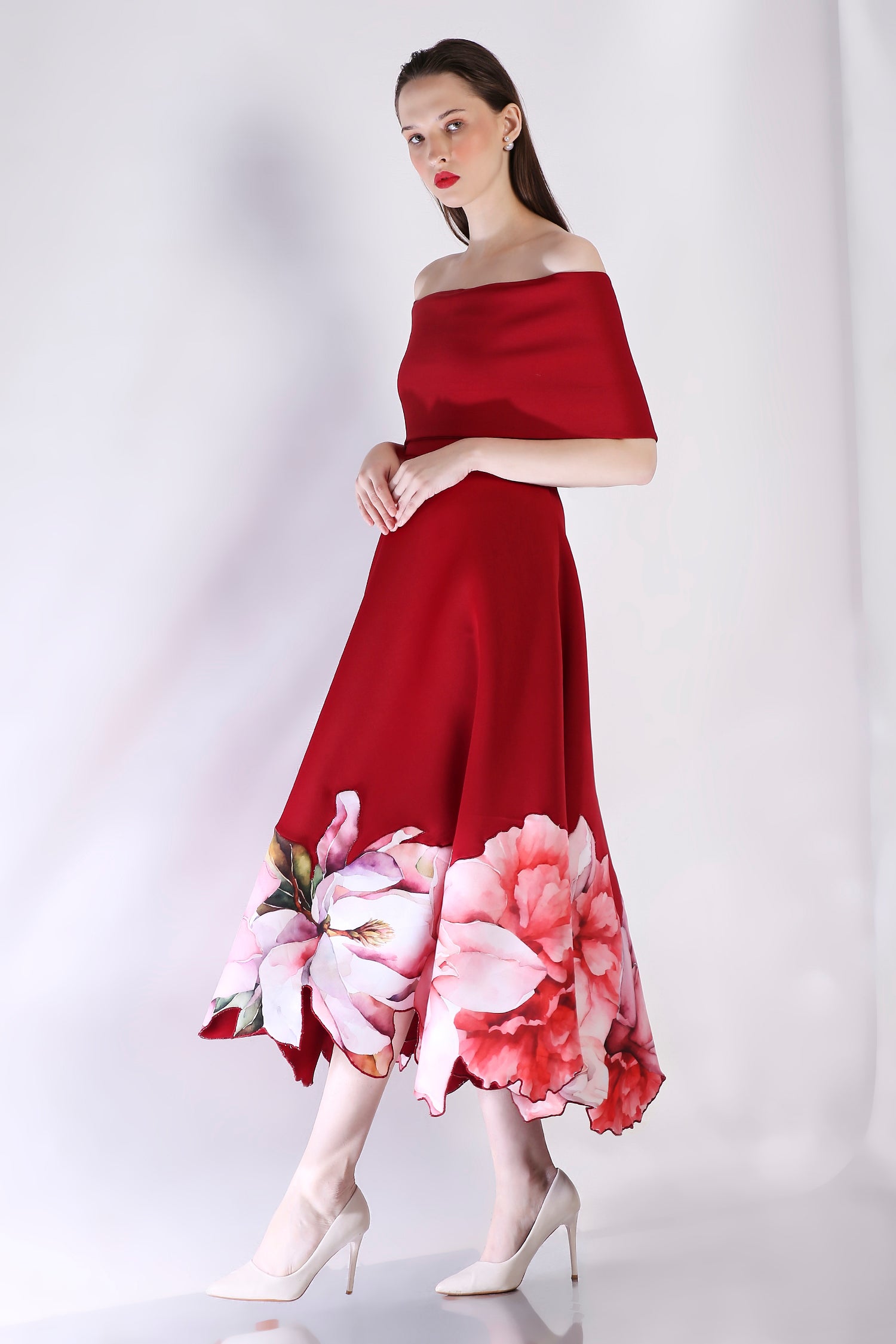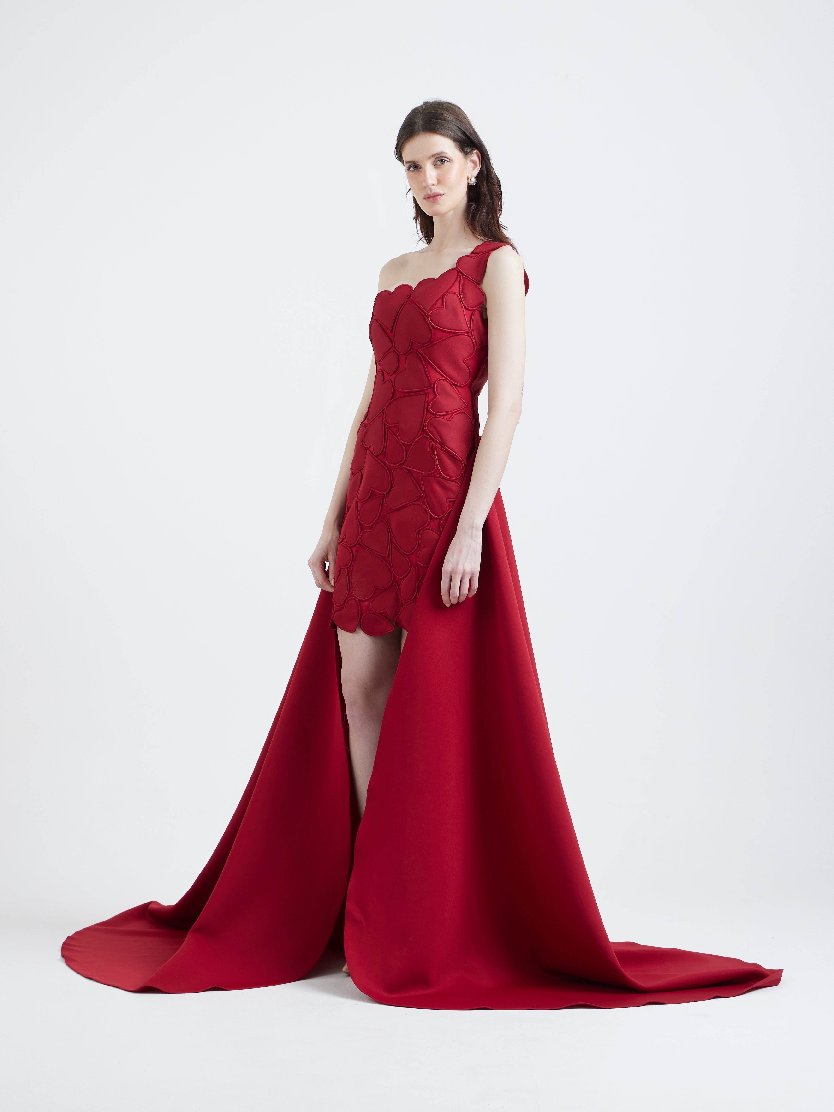 Introducing the Juliette dress—a striking strapless silhouette in deep red, adorned with soft floral appliqué cutouts along the hem for a touch of romance. Paired with a versatile classic wrap that can be styled off-shoulder or one-shoulder, Juliette transforms effortlessly for any occasion. This elegant ensemble combines timeless charm with modern sophistication, making it a perfect choice for special events.