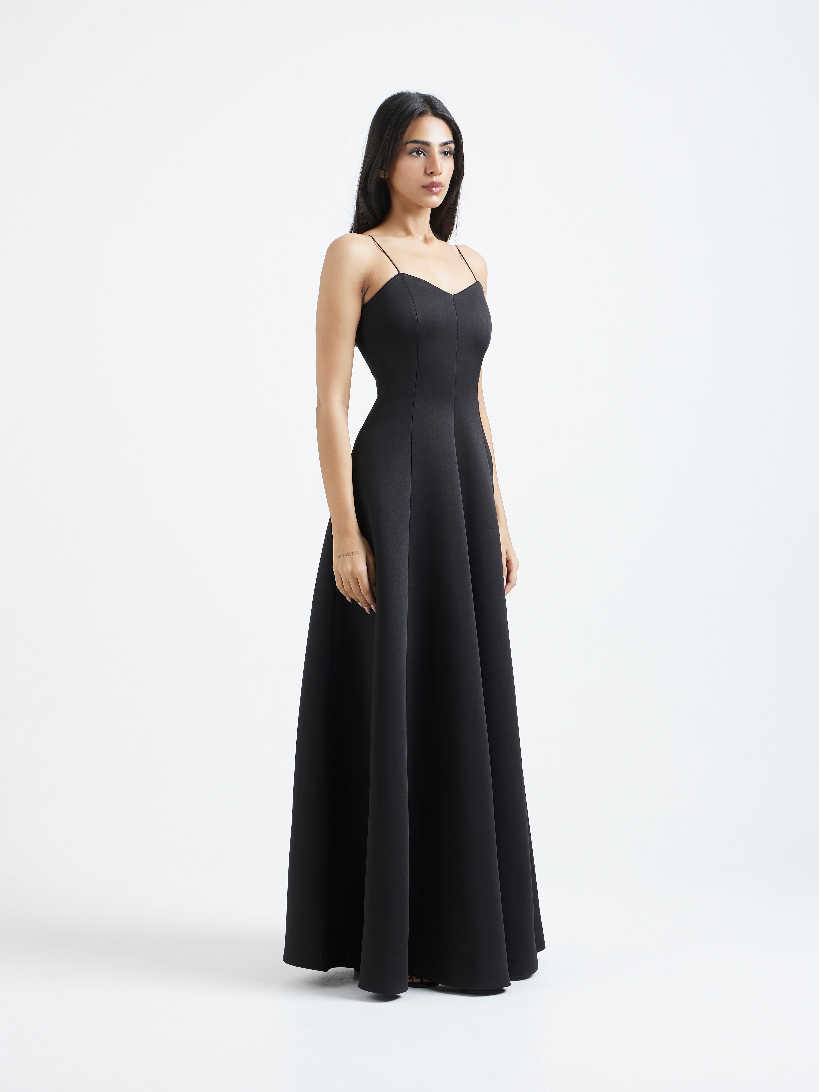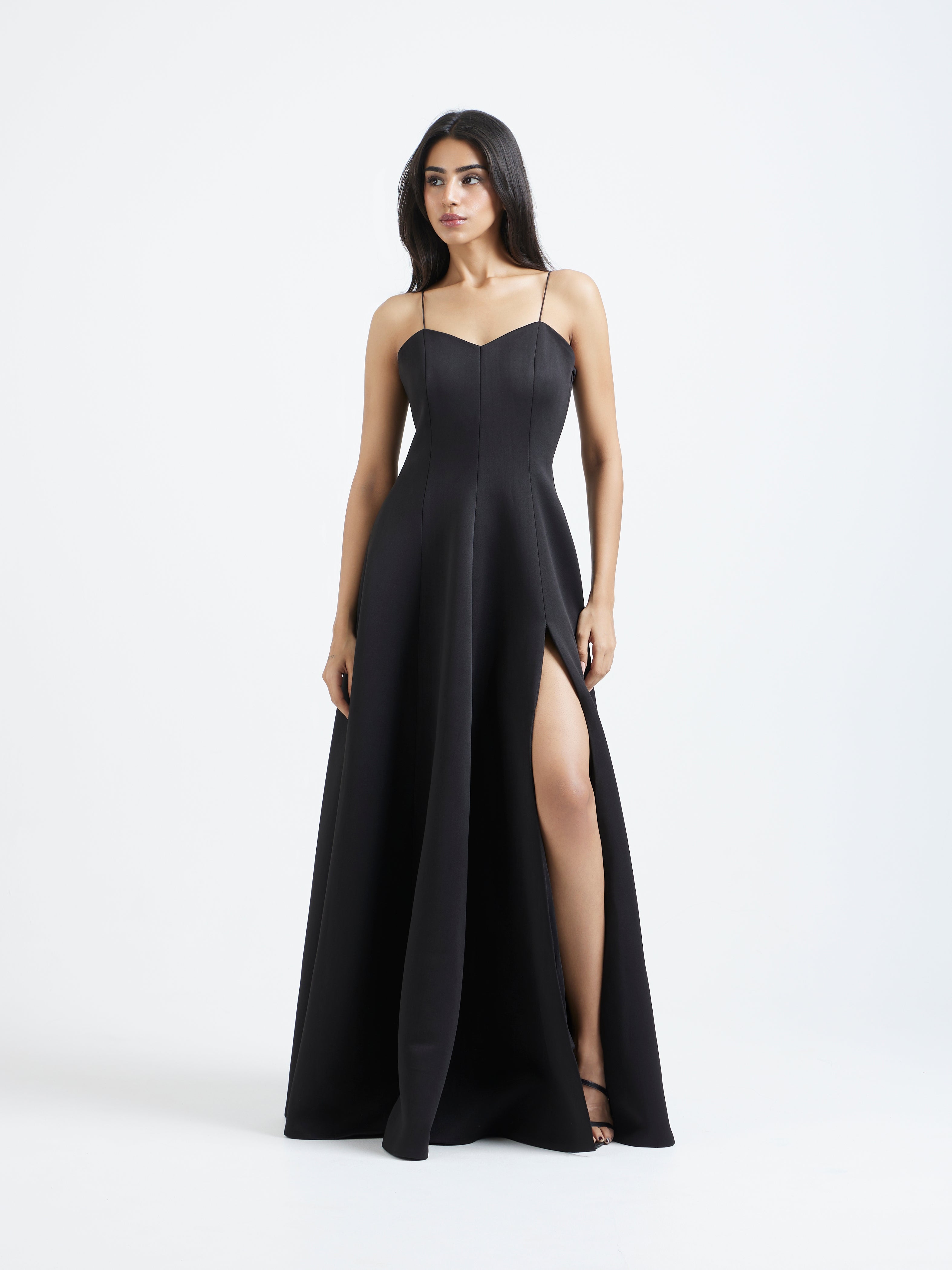 Kaira exemplifies timeless sophistication with a modern, structured finish and an optional thigh high slit.