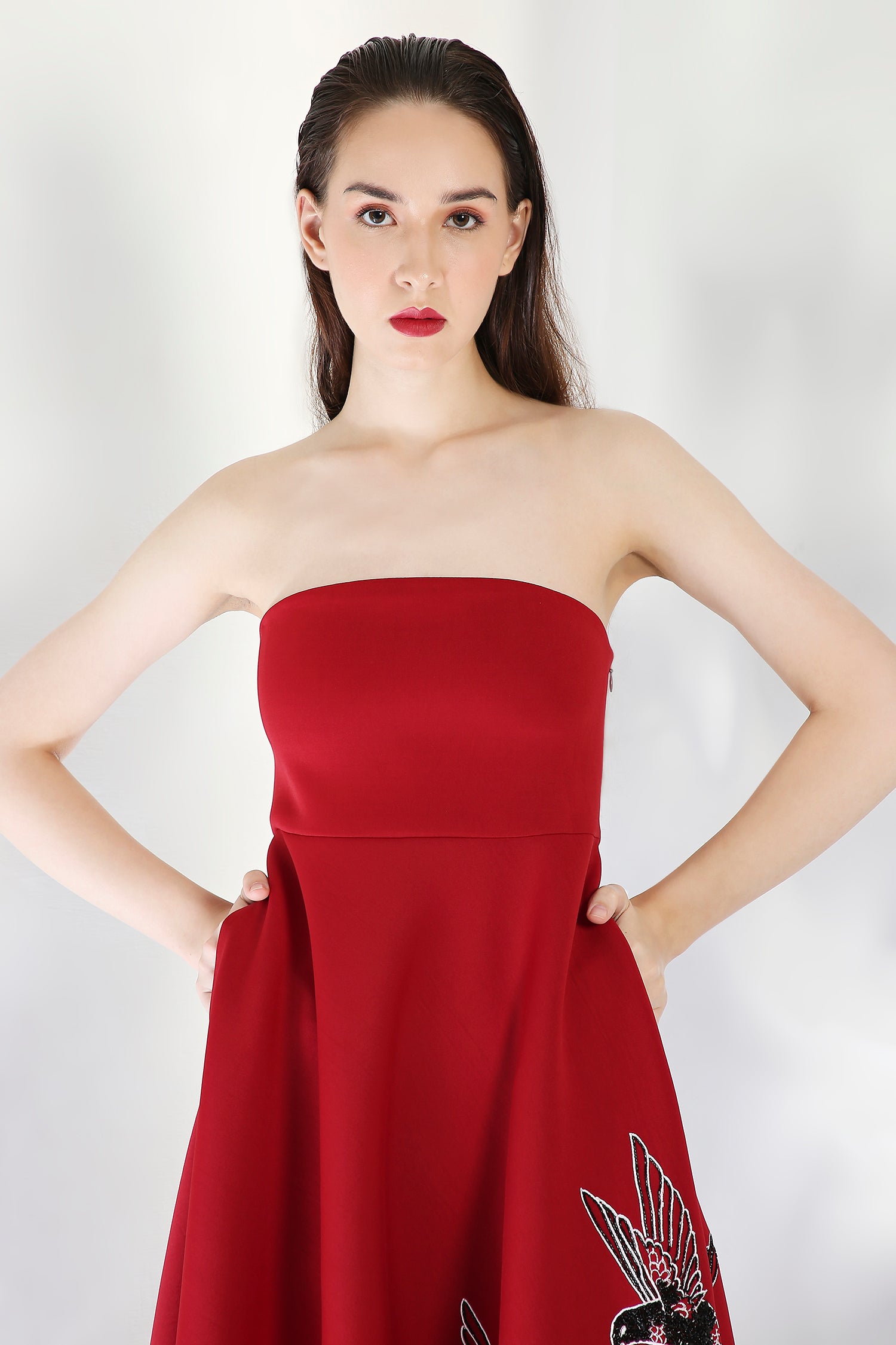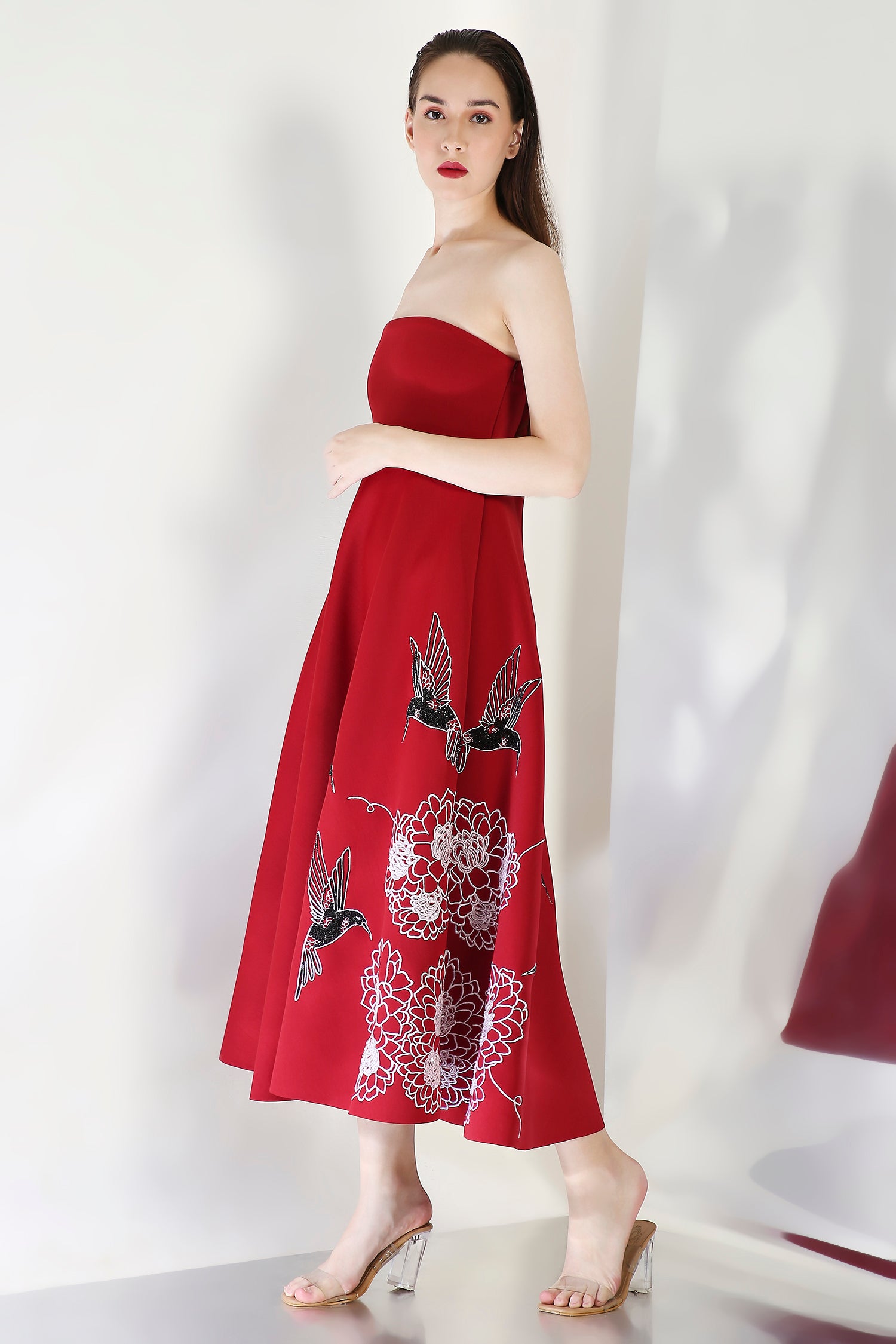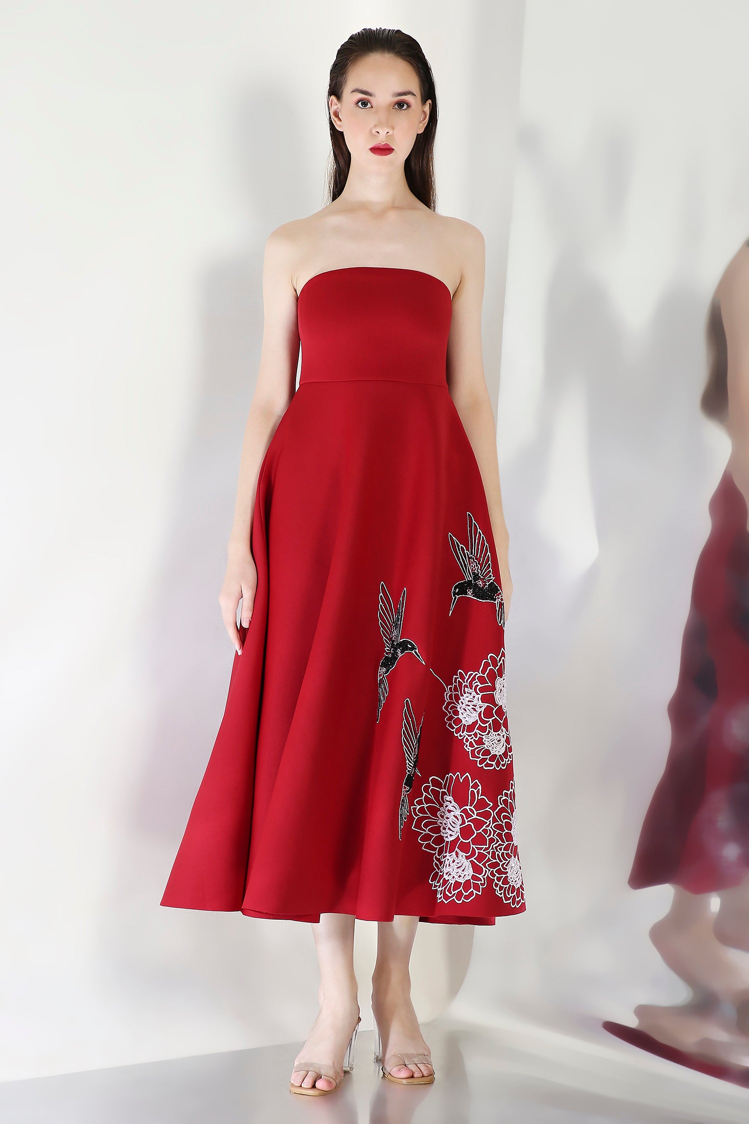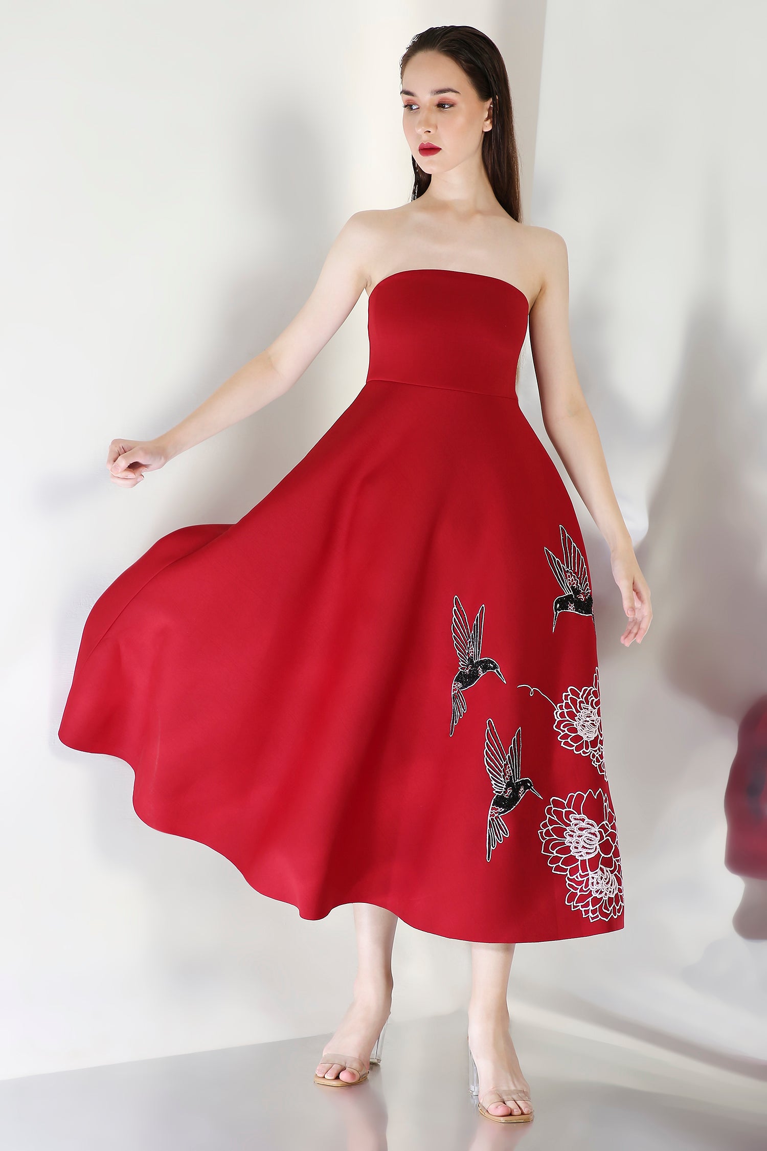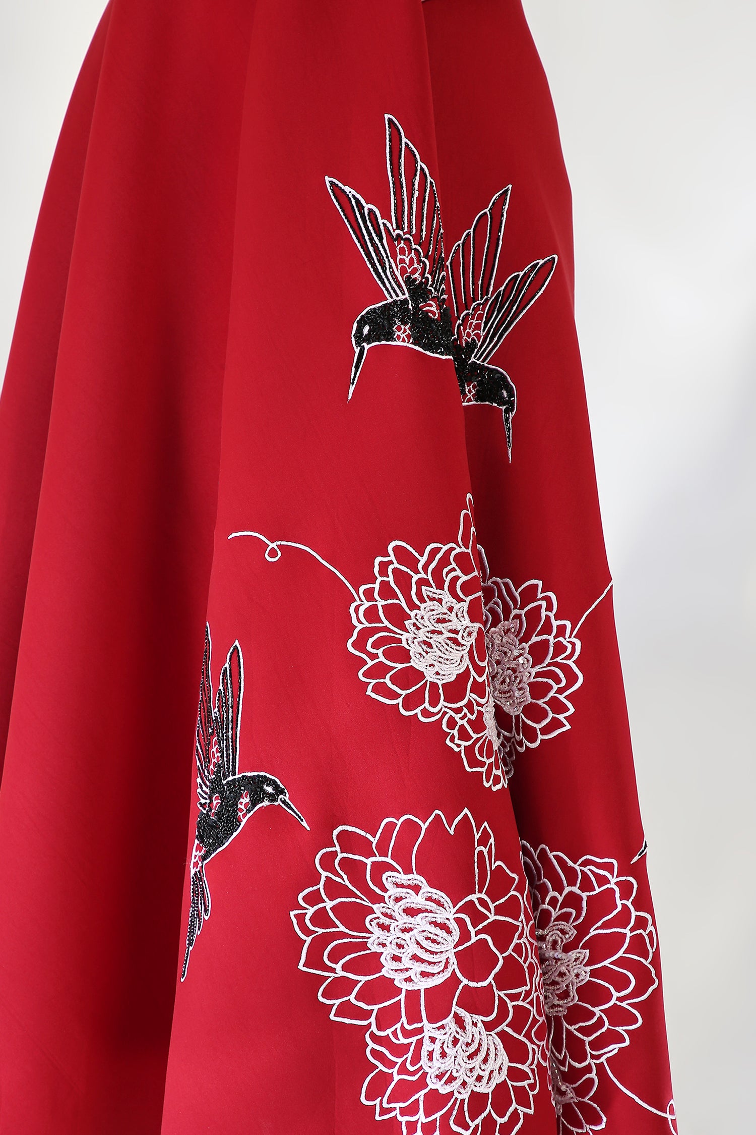 The Kingfisher dress embodies elegance with its intricately hand embroidered floral design, emphasised with beads and sequins.