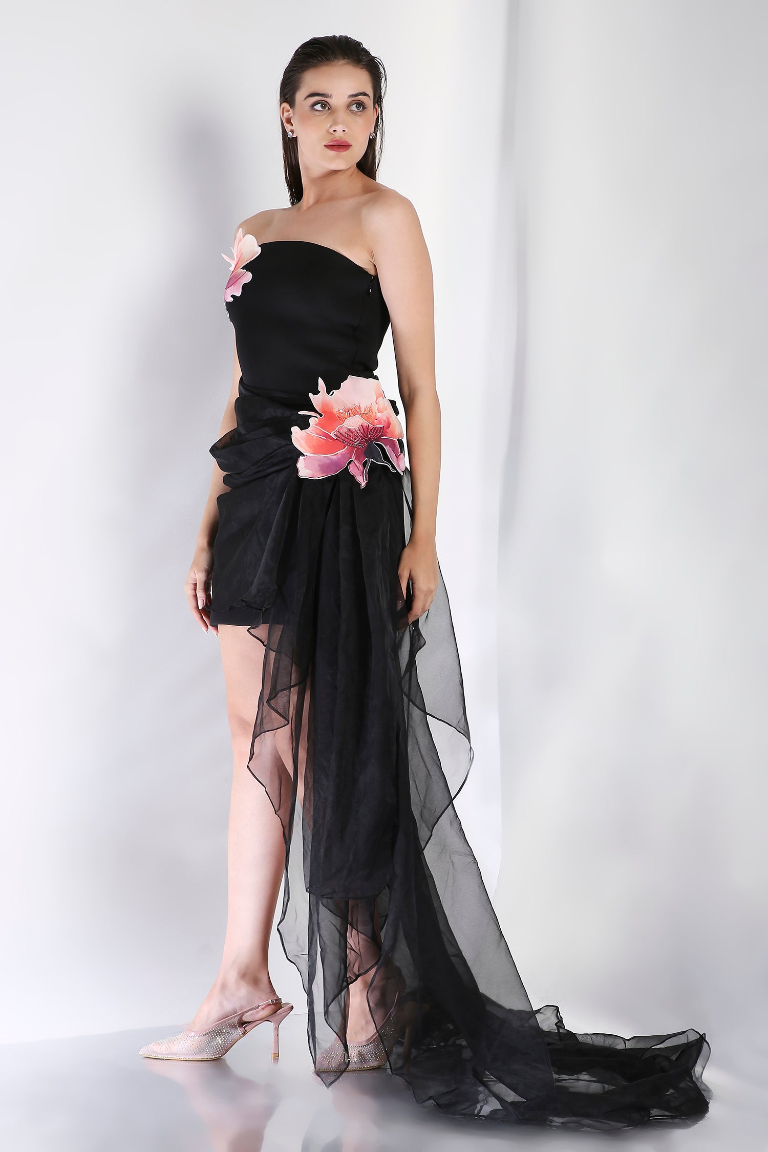 The layered organza trail drapes effortlessly, adding volume, softness, and statement appeal. Style it with or without for an instantly transformative look.