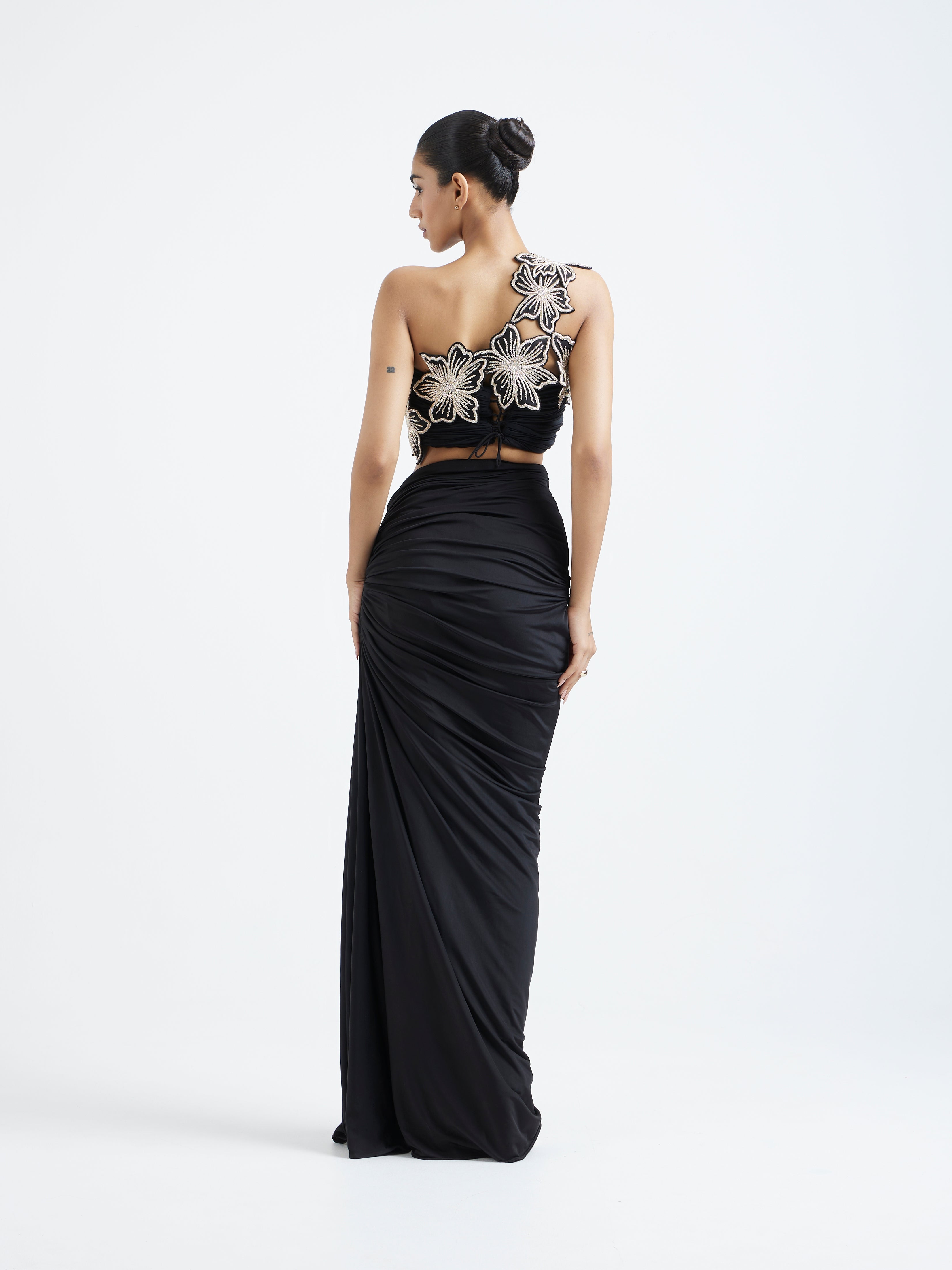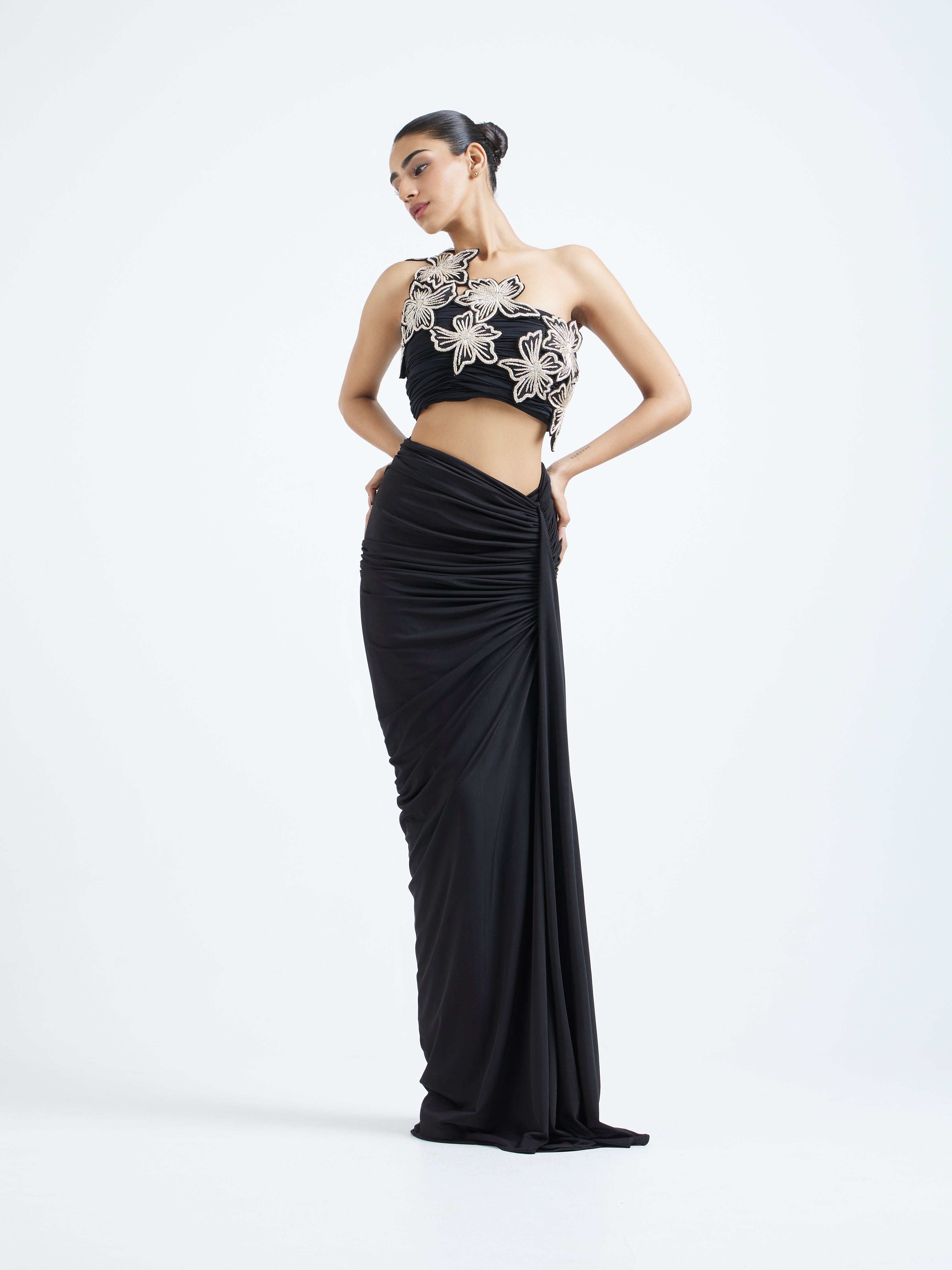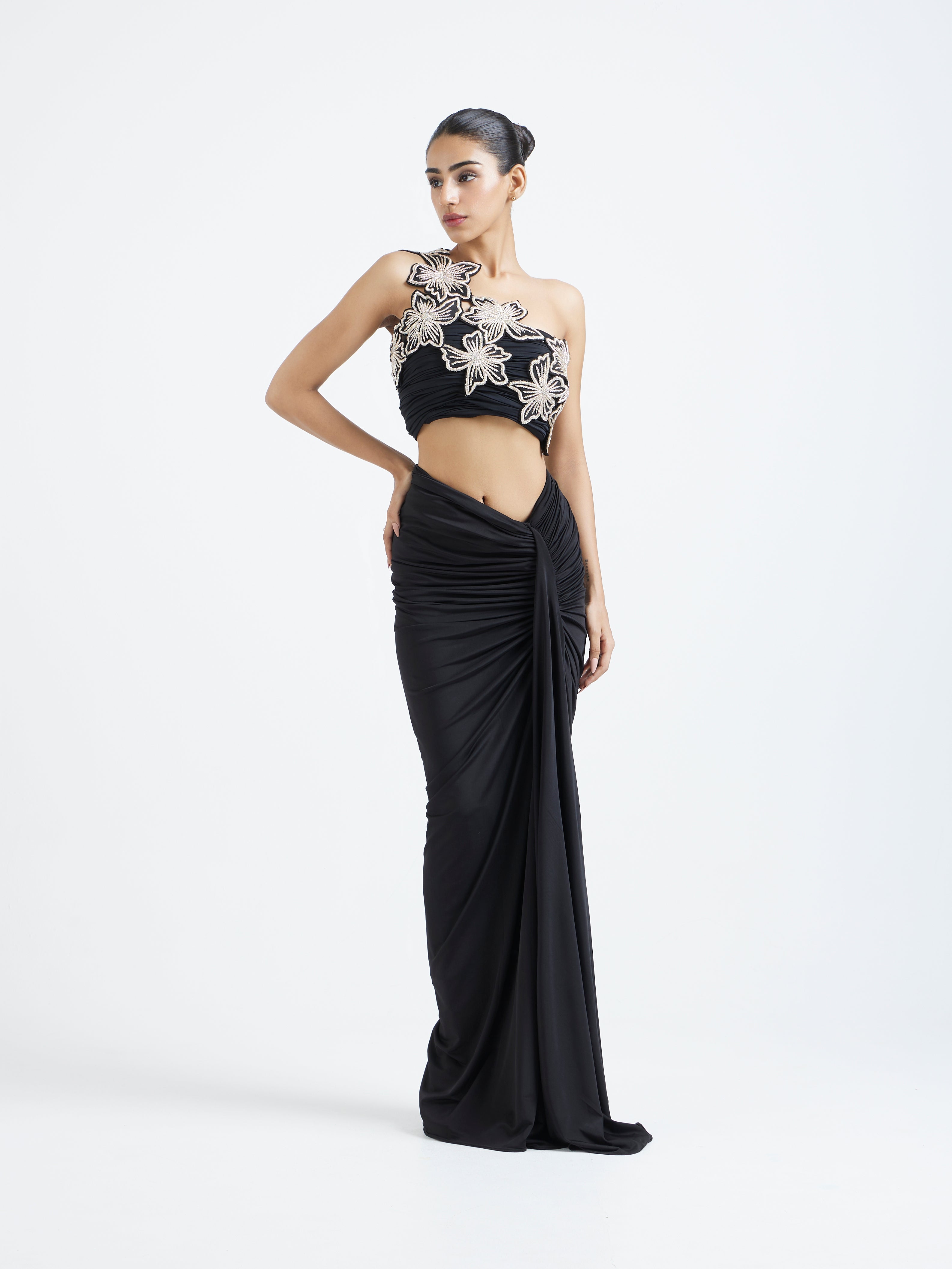 A striking balance of drapes and fluidity, this draped set is paired with a beautifully handcrafted zardozi floral overlay.