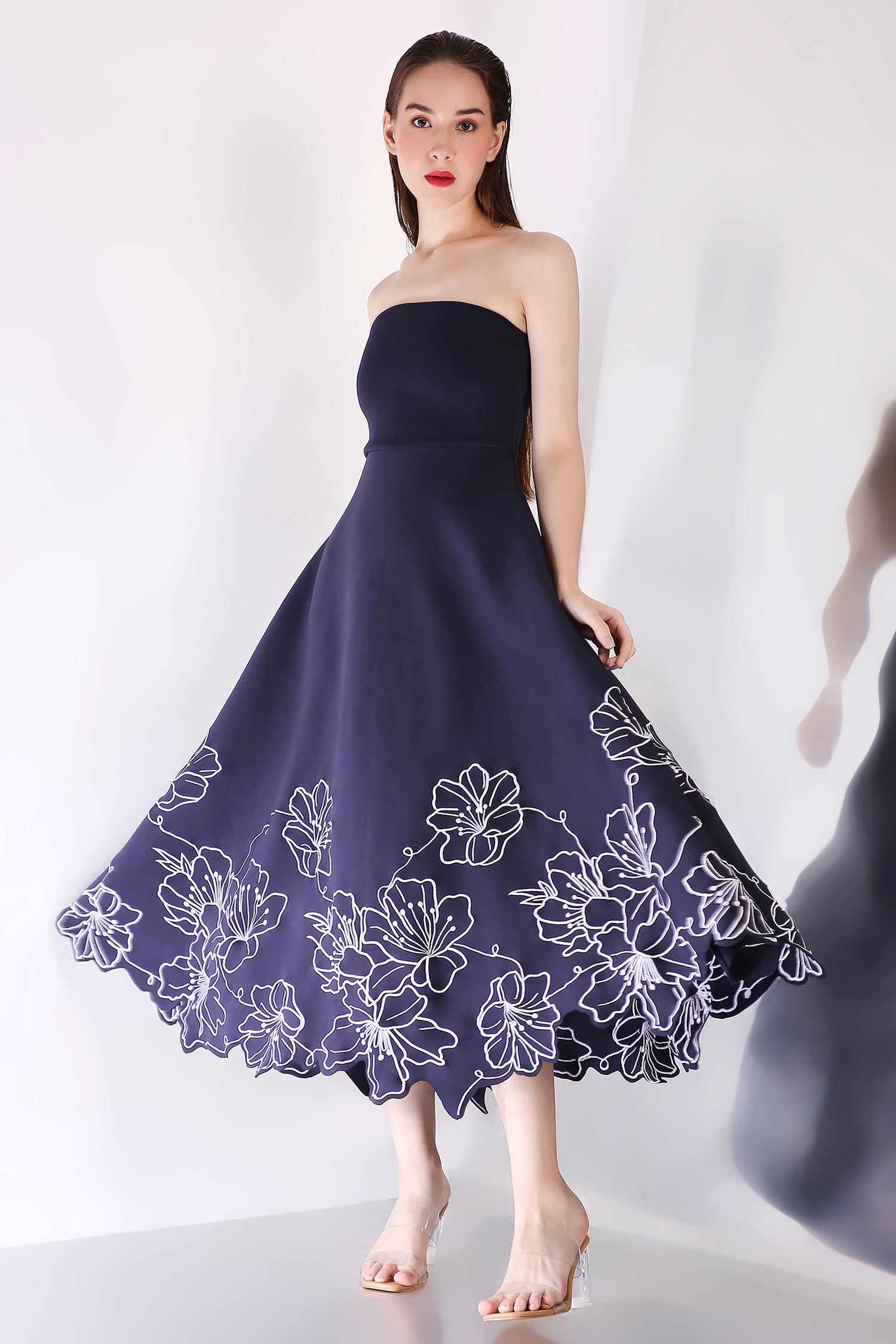 A mid-calf length fit-and-flare dress in premium neoprene, featuring intricate floral rose embroidery along the hem. The delicate, feminine design adds a refined touch to the silhouette, making it a perfect choice for formal occasions. This dress seamlessly combines modern style with classic elegance, creating a timeless statement piece.