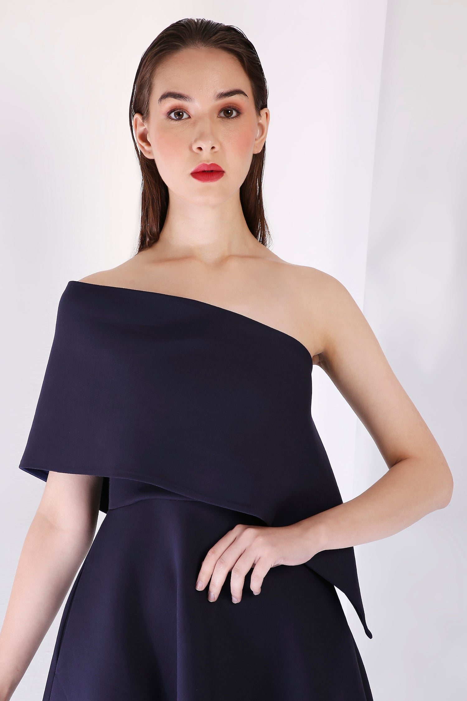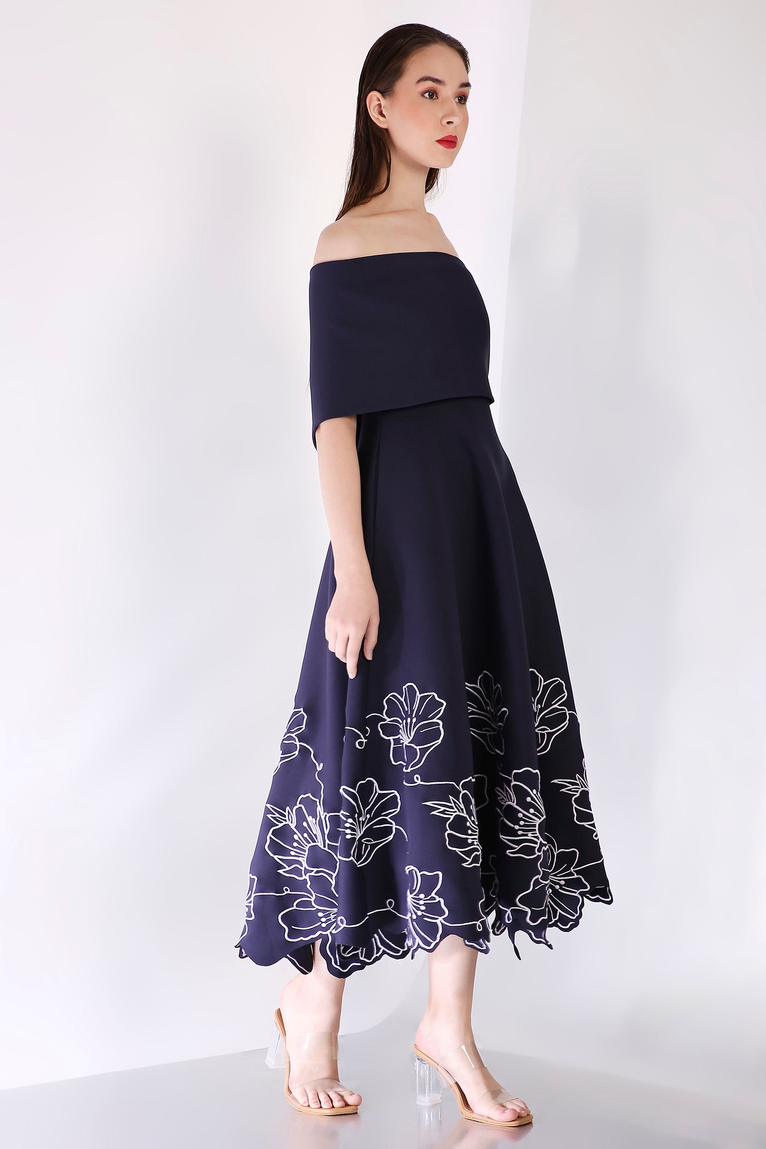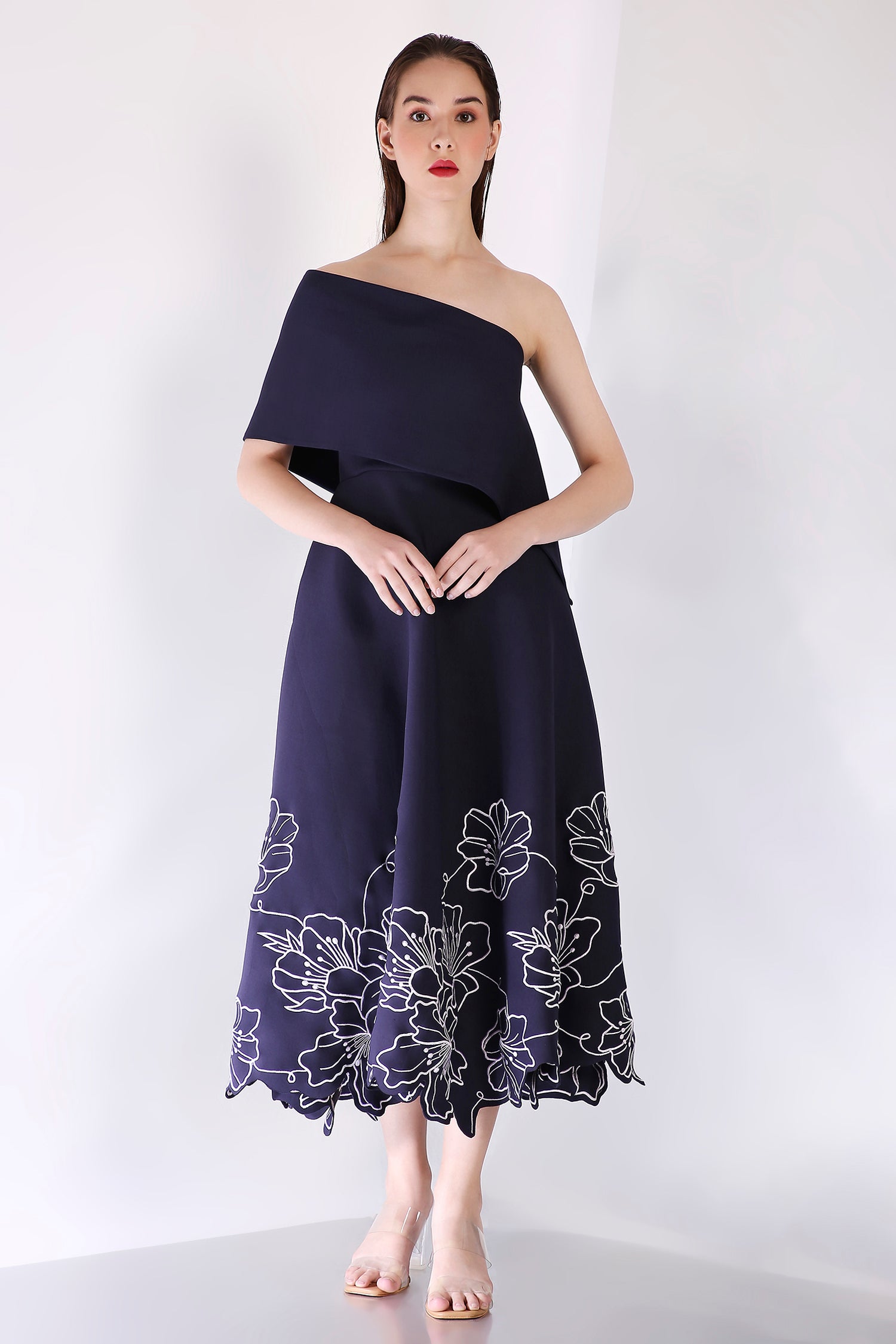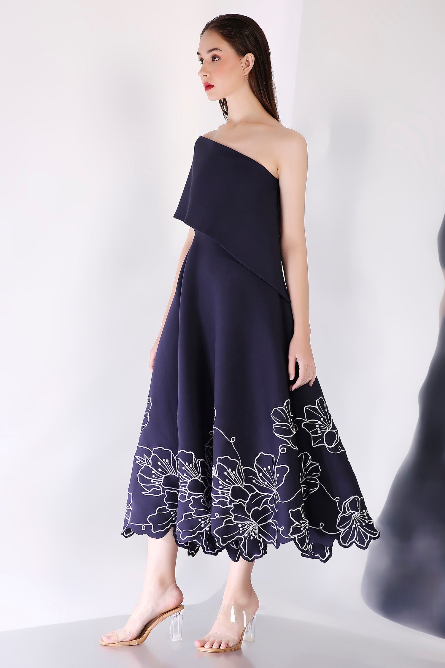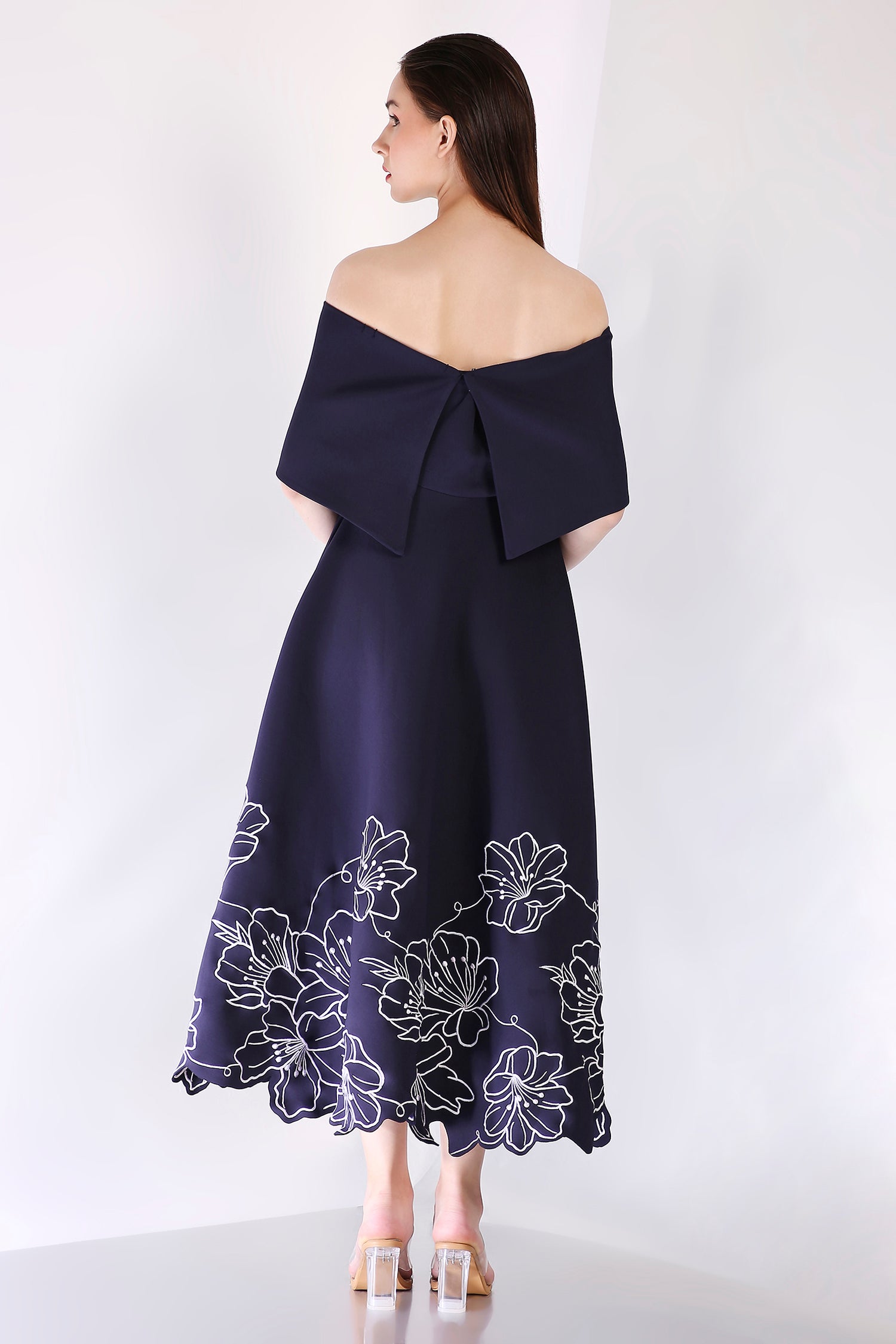 The ensemble is complemented by a versatile classic wrap, which can be styled one-shoulder or off-shoulder, offering the perfect blend of sophistication and flexibility—ideal for any formal occasion.