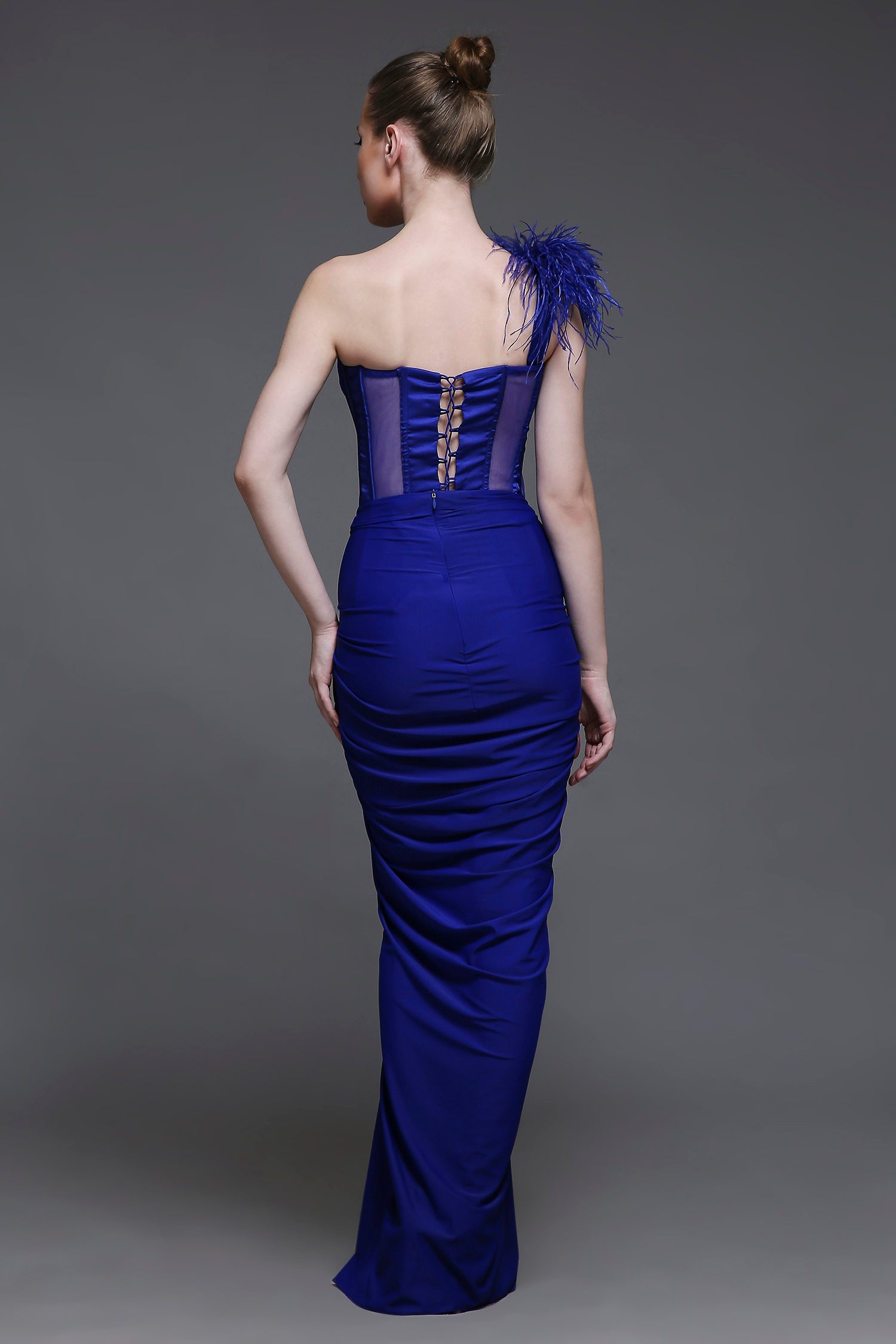 Our Georgia Set combines elegance and structure, featuring a corset with detailed cups, mesh panels, and a tie-up back for a customizable fit. The matching draped skirt is enhanced with subtle ruching for a flattering silhouette. Adding a bold touch, the set includes a one-shoulder detachable feather strap, elevating the look with a chic and playful detail. Perfect for making a statement at any special occasion.