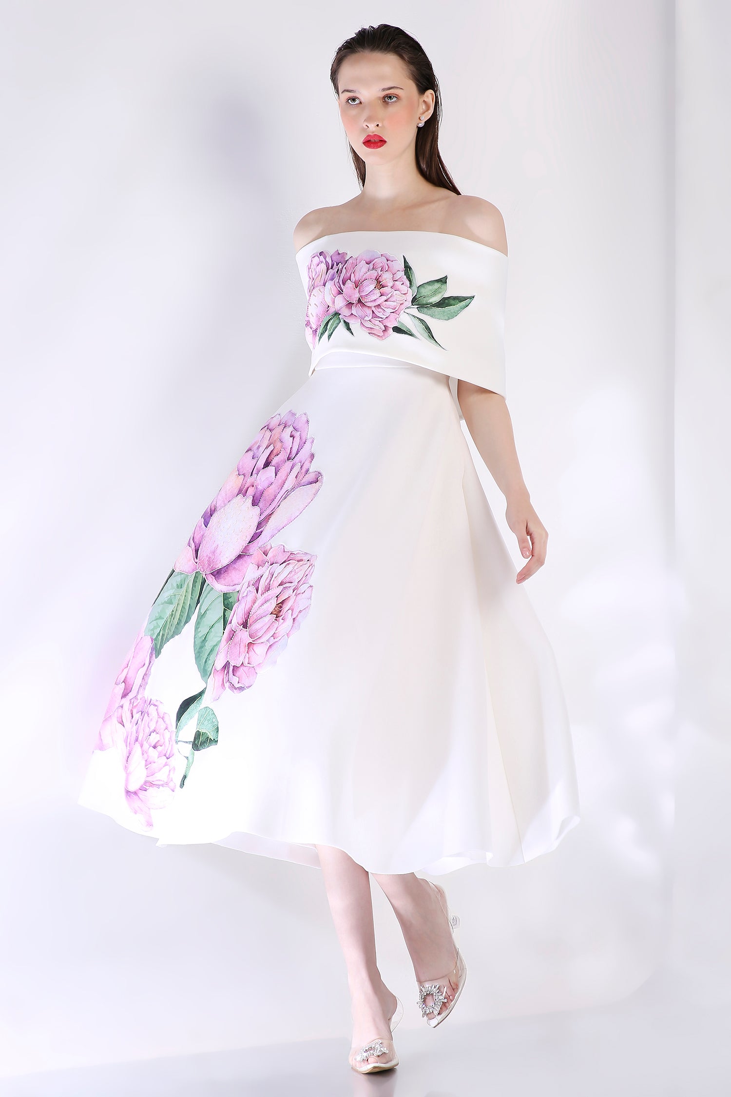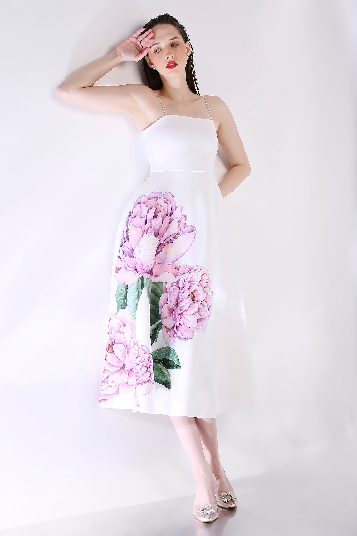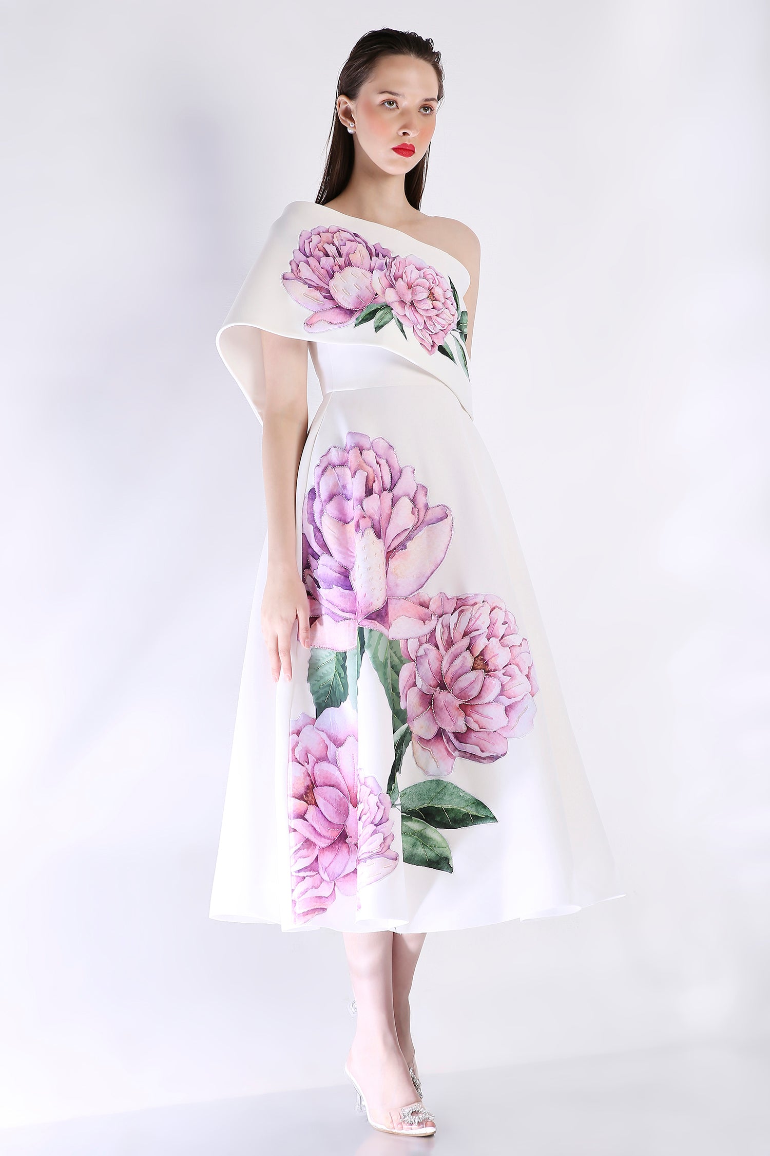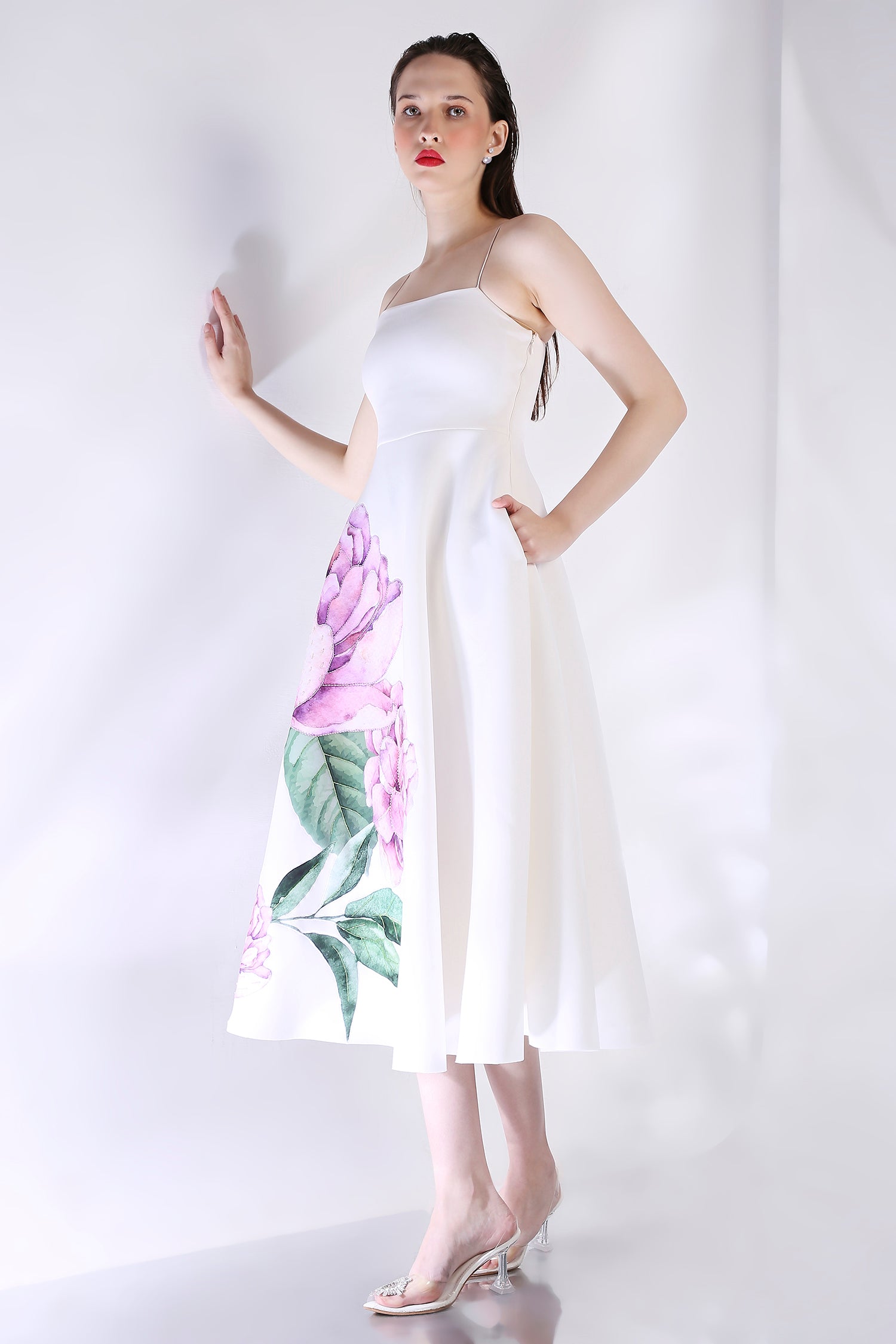The Nyra dress embodies elegance with its floral design, emphasised with appliqué work and hand embroidered with beads and sequins.