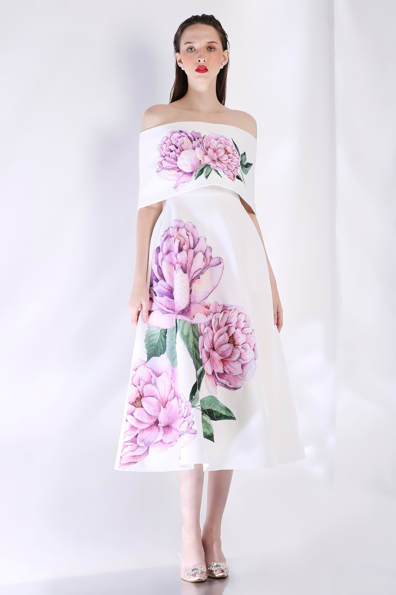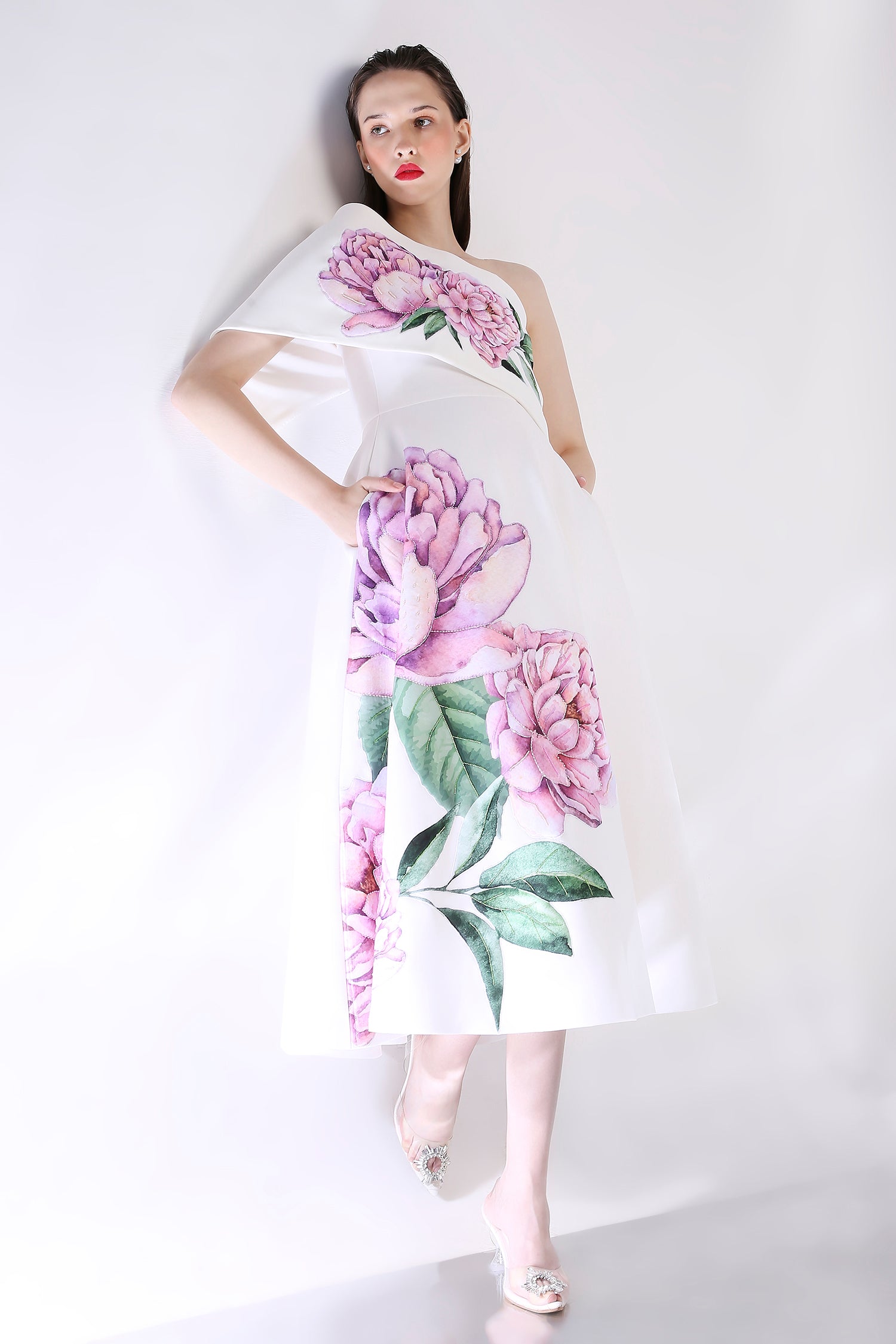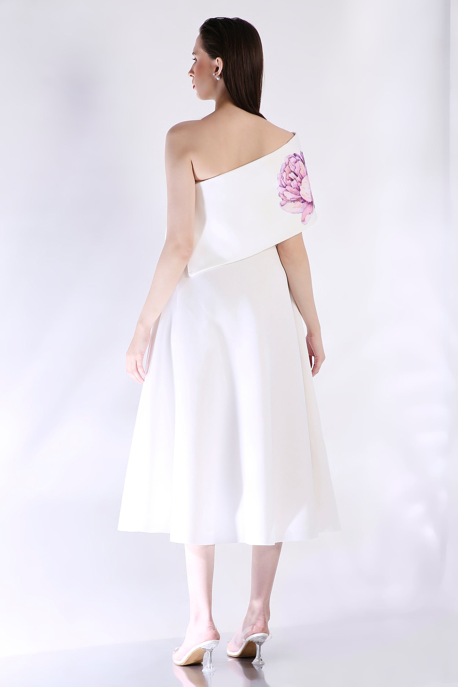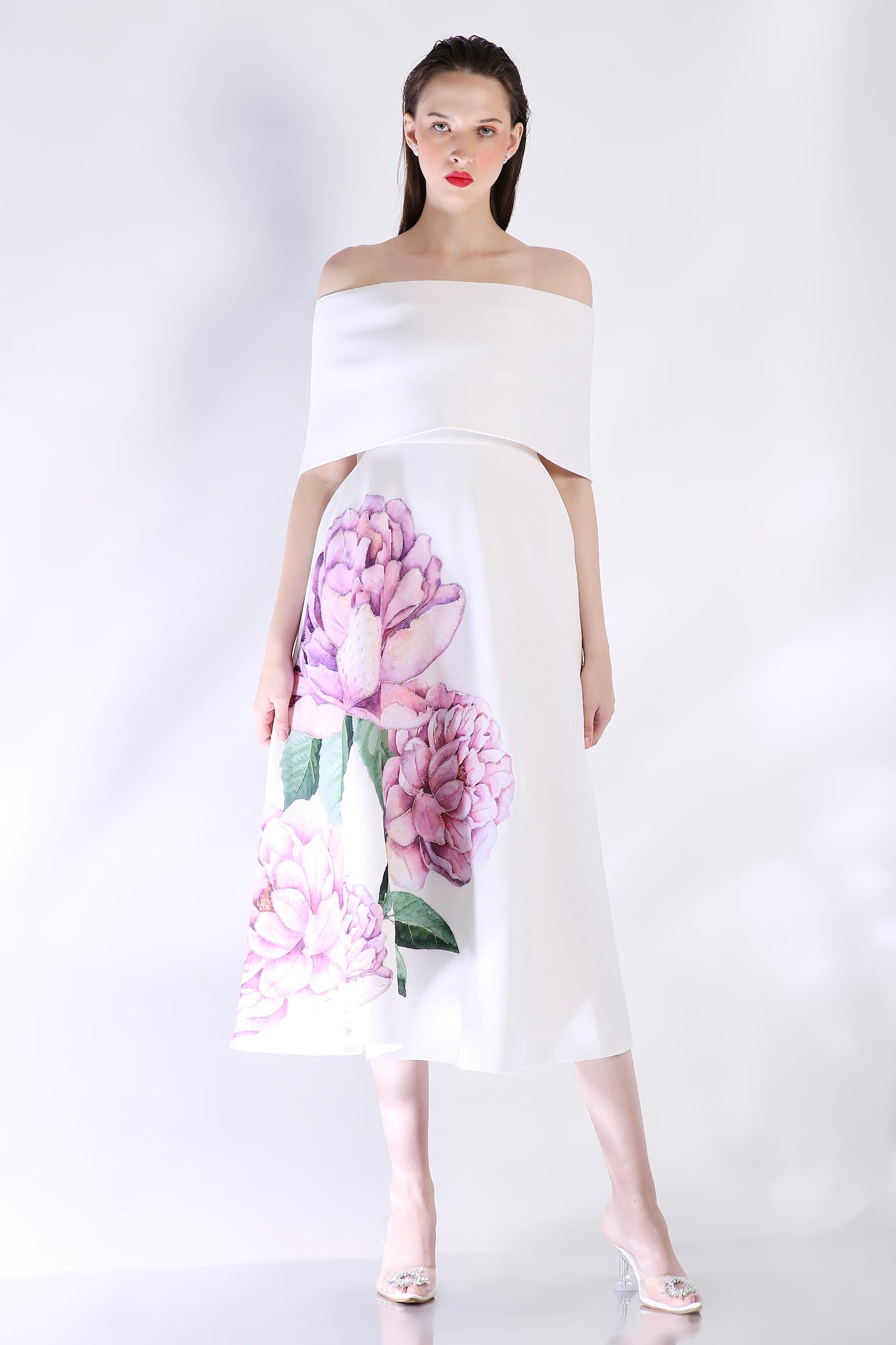The Nyra dress embodies elegance with its floral design, emphasised with appliqué work and hand embroidered with beads and sequins.