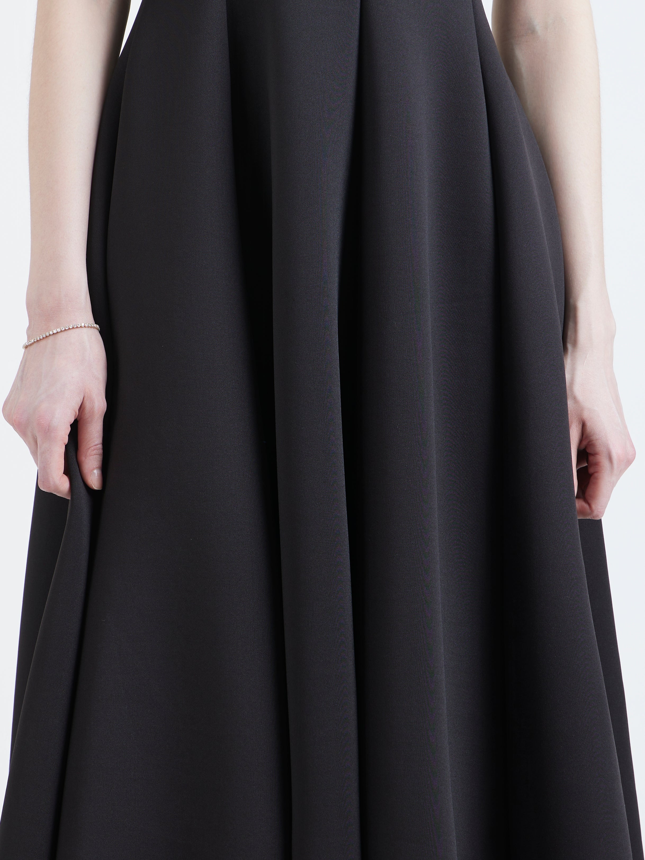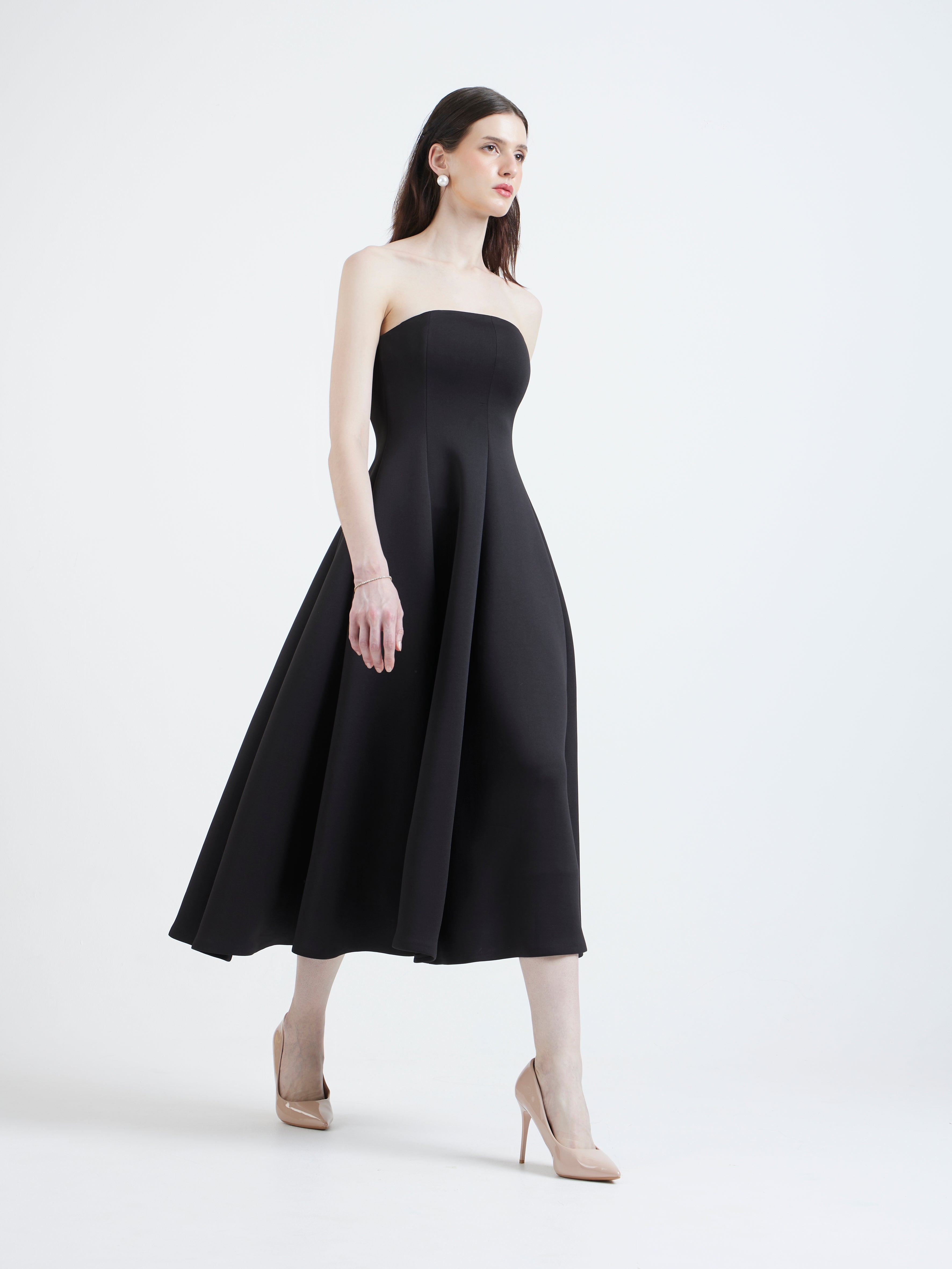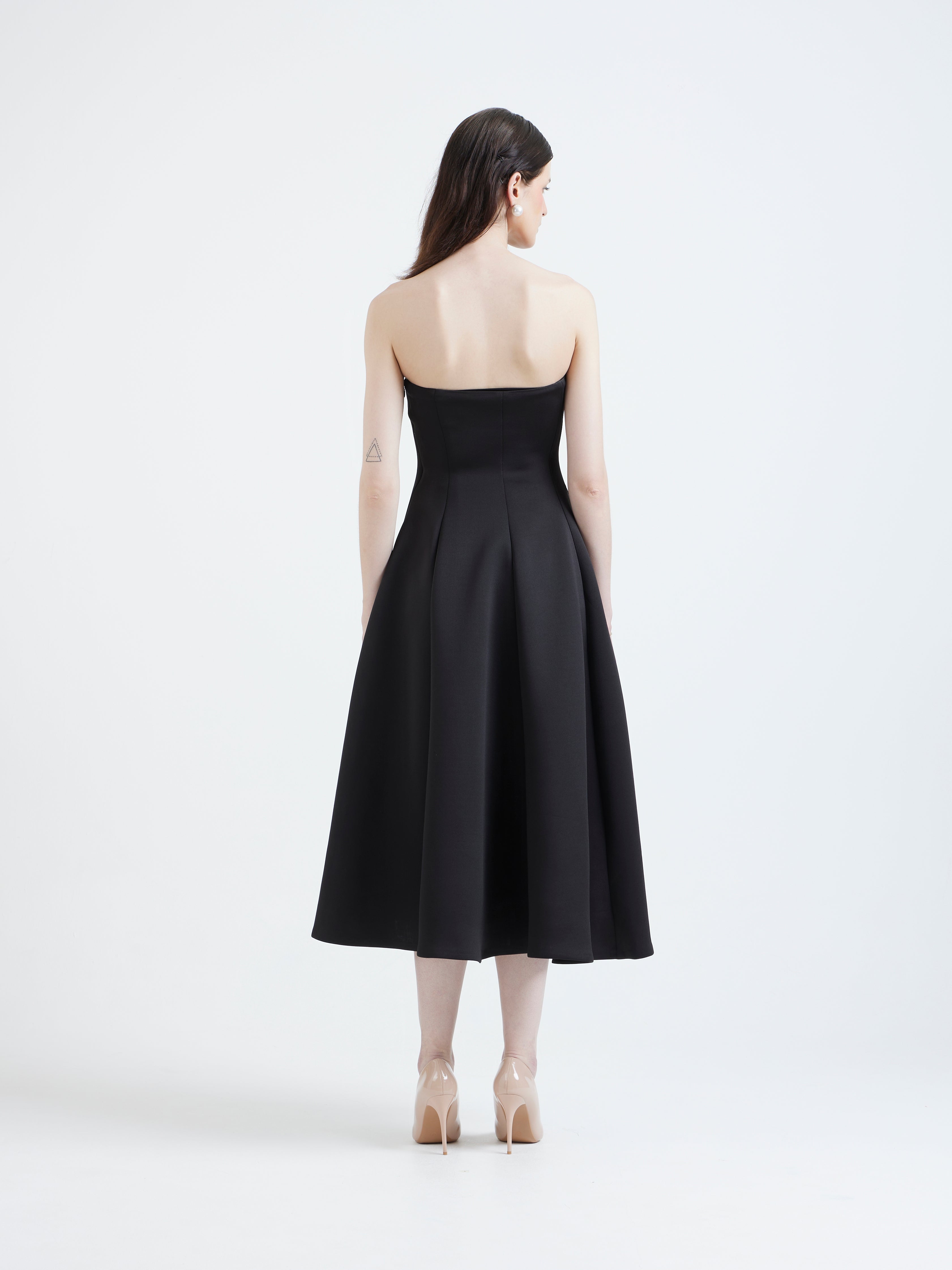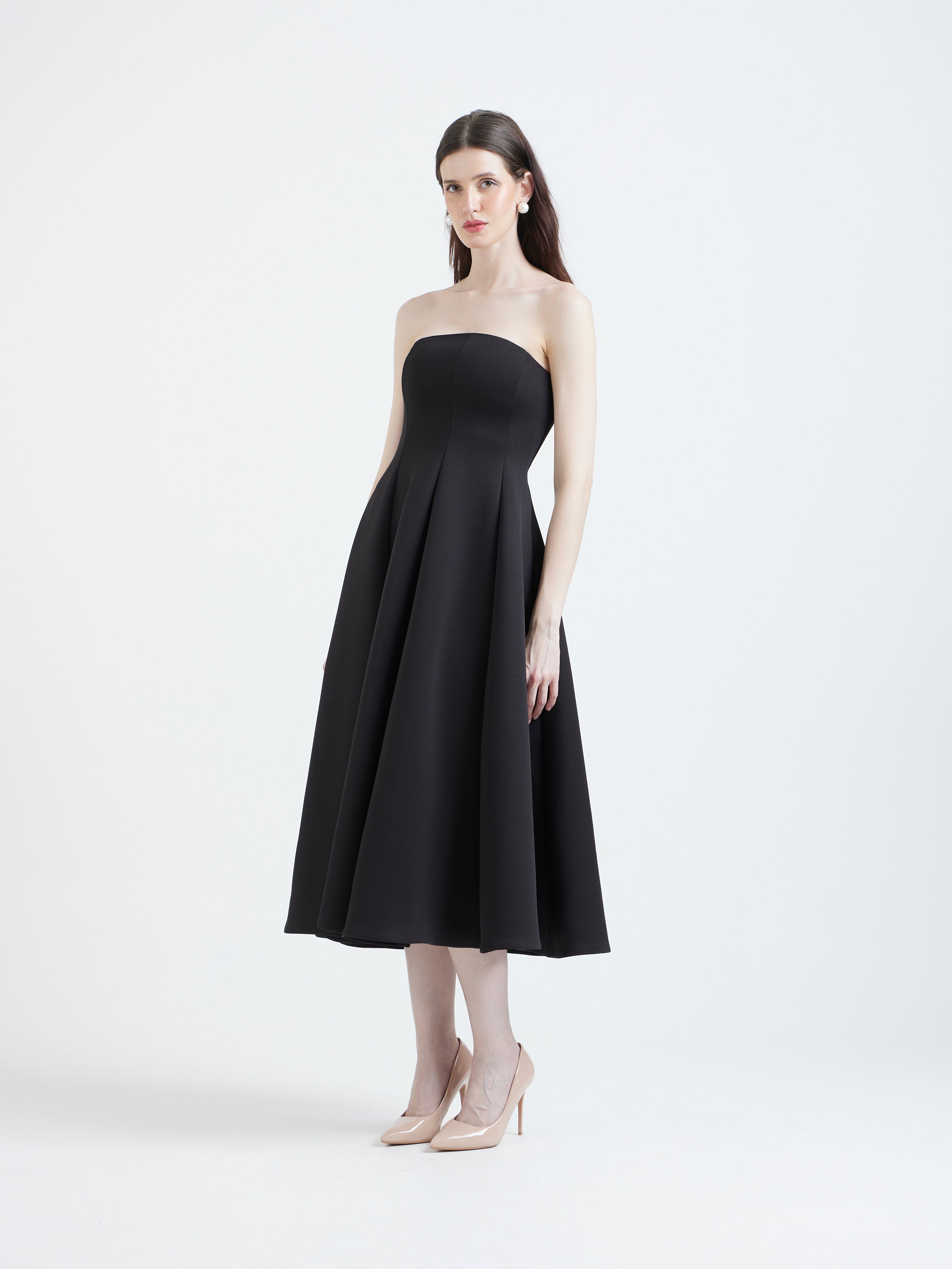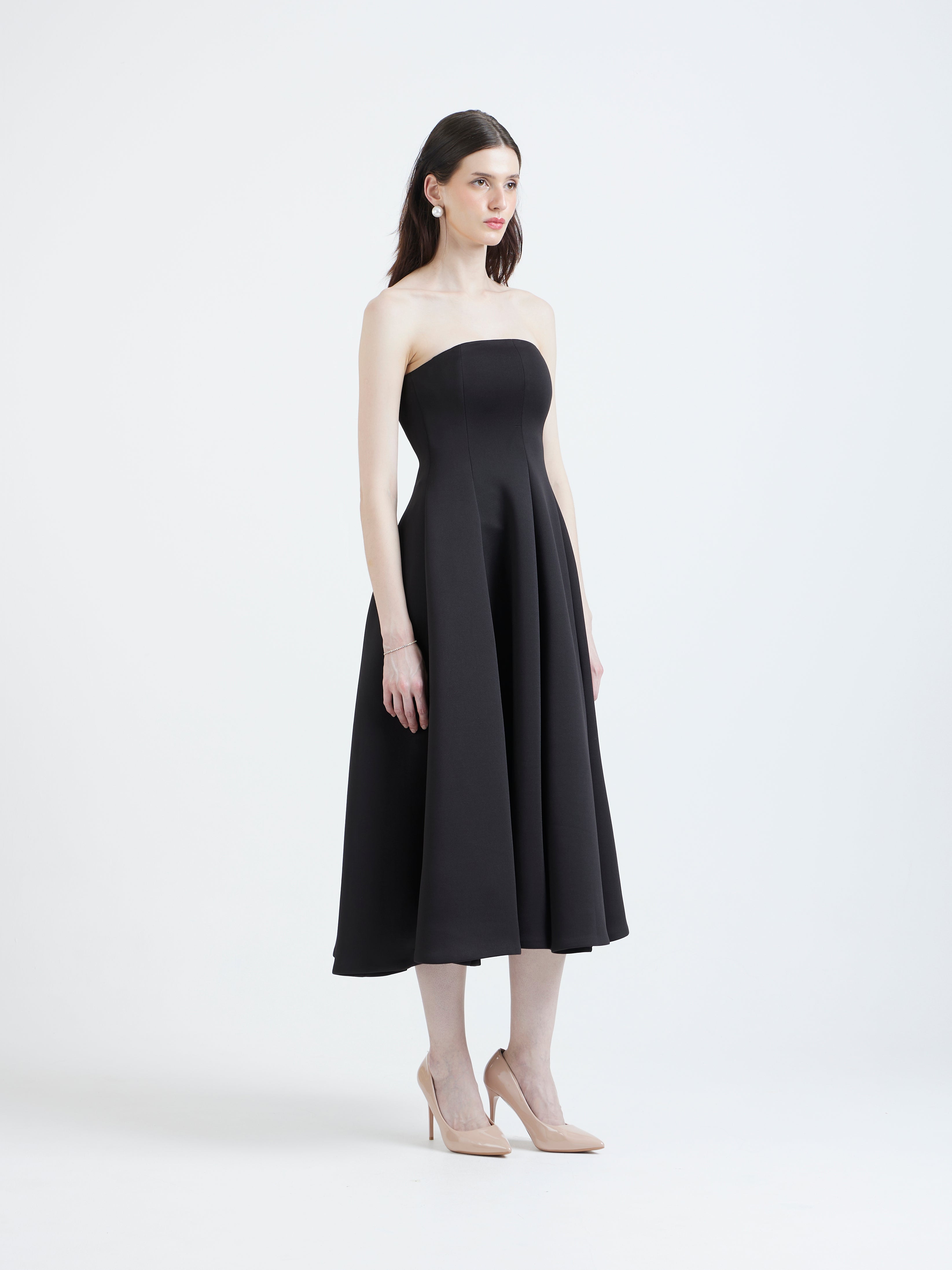 Its classic fit-and-flare silhouette is defined by a strapless bodice and a voluminous skirt, tailored to cinch at the natural waist. This versatile garment is designed to be instantly personalised using our Detachable Overlays, transitioning the sophisticated black look seamlessly across seasons and occasions.