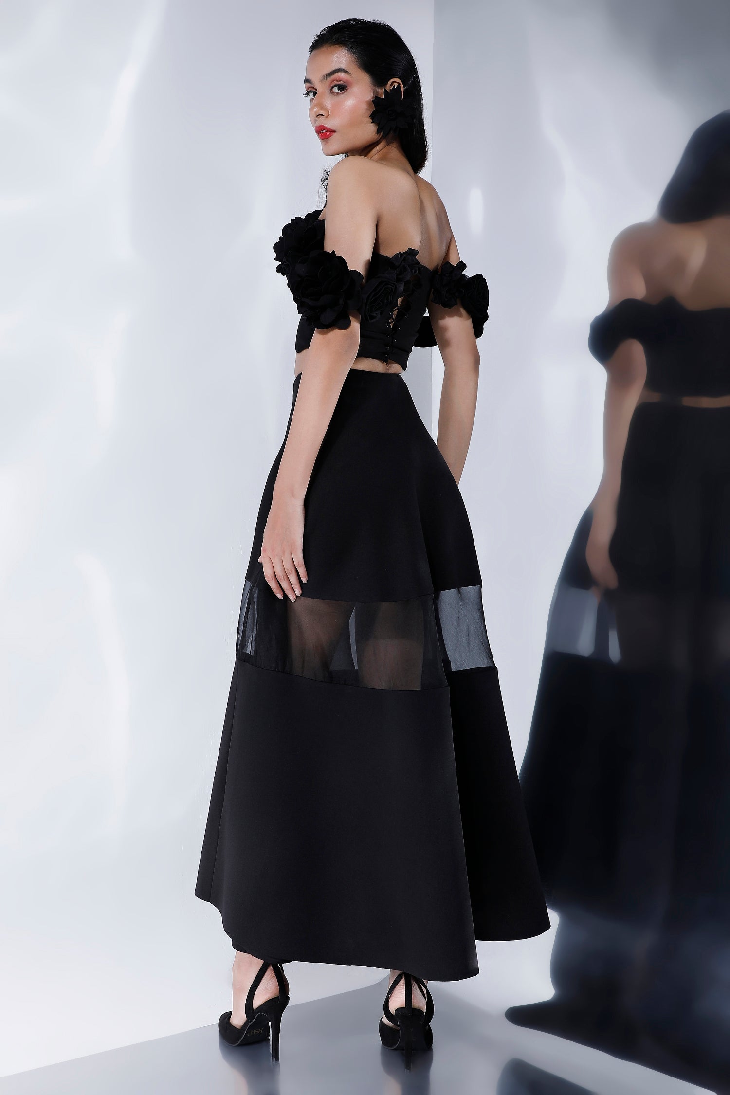 The fit and flare skirt flows away from the body, giving it a structured fall due to the nature of the fabric. The sheer organza inset gives an alluring effect.