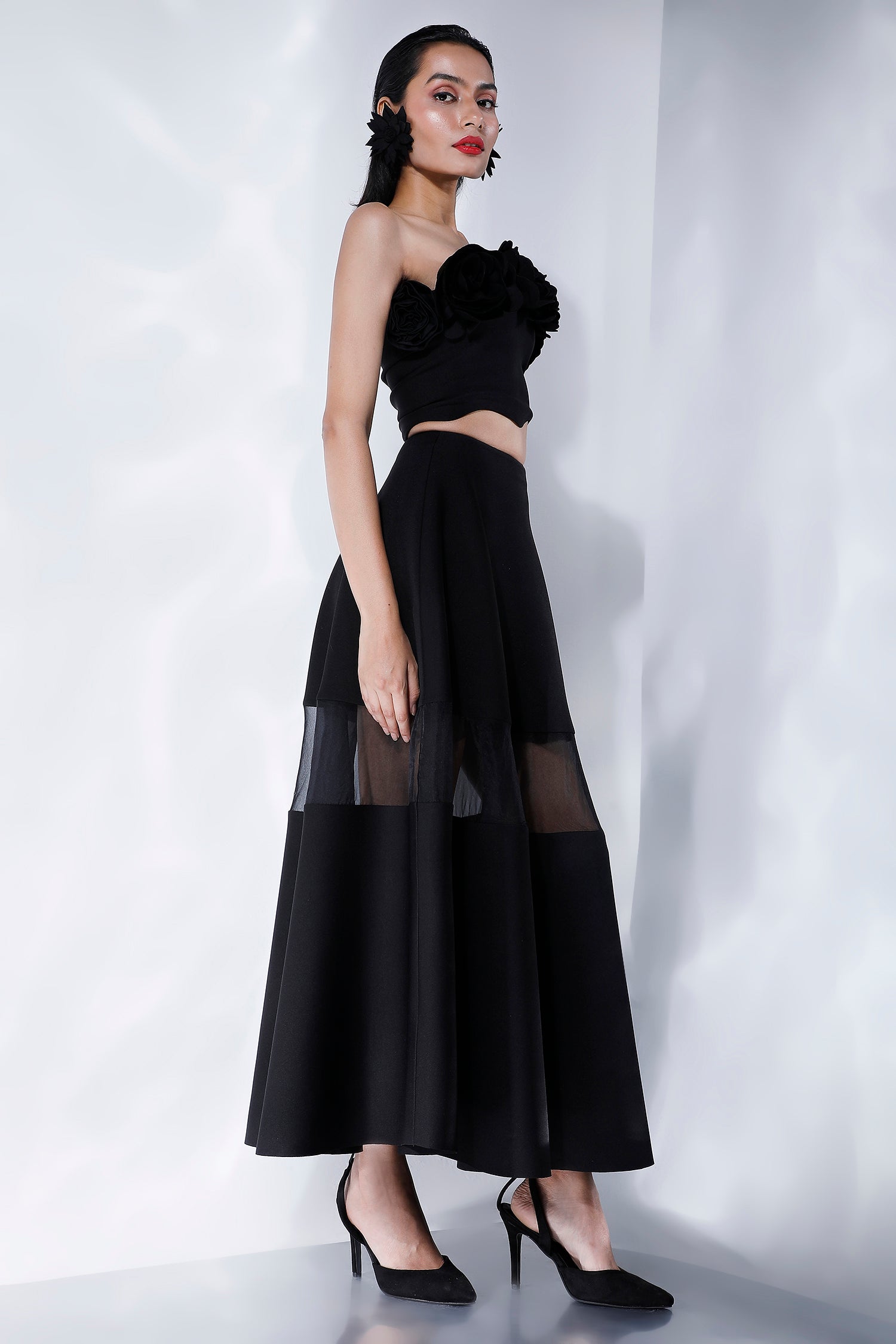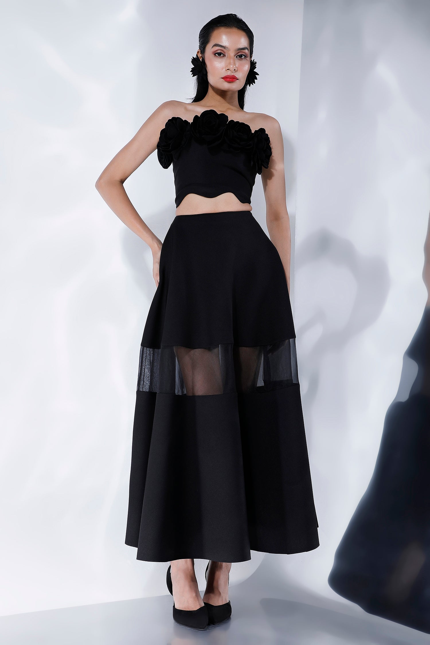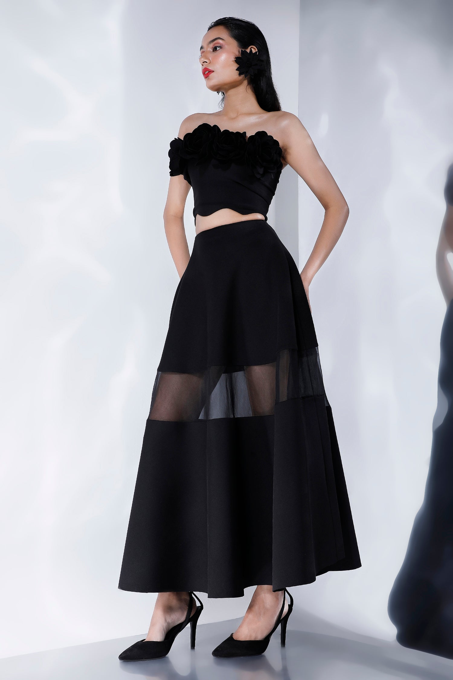 Featuring a fit and flare skirt which flows away from the body, giving it a structured fall due to the nature of the fabric. The sheer organza inset gives an alluring effect.