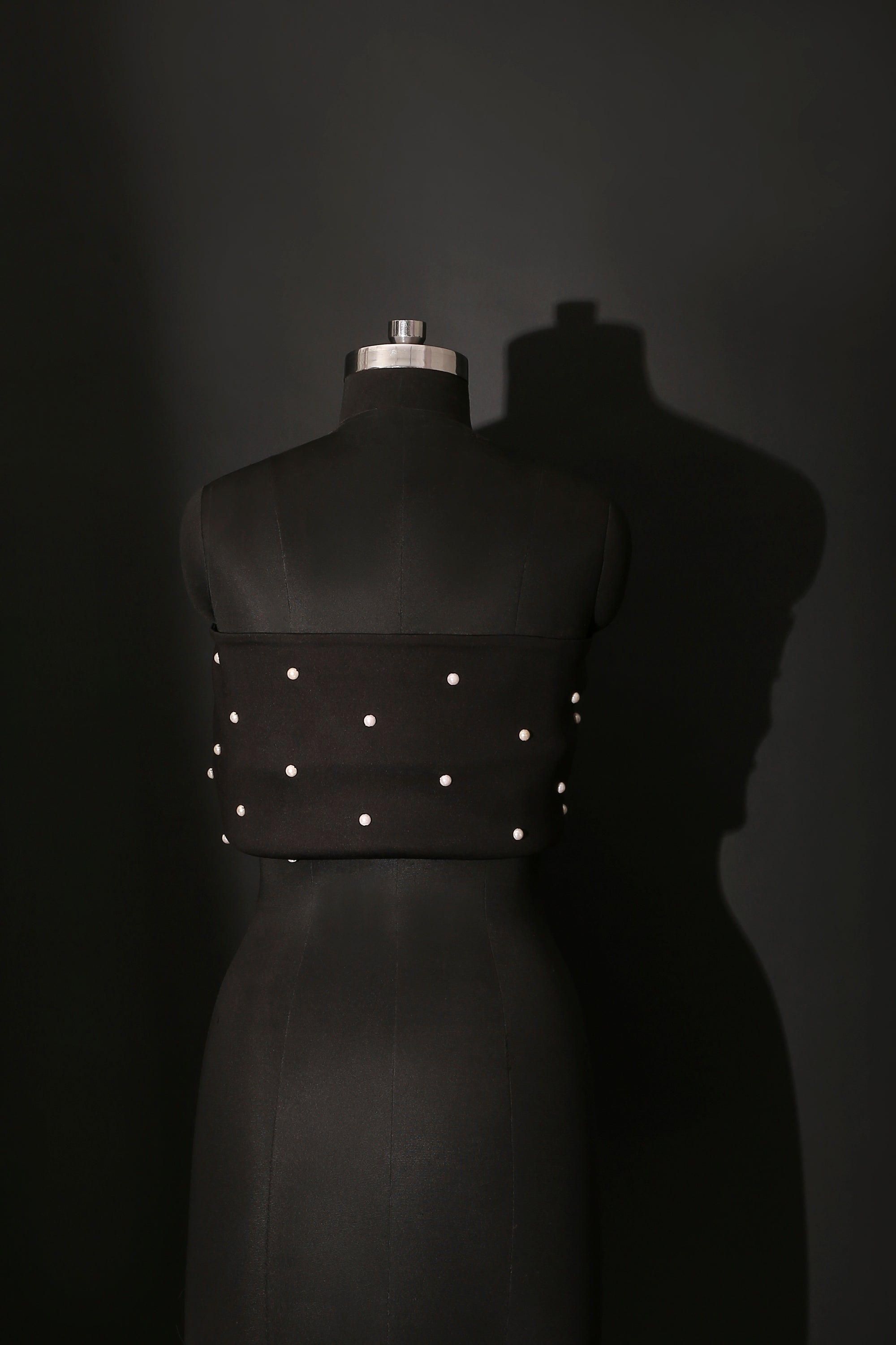 Hand-embellished pearls are delicately scattered across the surface, adding a refined pop that contrasts effortlessly with the matte richness of the scuba.