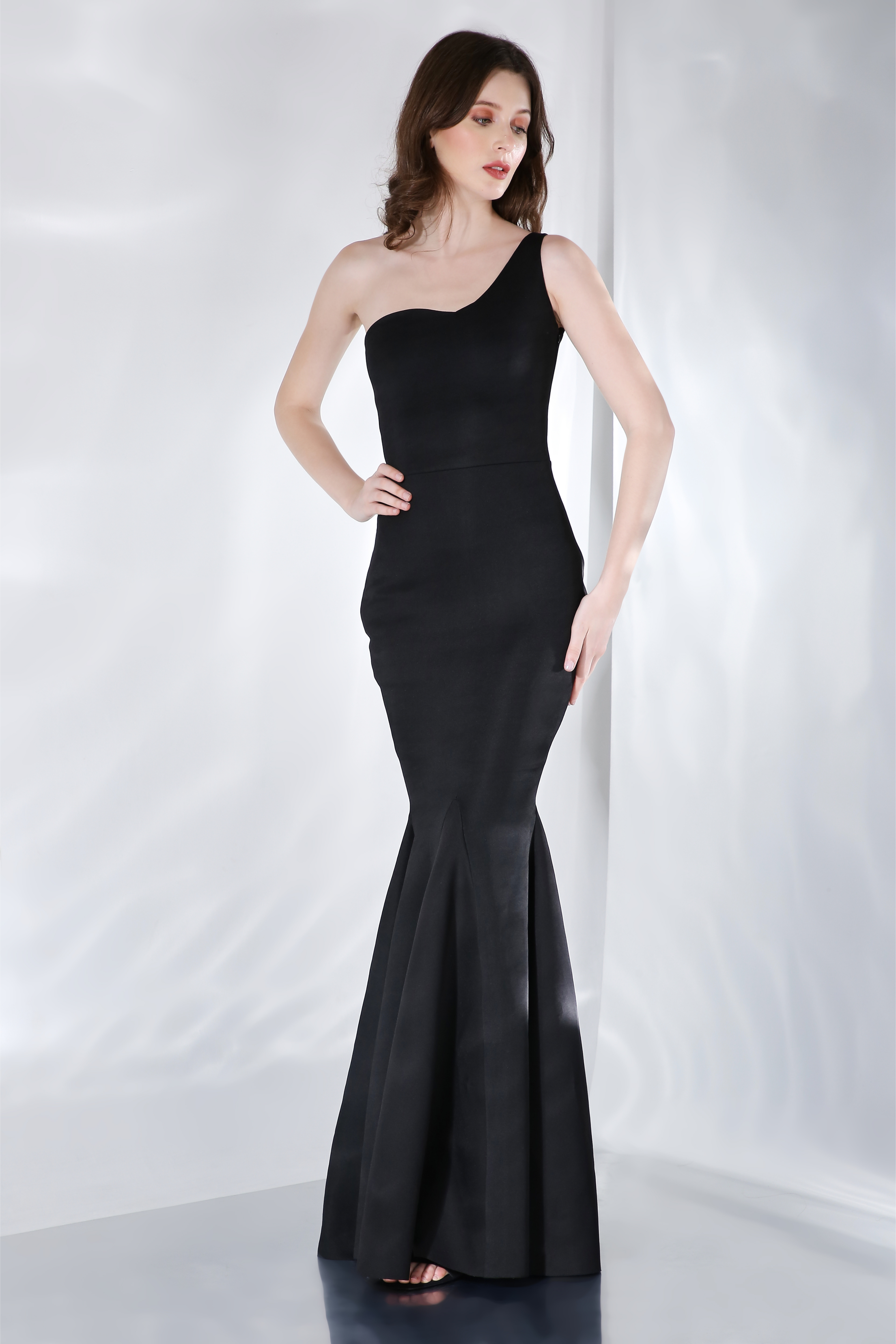 Featuring a one shoulder panelled gown which accentuates your body in a fish cut silhouette. Hugging all your curves perfectly with a flattering fit, since is a made-to-measure product, you can also specify the exact length desired by you.