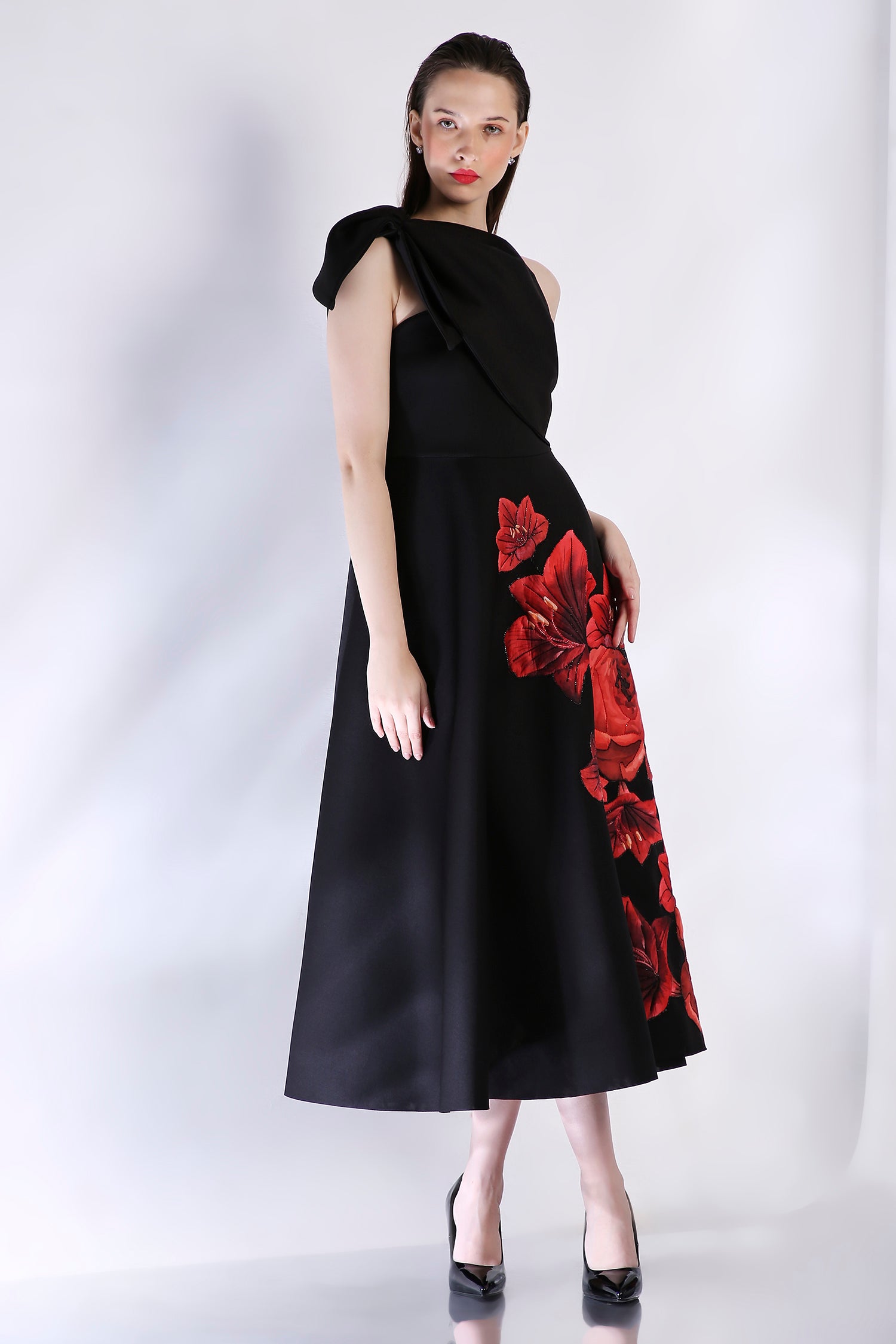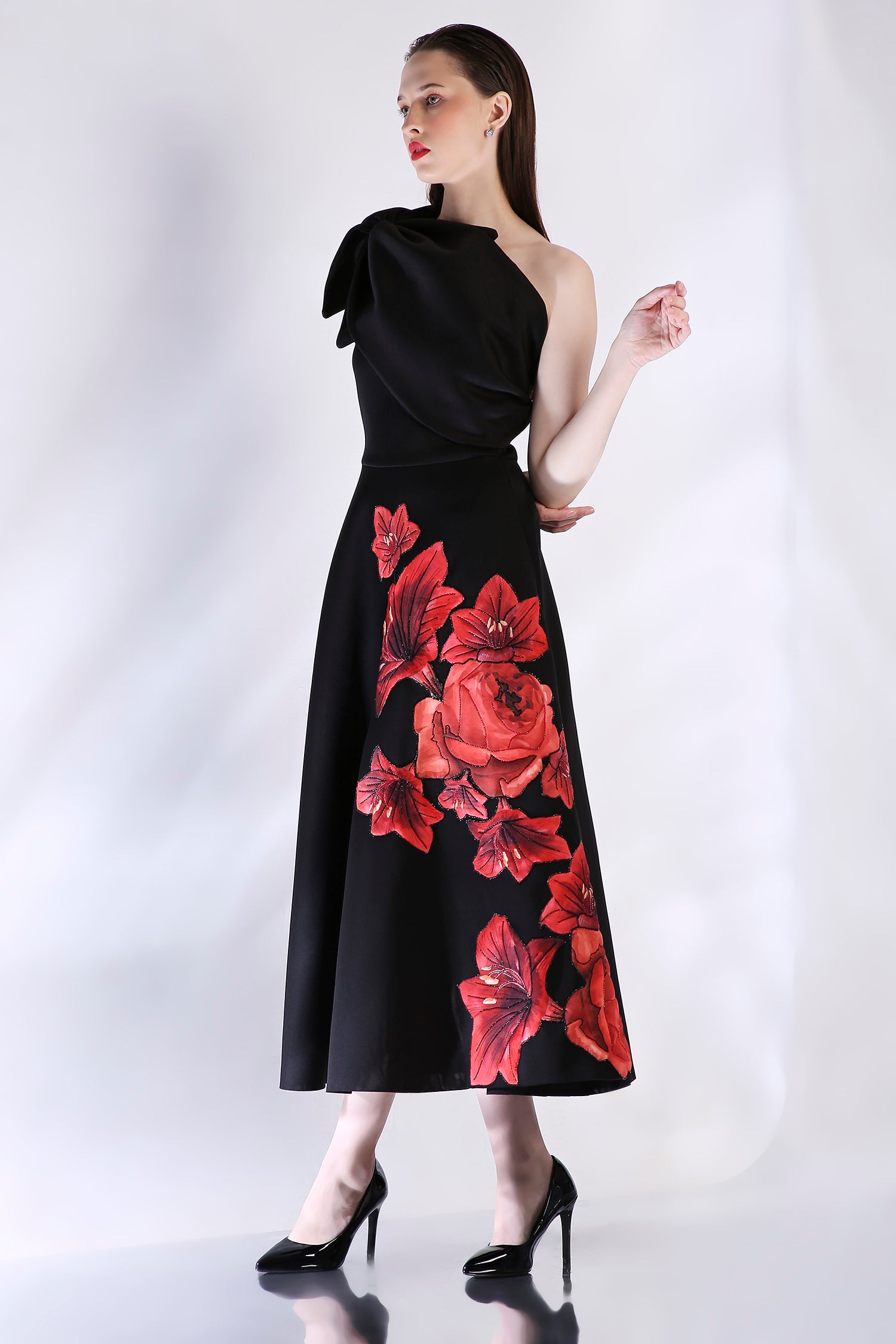 The Riva dress is adorned with floral appliqué work, emphasised with glass beads and sequins, all intricately embroidered on the dress.