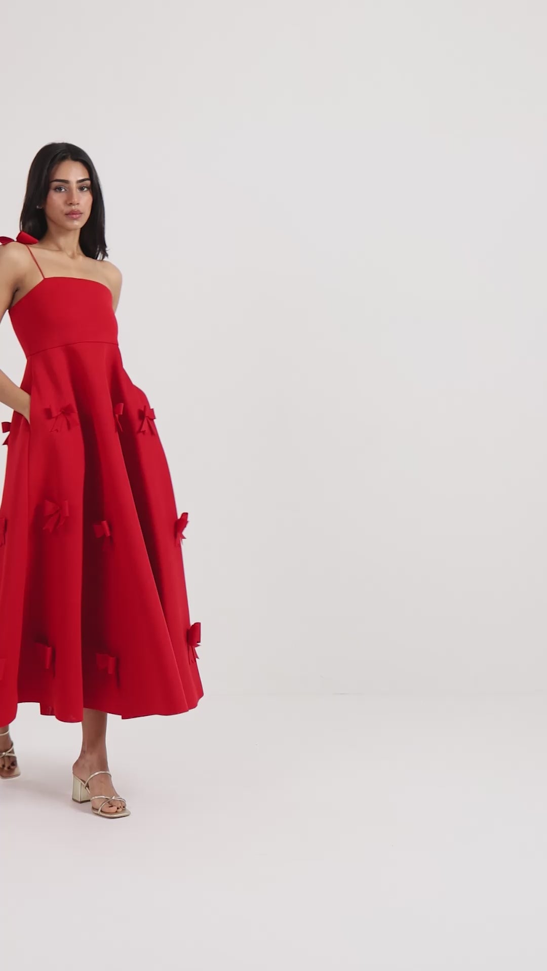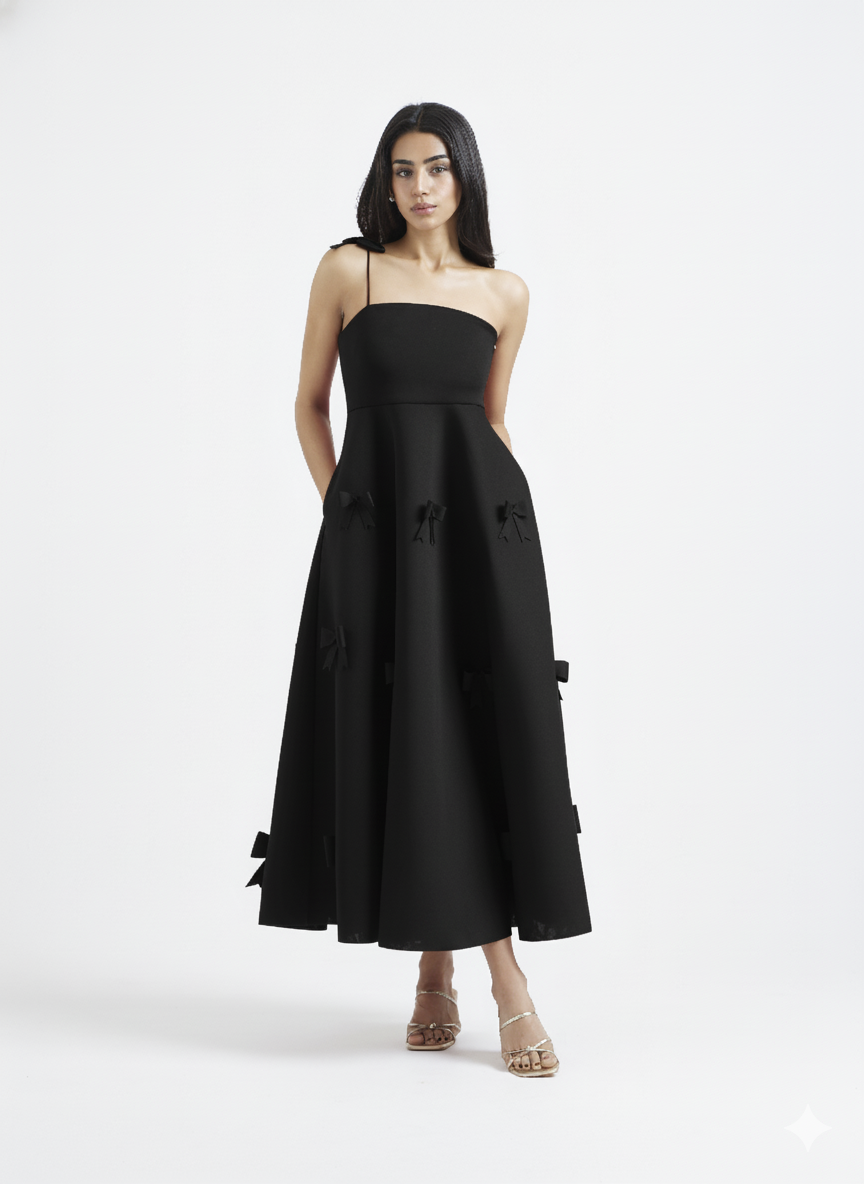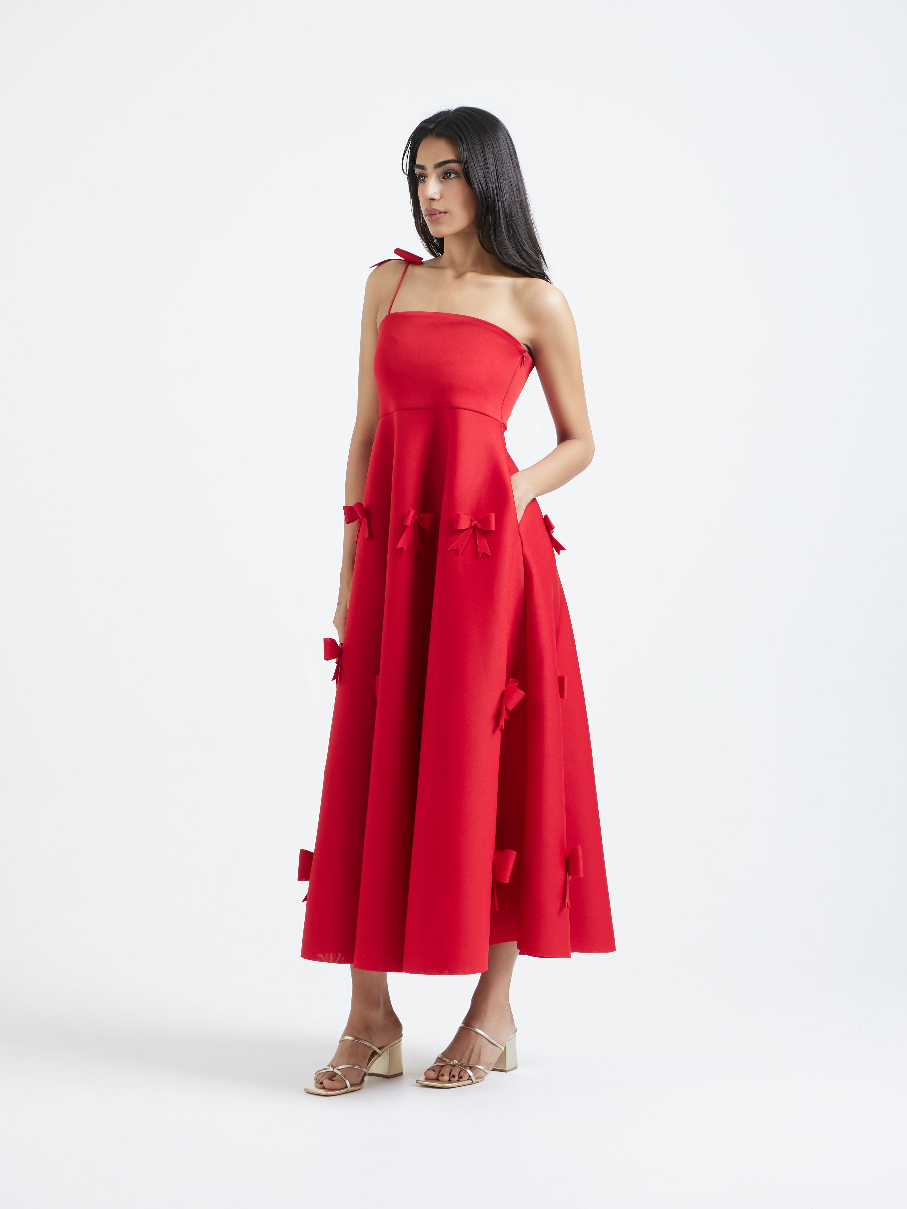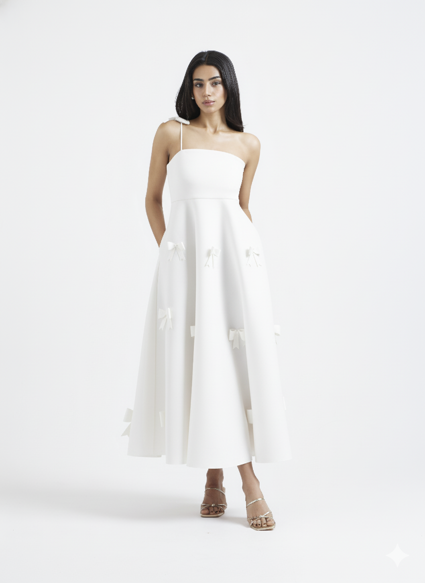 An exquisite fit-and-flare midi dress, rendered in luminous scarlet. It features a graceful straight neckline and a delicate bow strap. The flare is adorned with meticulously placed three-dimensional bow appliques, creating a look of pure, unforgettable elegance.