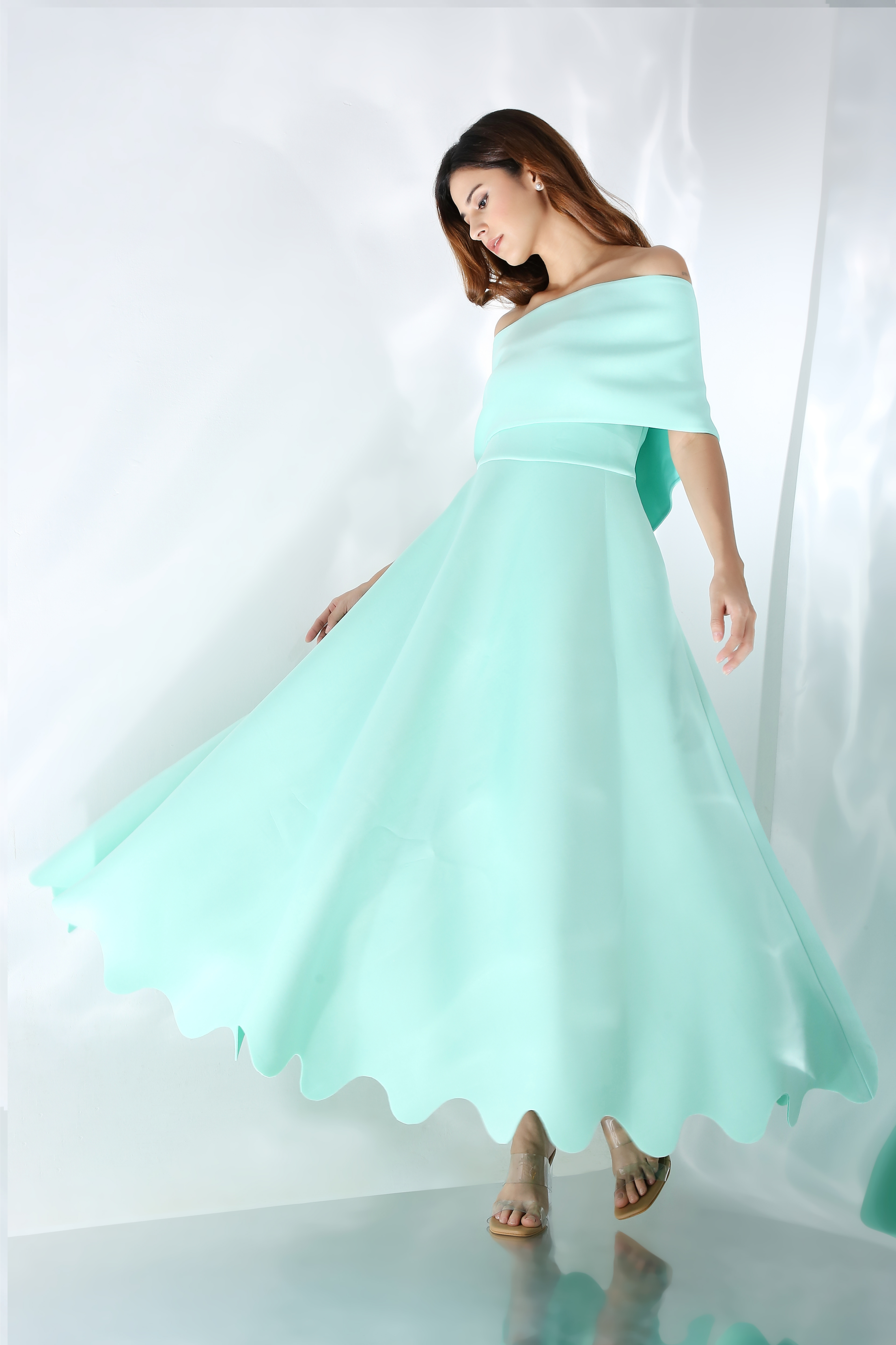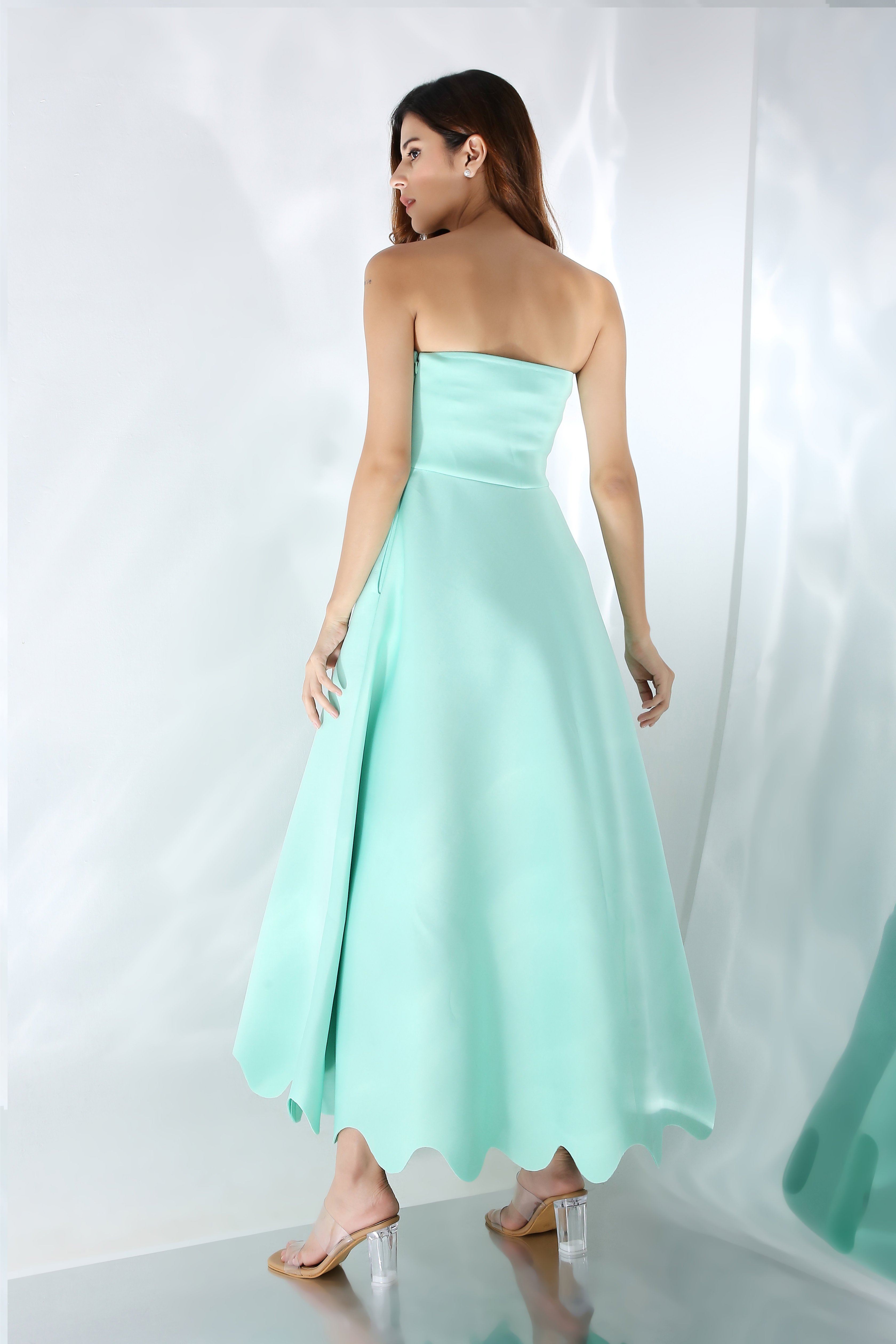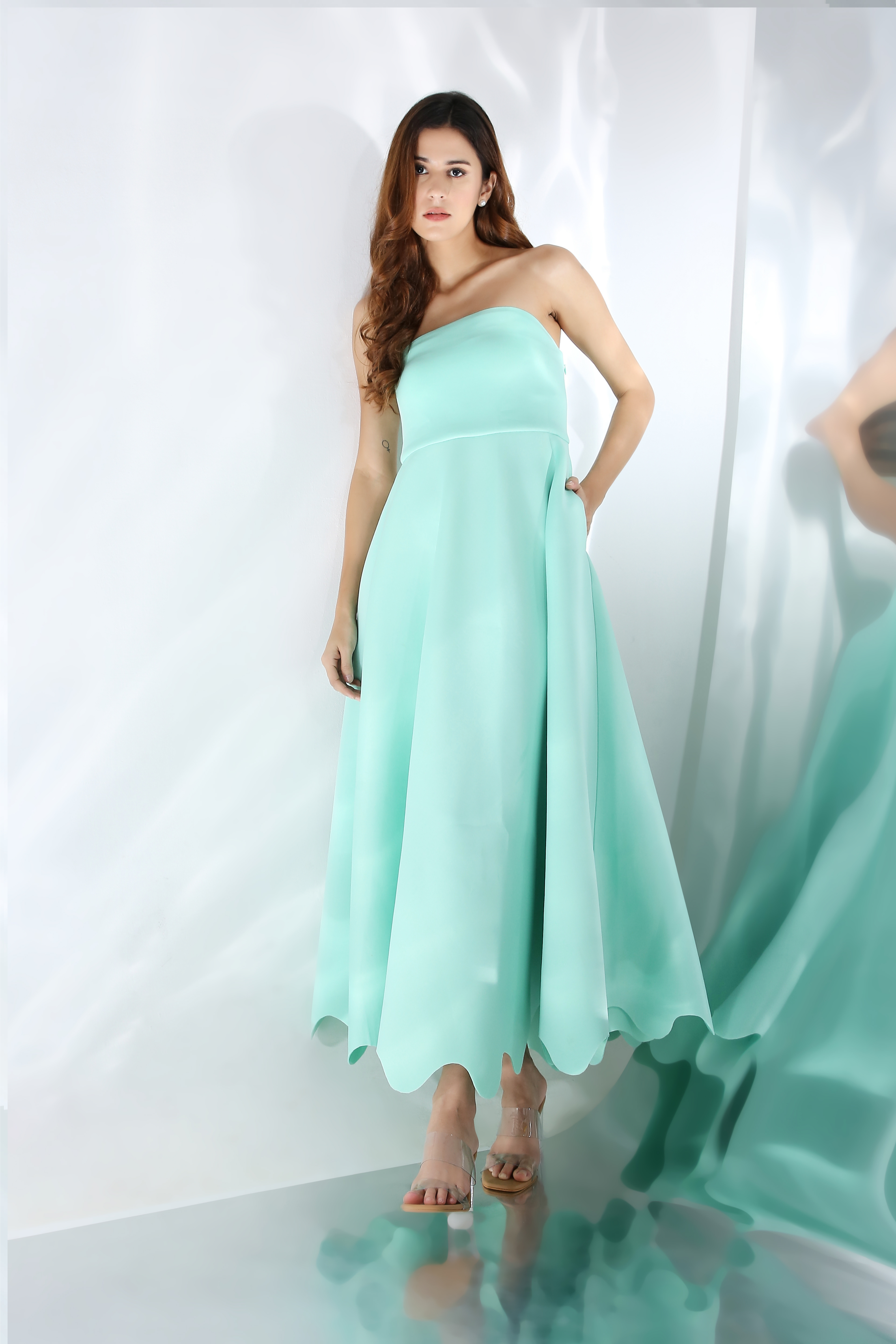 Featuring a fit and flare dress with scallops on the base. Wear it in two ways,