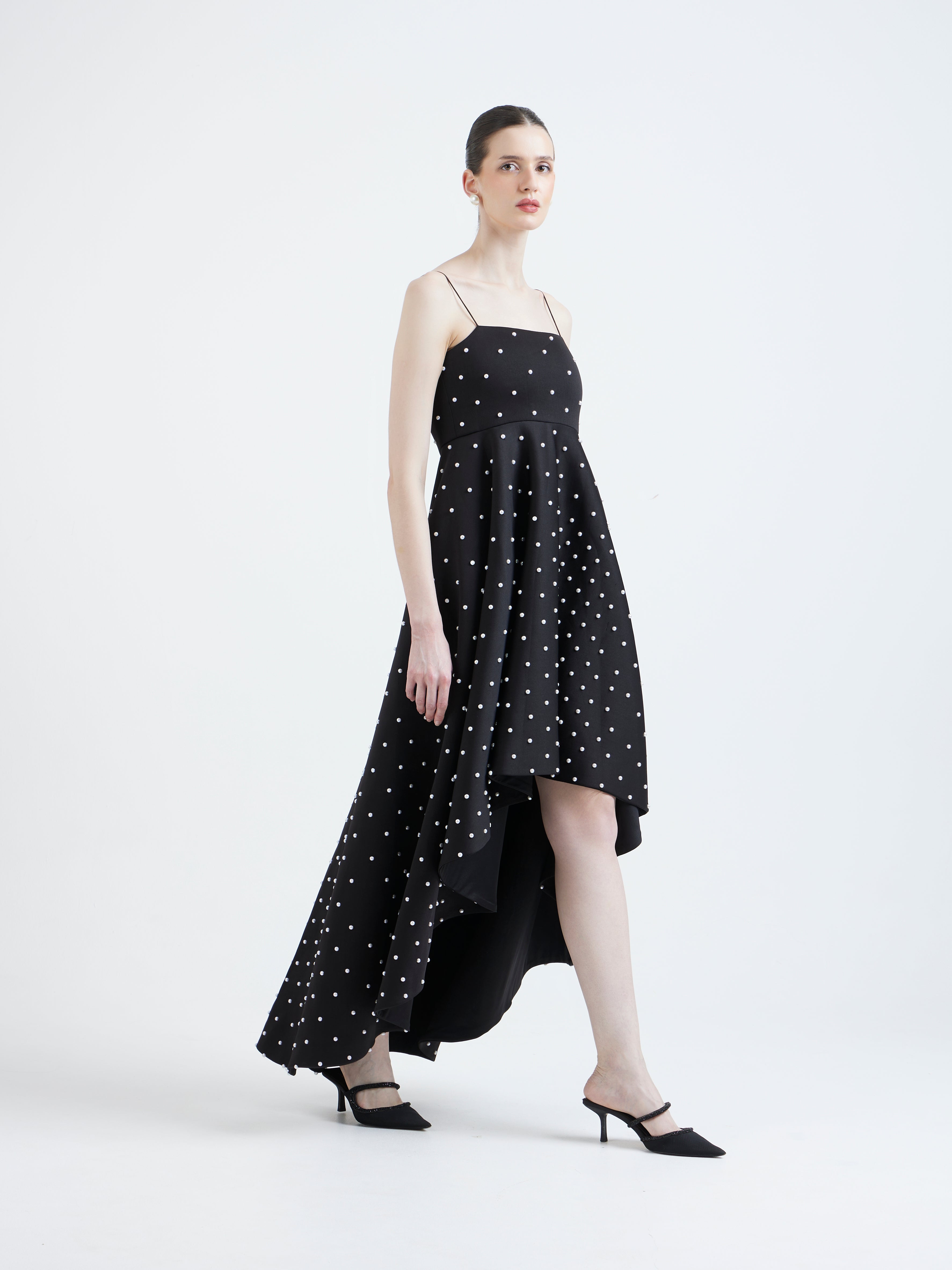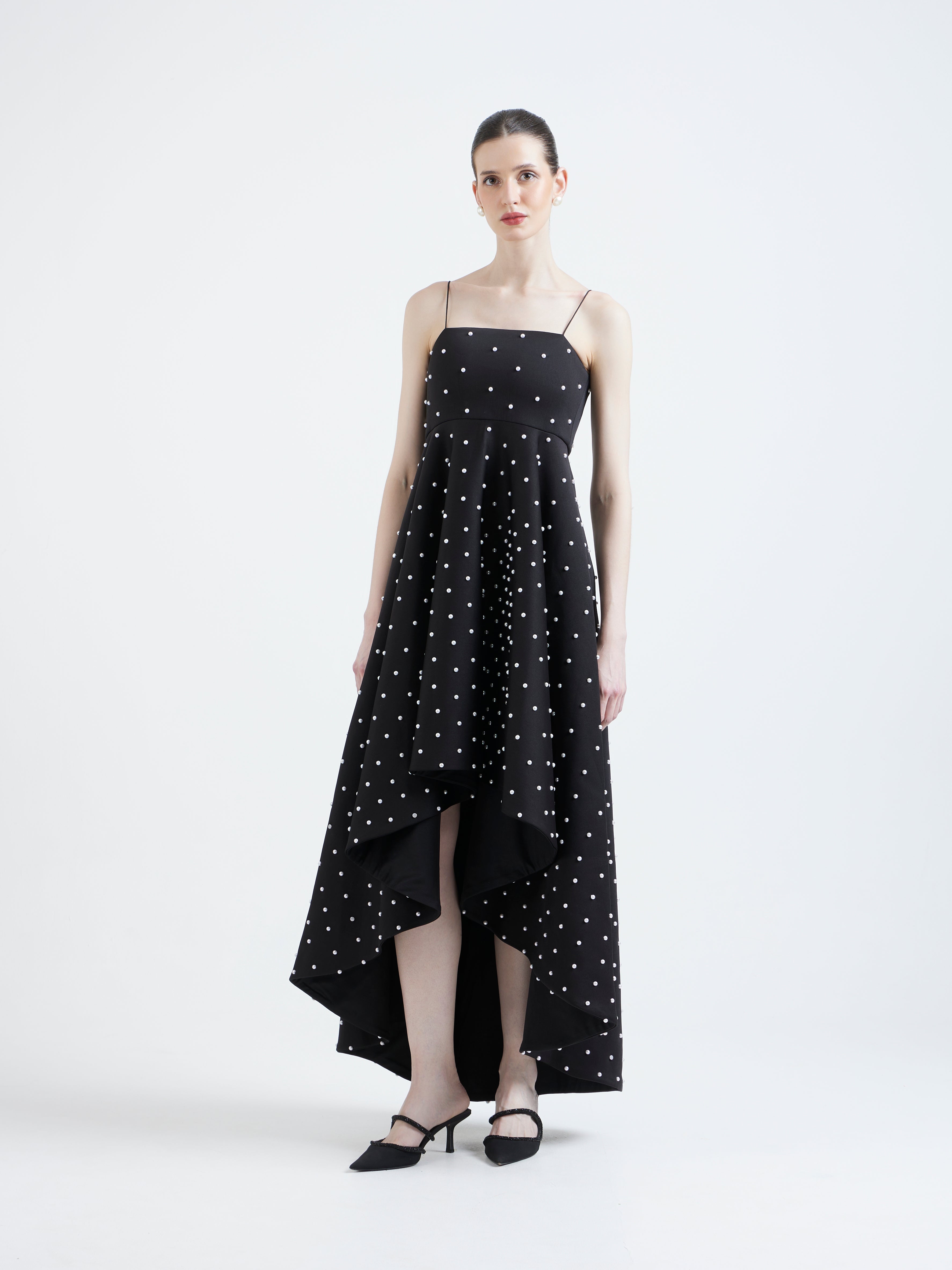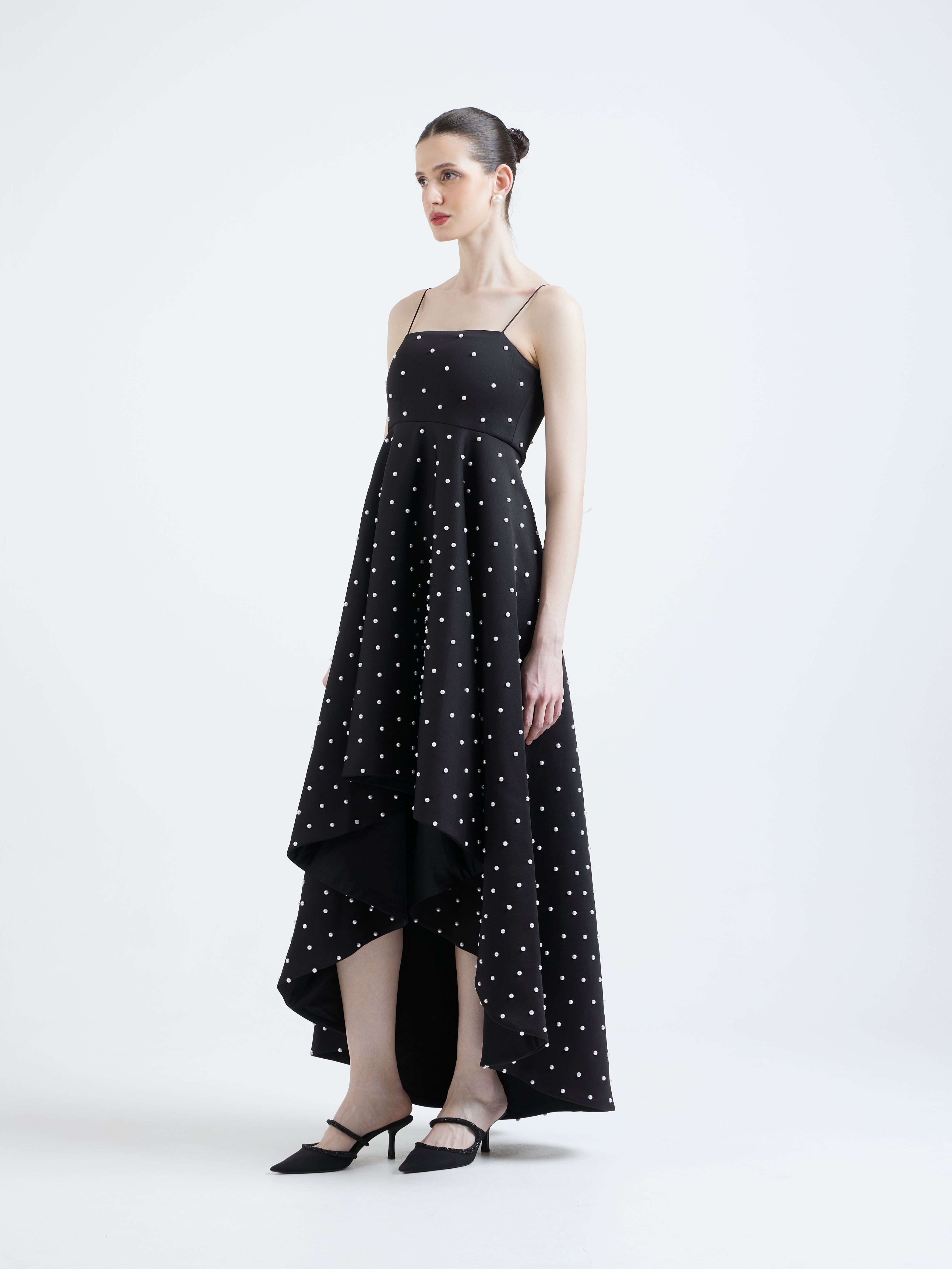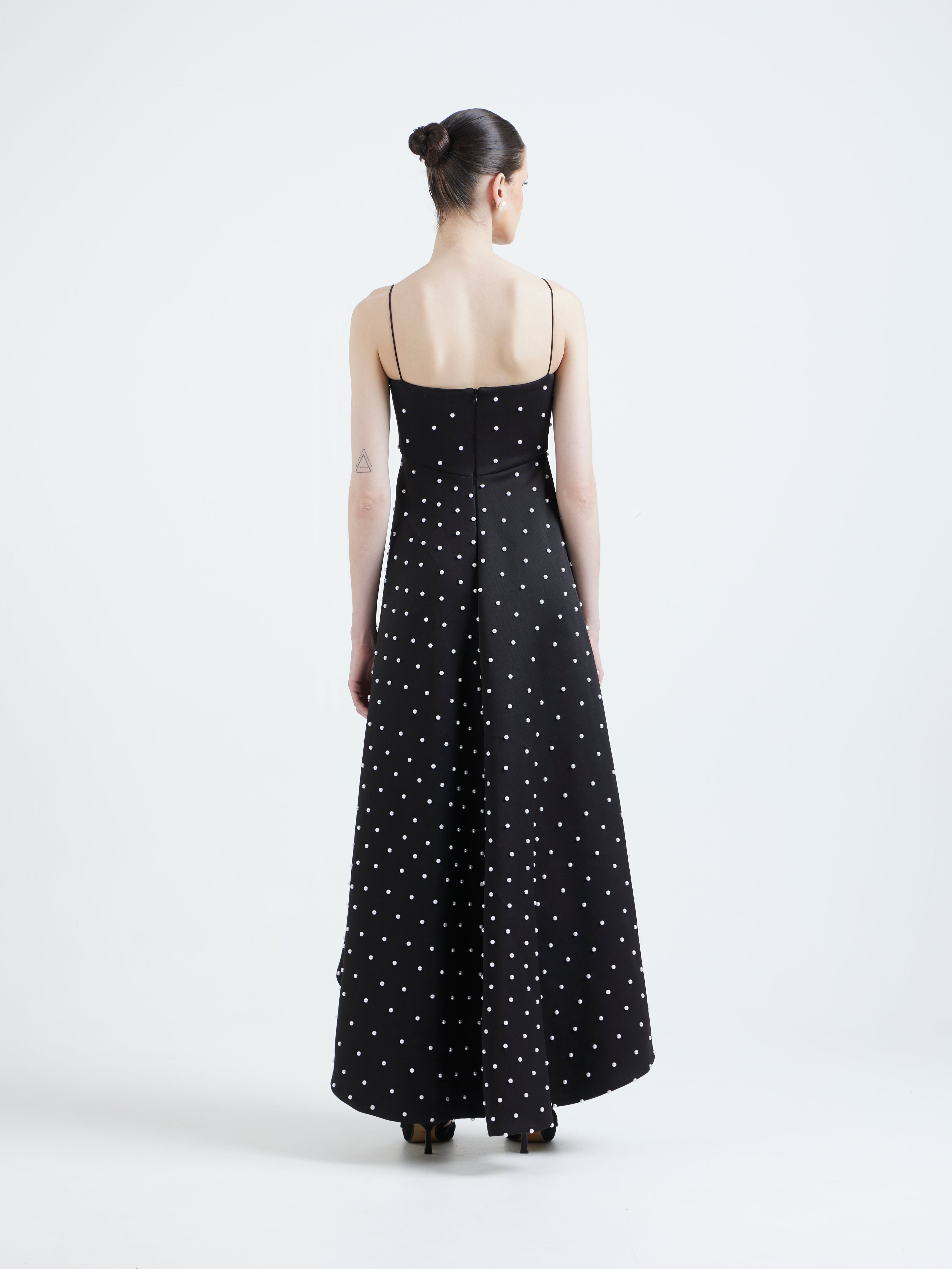 A modern classic reimagined, this sculpted neoprene dress is adorned with delicate, hand embroidered pearls that trace the entire silhouette, adding a soft luminosity to its bold shape and an appearance of soft, three dimensional polka dots.