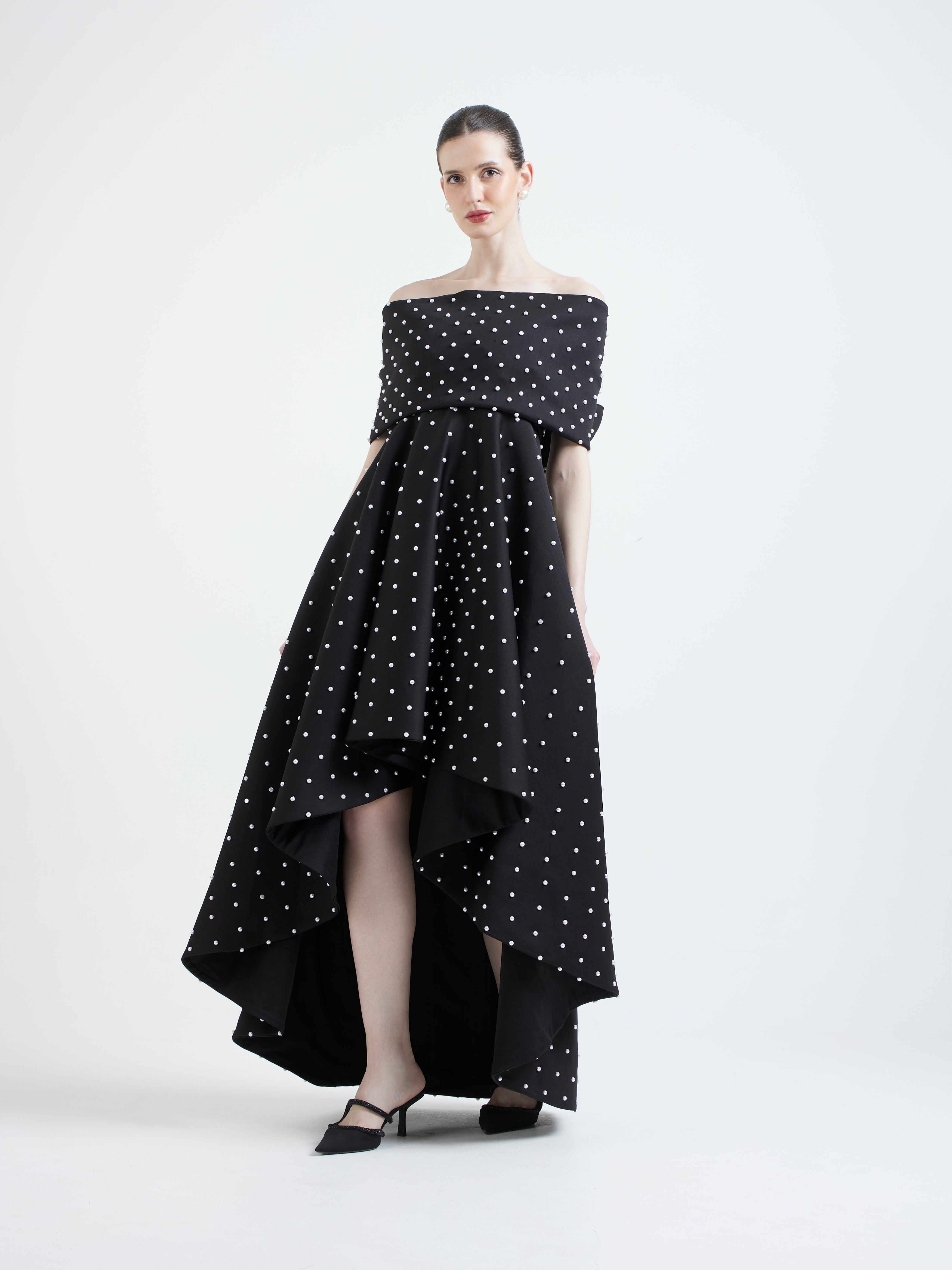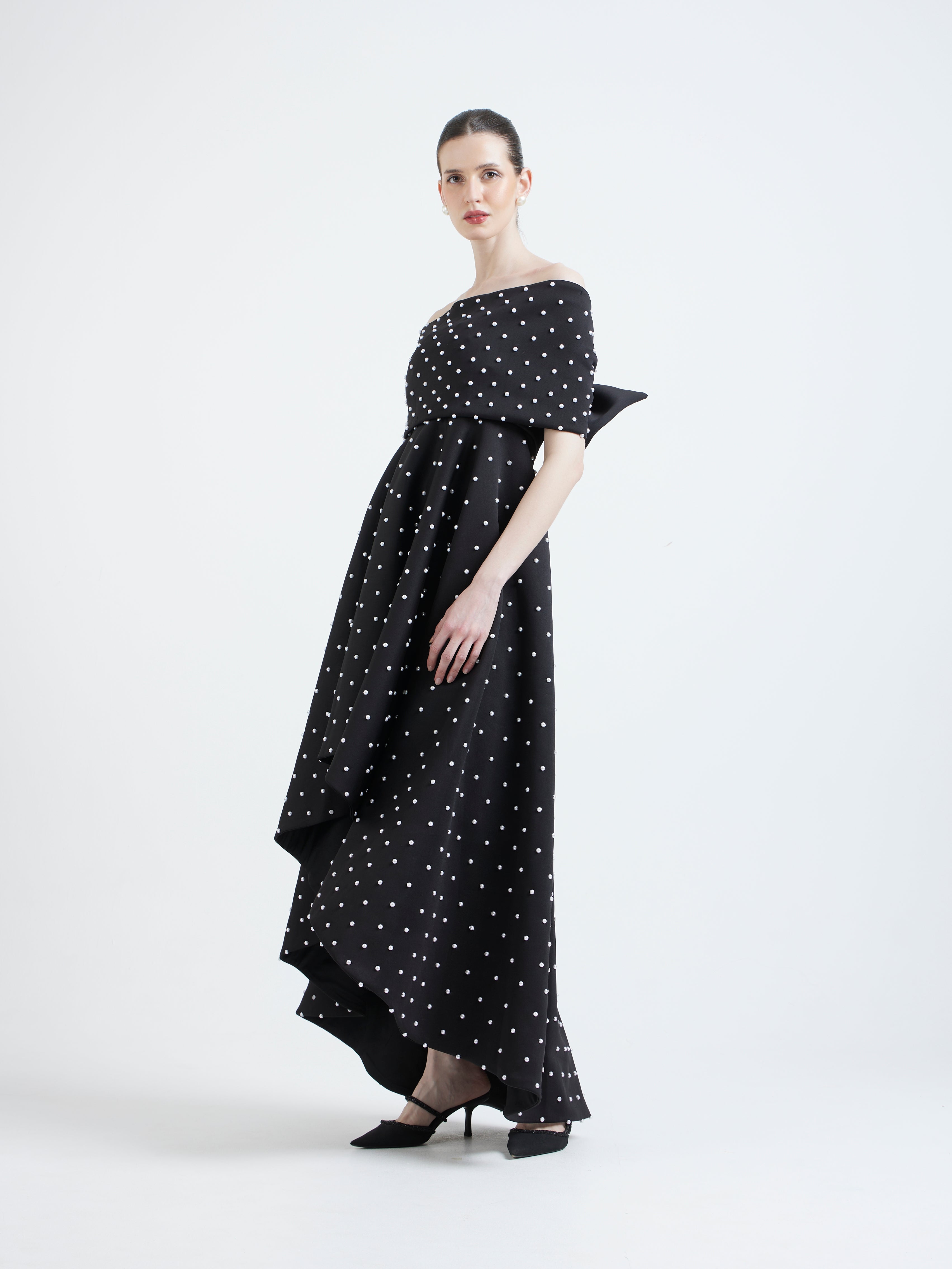 The off-shoulder neckline is paired with a detachable bow wrap, crafted in the same fabric, with embroidered pearls, giving you the freedom to shift from understated elegance to statement drama in seconds.