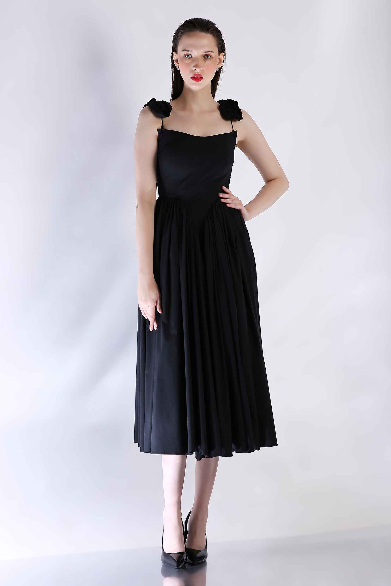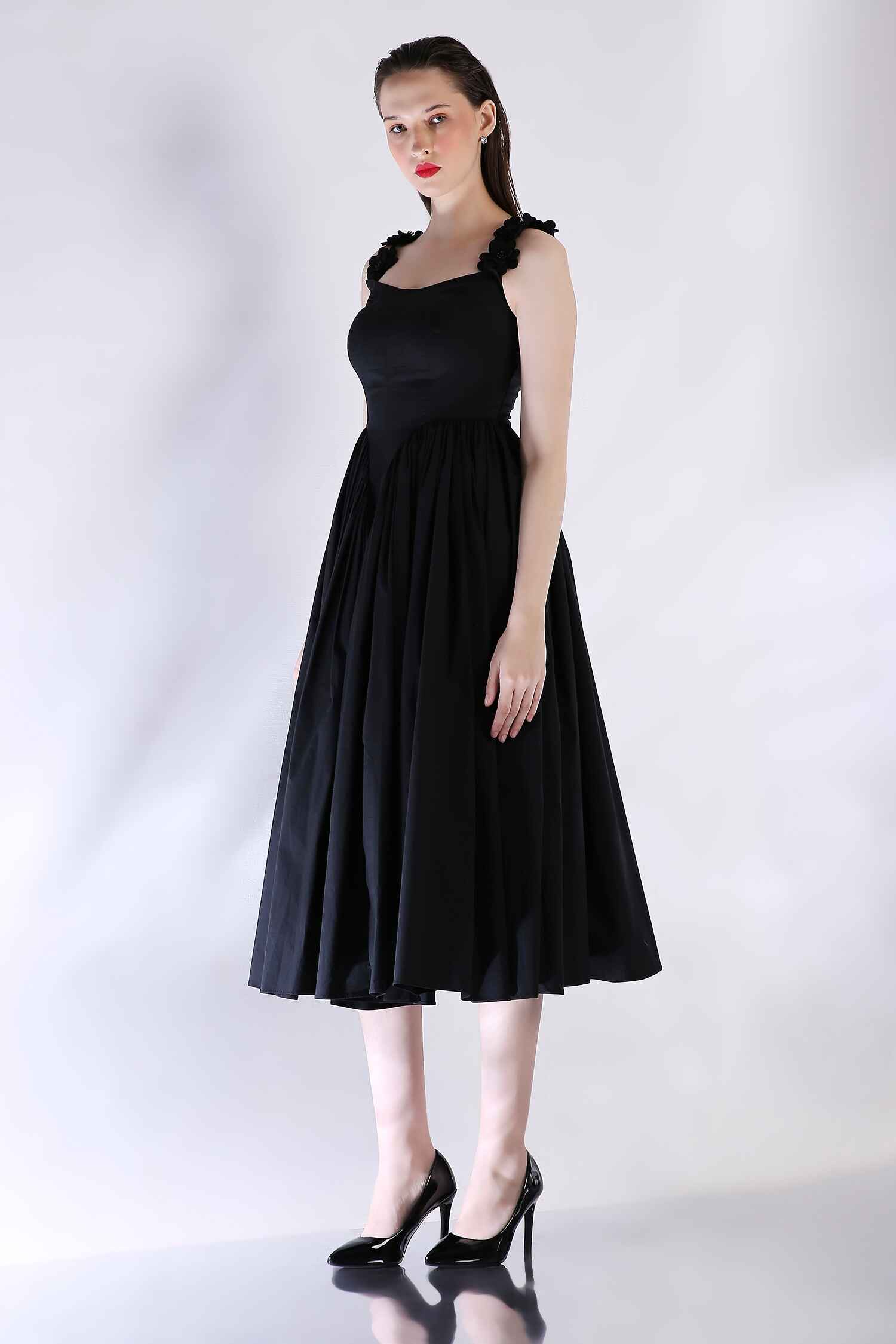 Embrace effortless elegance with our black mid-calf length dress, featuring delicate detachable straps and a gathered waistline for a flattering fit. This timeless silhouette flows gracefully, making it a versatile piece perfect for any occasion.