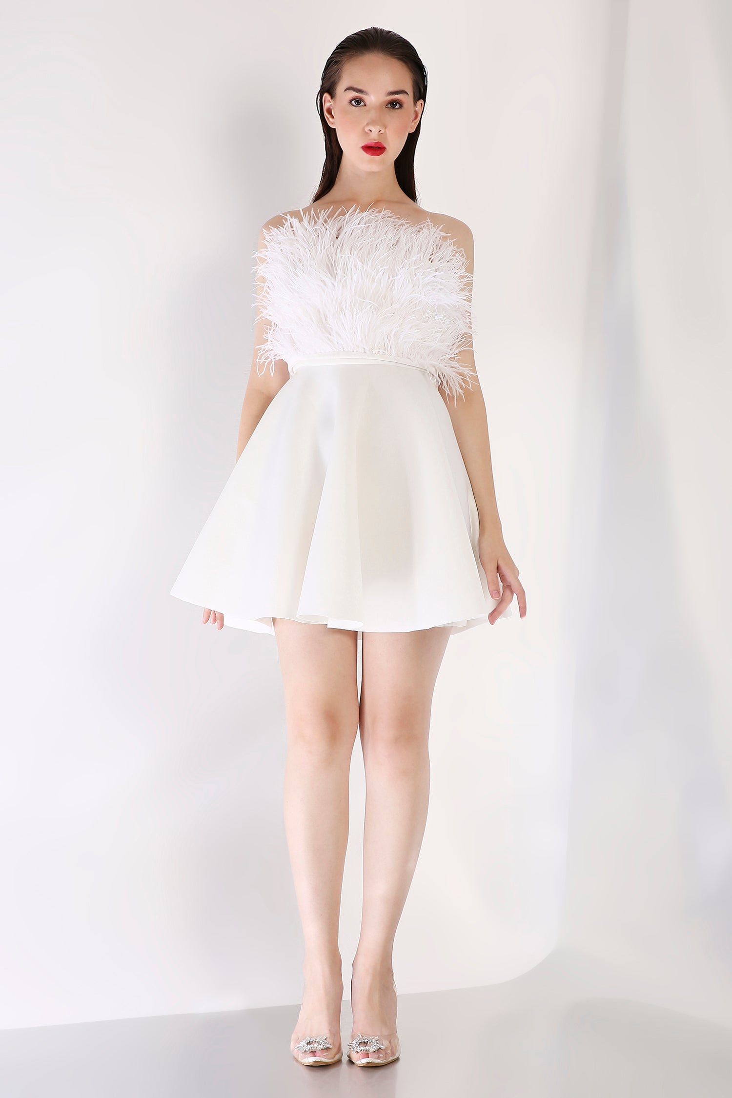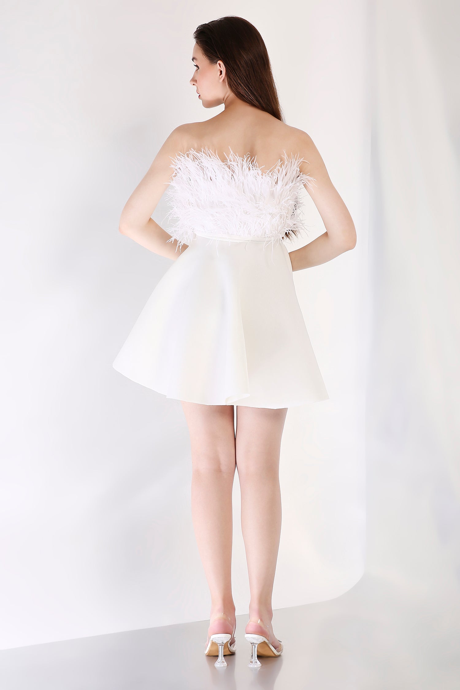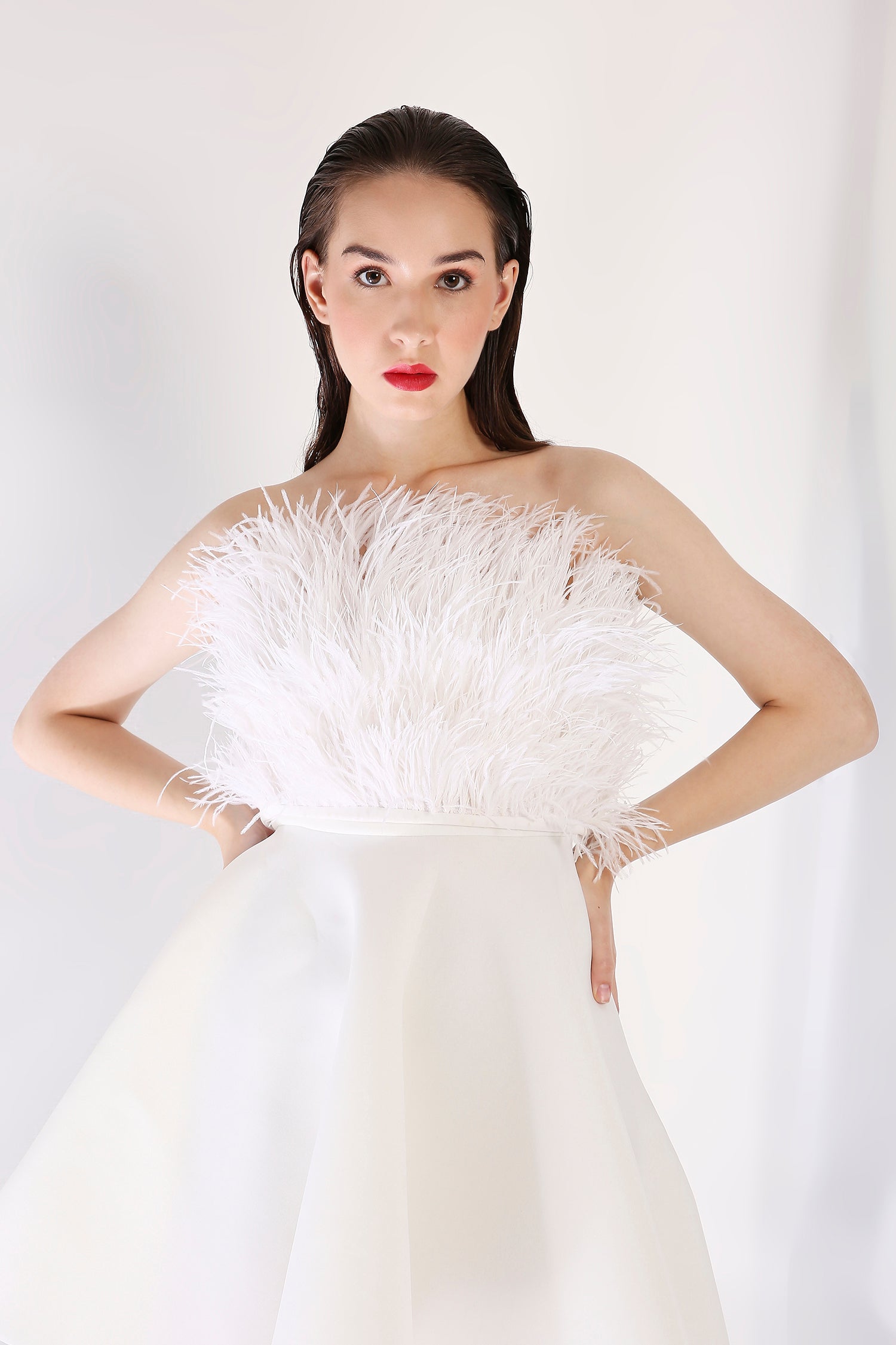 A fusion of timeless elegance and playful texture, this strapless fit-and-flare short dress is paired with a feather wrap worn as a tube. The ethereal detailing adds a soft, romantic touch to this sophisticated silhouette.