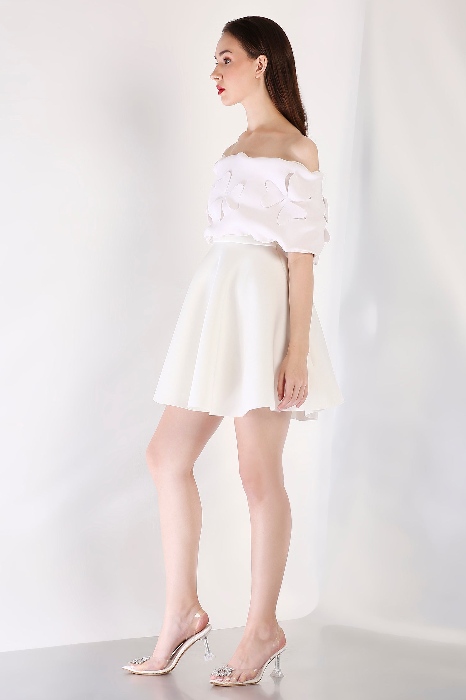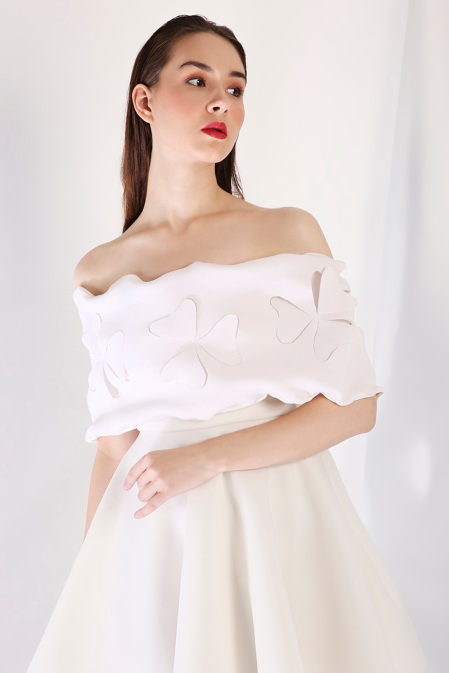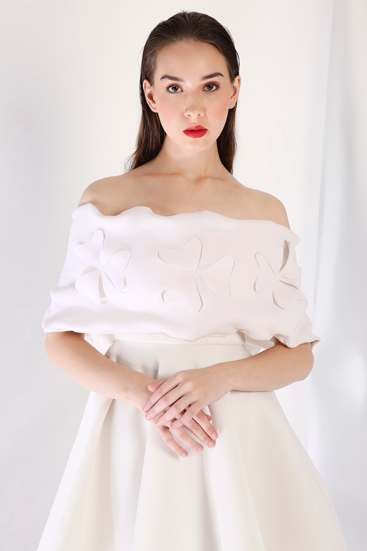Sleek and sophisticated, this strapless fit-and-flare short dress is enhanced by a lyre cutout wrap. With the option to wear it one-shoulder or off-shoulder, this ensemble is a statement in modern elegance.