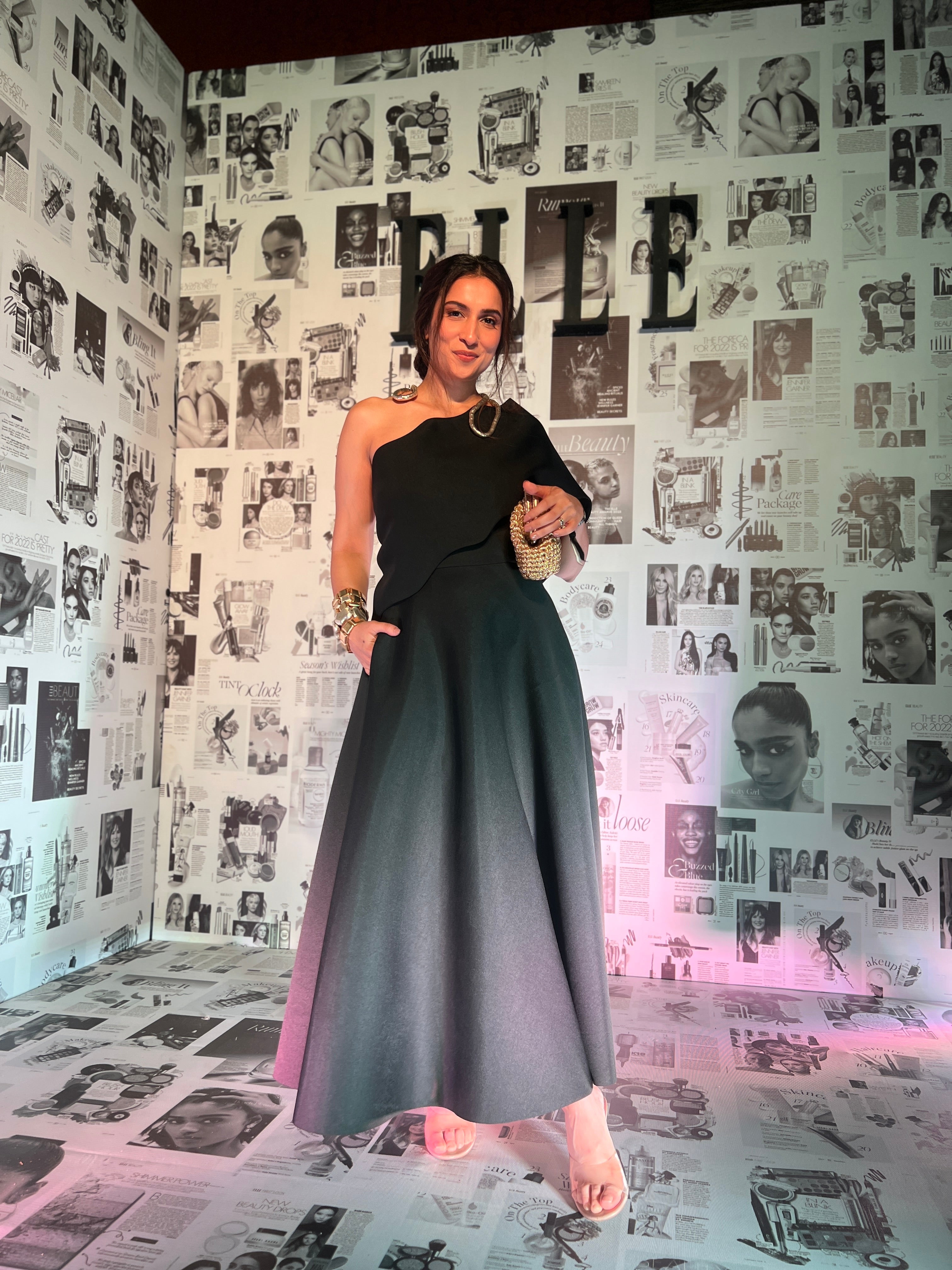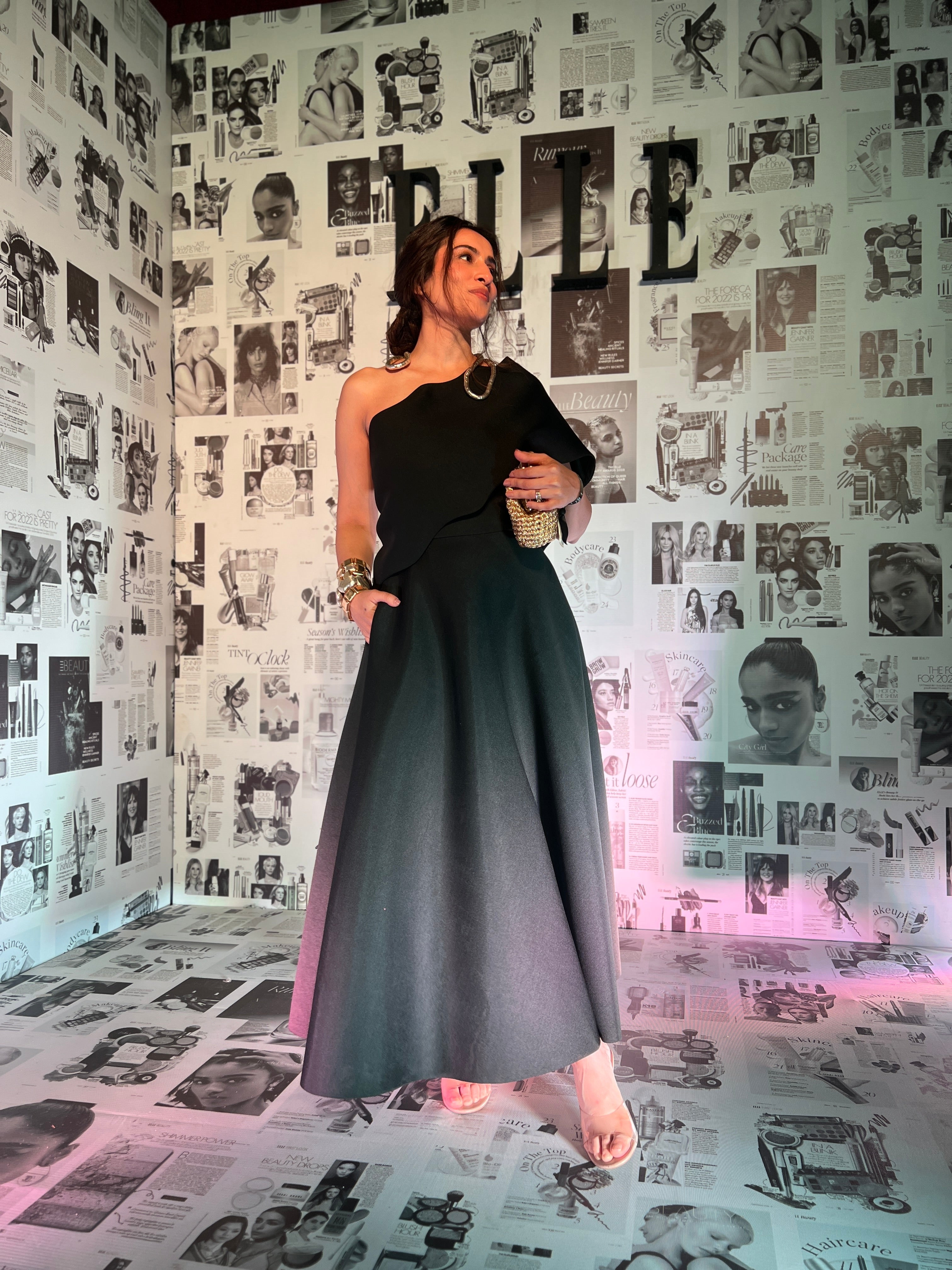 Featuring a strapless dress with our wavy overlay which can be worn off the shoulder or over one shoulder.